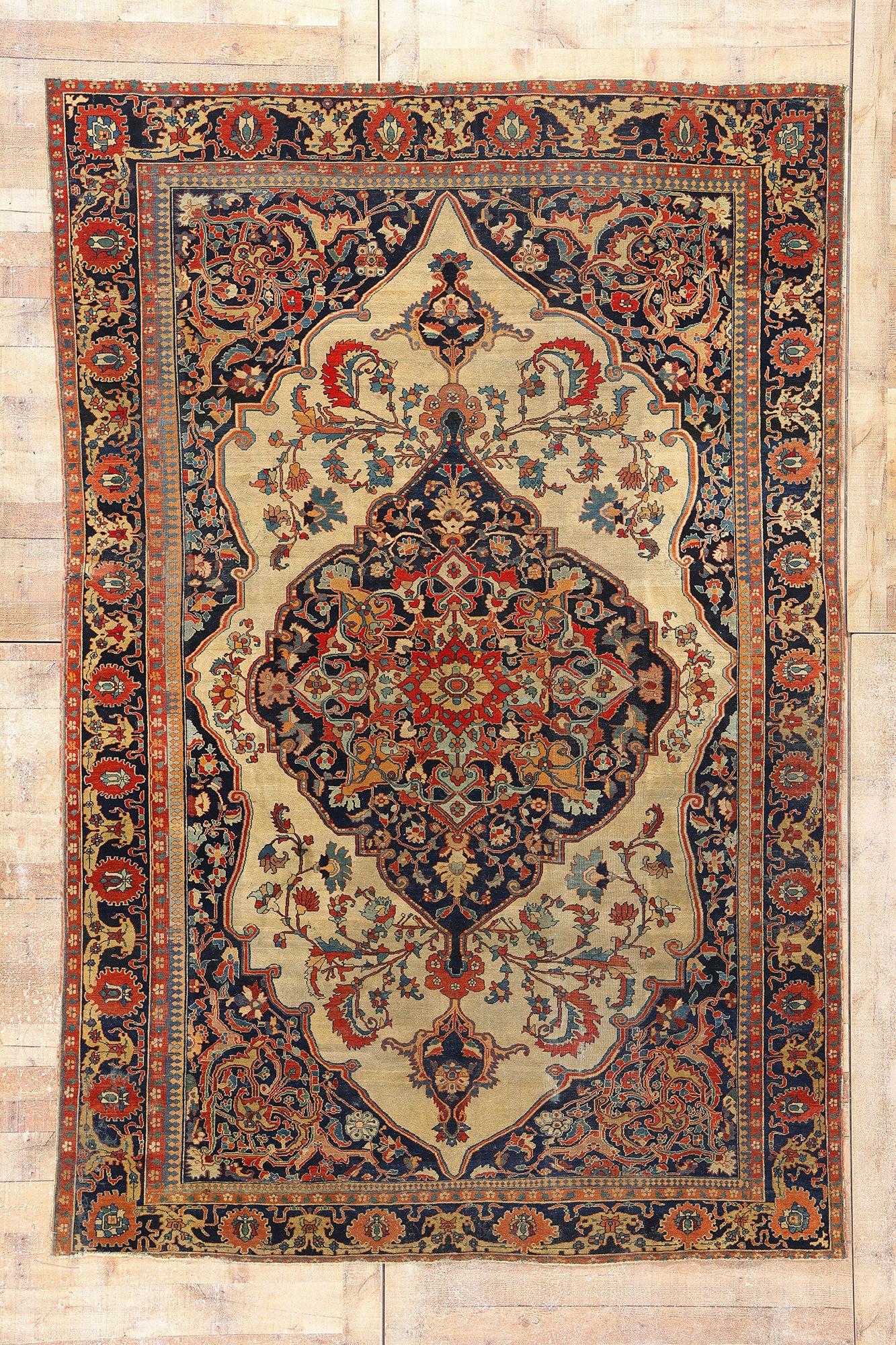 With its precise knotting, lyrical composition, and time-softened hues, this antique Mohtasham Kashan rug is more than a textile; it is a woven chronicle of the Qajar era’s golden age of design. A silent witness to a bygone world of master weavers, courtiers, and calligraphers, this rug brings with it the dignity of history and the soft grandeur of Persian romanticism, transforming any interior into a space touched by the eternal grace of timeless craftsmanship.