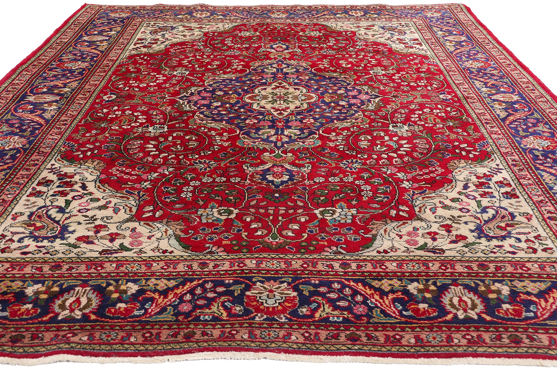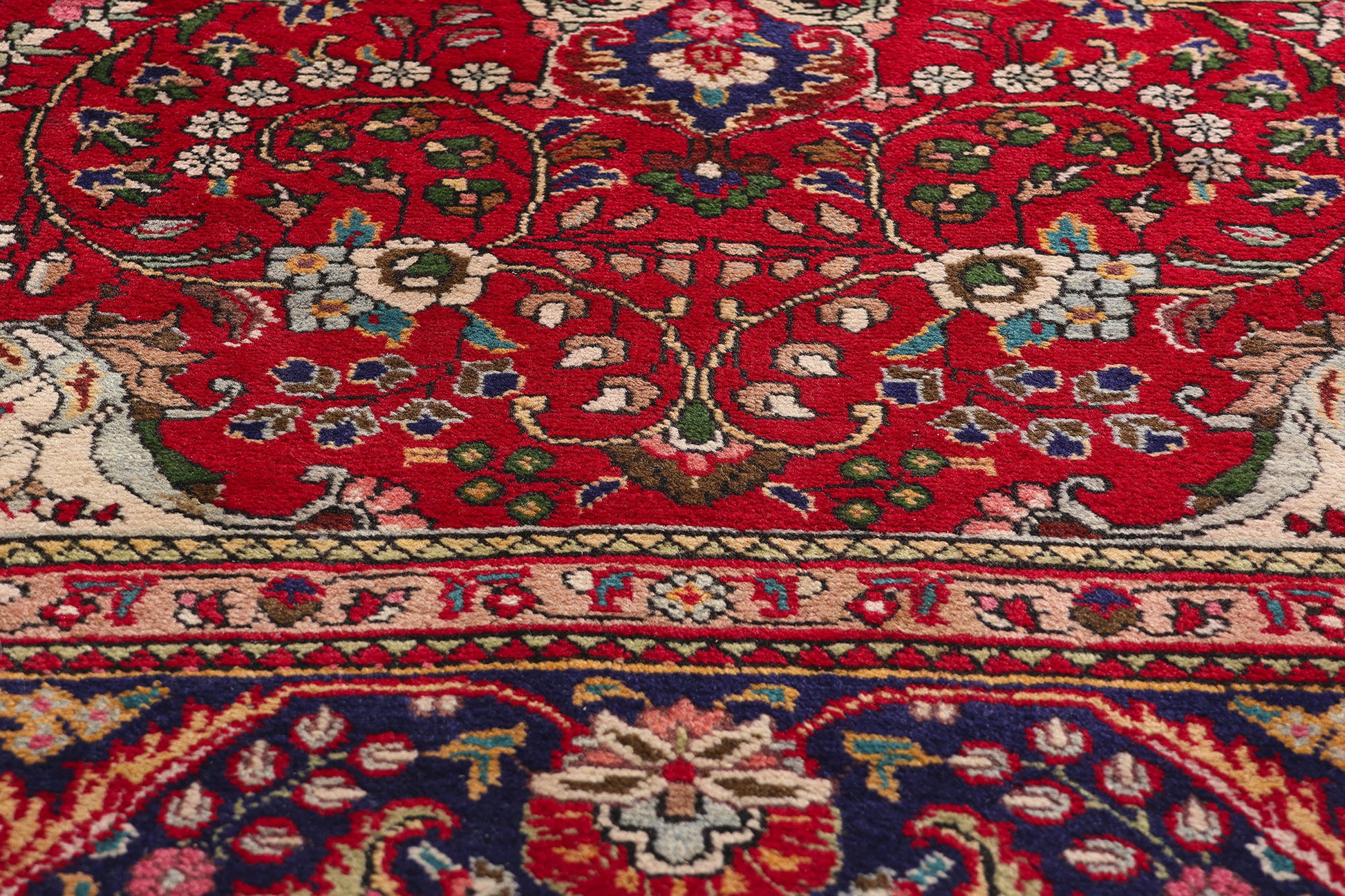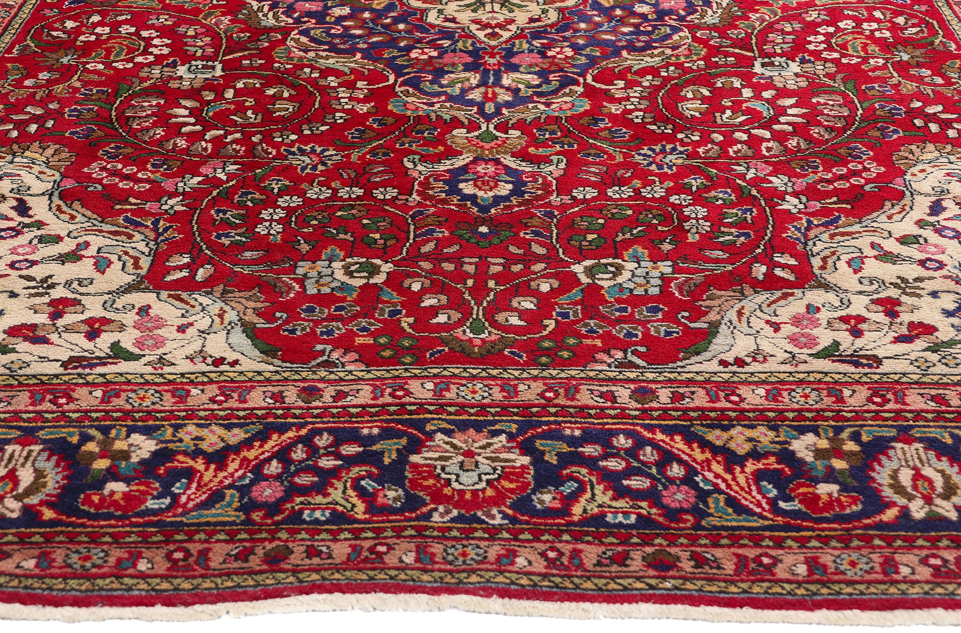 This hand knotted wool vintage Persian Tabriz rug is a masterpiece of traditional craftsmanship, its design a vivid depiction of timeless elegance and intricate detail. At its heart lies a striking navy blue cusped central medallion, meticulously detailed with blooming palmette pendants at either end, each elegantly outlined with acanthus swags. This prominent medallion serves as the visual and symbolic centerpiece of the rug, symbolizing the unity and harmony that is so prized in Persian culture. The medallion is set against a vibrant red field, alive with an allover pattern of delicate florals and botanical formations. These elements intertwine with swirling arabesque vinery, creating a dynamic dance of color and form that captivates and delights the observer.