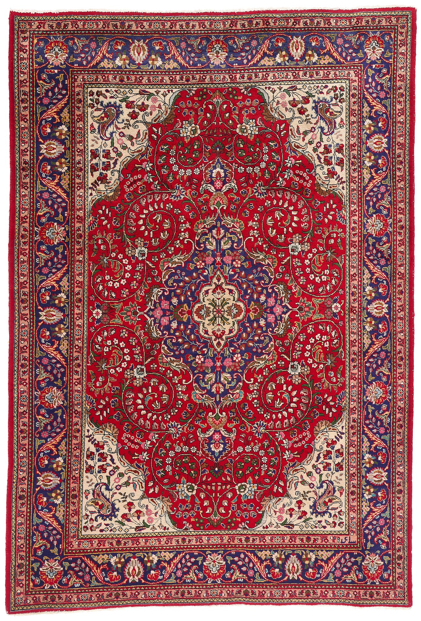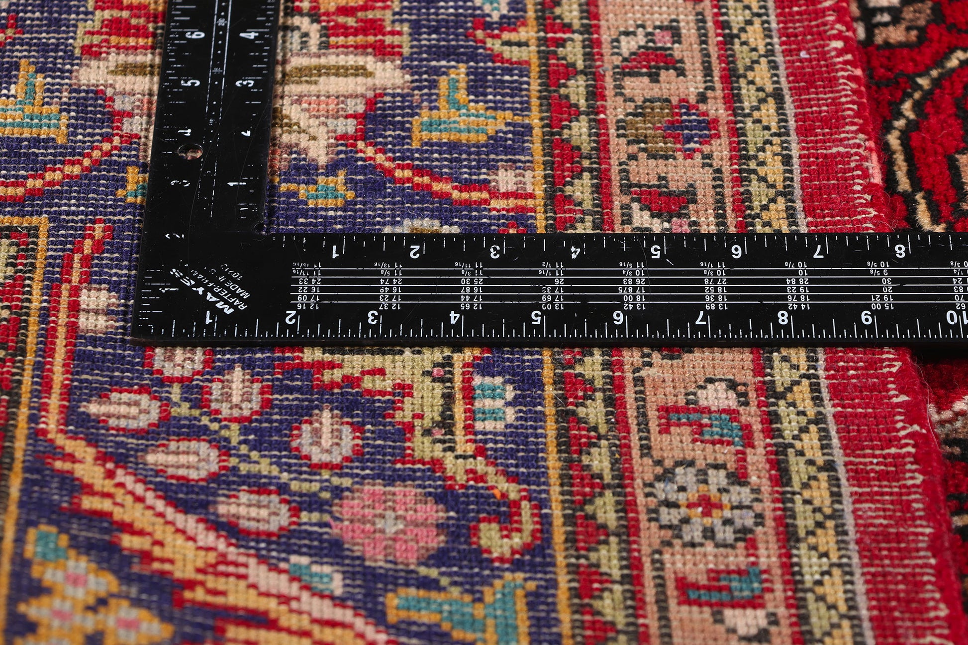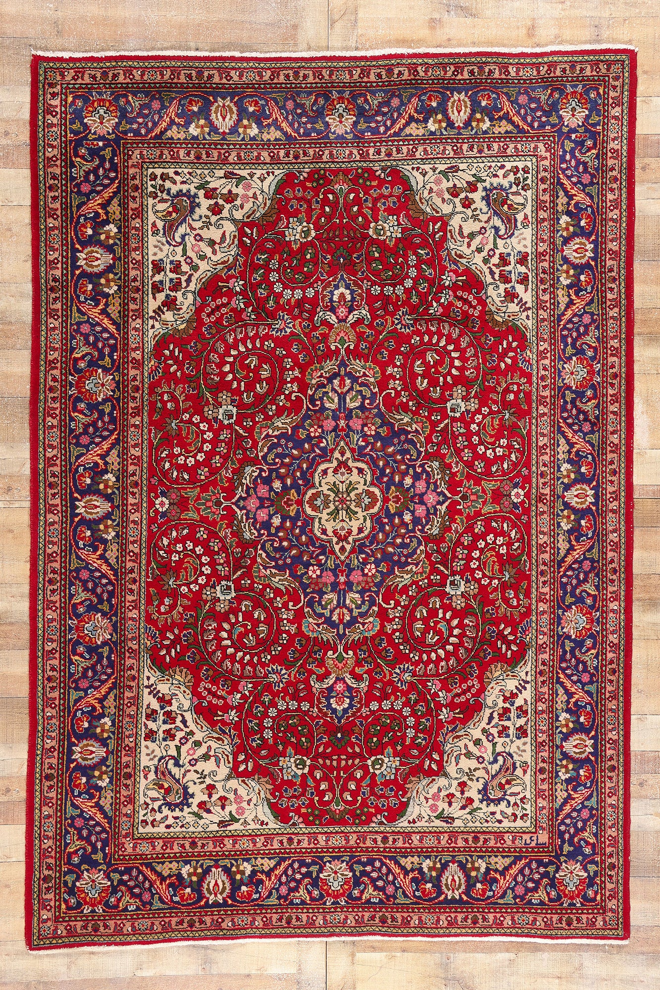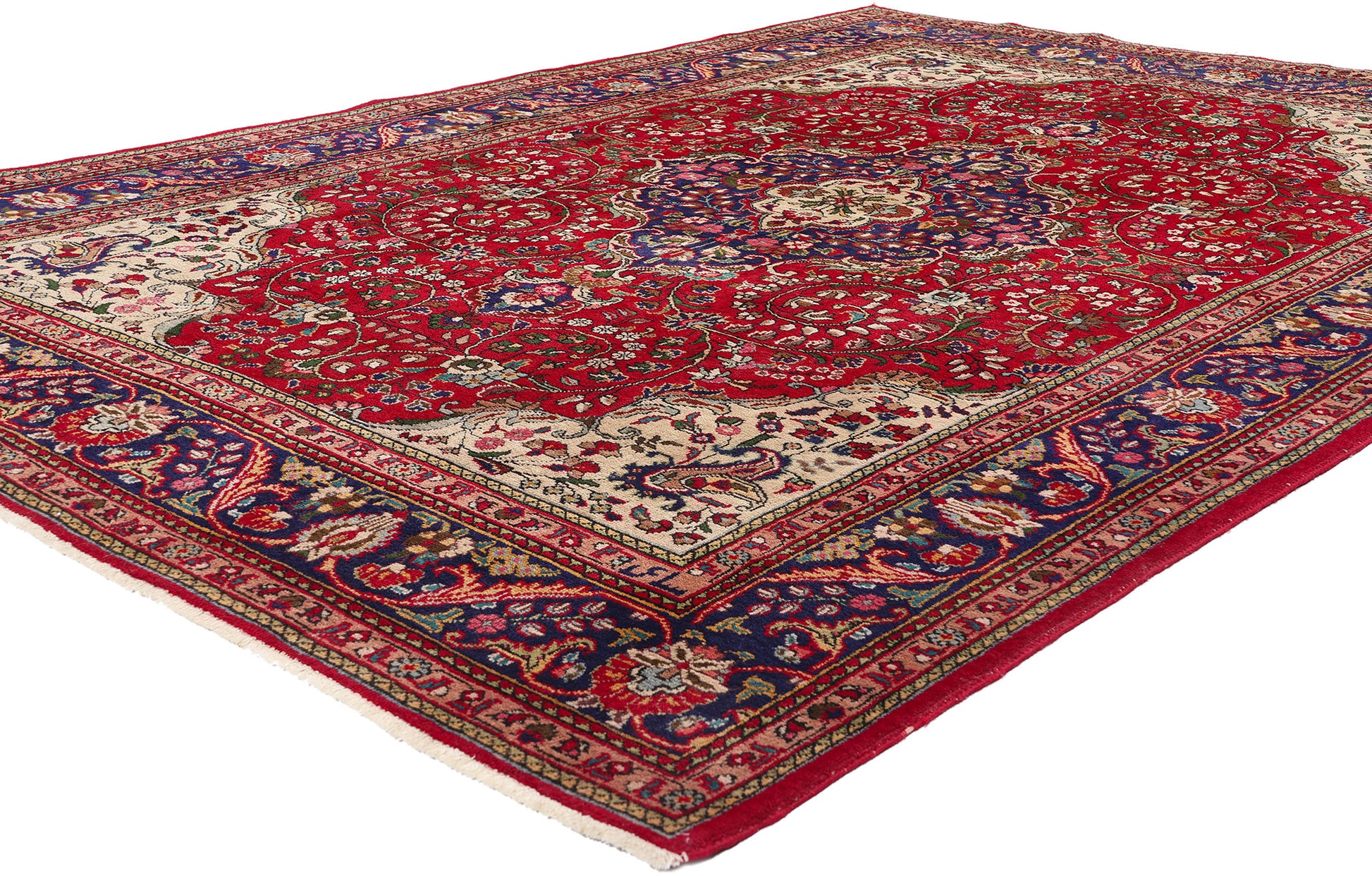 This hand knotted wool vintage Persian Tabriz rug is a masterpiece of traditional craftsmanship, its design a vivid depiction of timeless elegance and intricate detail. At its heart lies a striking navy blue cusped central medallion, meticulously detailed with blooming palmette pendants at either end, each elegantly outlined with acanthus swags. This prominent medallion serves as the visual and symbolic centerpiece of the rug, symbolizing the unity and harmony that is so prized in Persian culture. The medallion is set against a vibrant red field, alive with an allover pattern of delicate florals and botanical formations. These elements intertwine with swirling arabesque vinery, creating a dynamic dance of color and form that captivates and delights the observer.