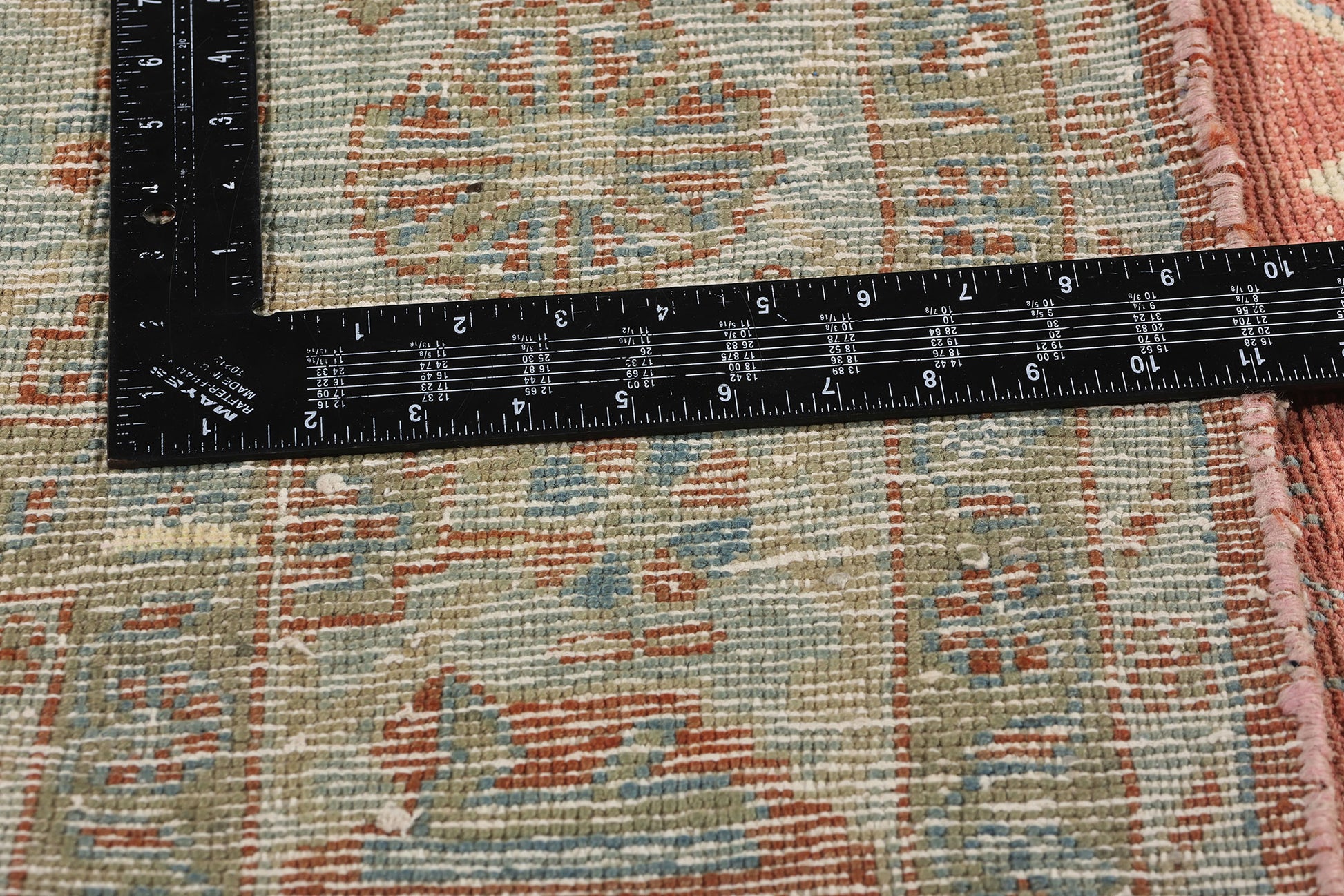 The corner spandrels, in a serene sky blue, are further ornamented with a cross motif, flaming boteh, eight-point stars, rosettes, and more protection amulets. These designs stretch along the sides, forming an inner frame of ziggurats, tree of life motifs, and scorpion symbols. These symbols not only add visual balance but also imbue the distressed Viss rug with an aura of sacred energy, symbolizing protection, growth, and continuity. This detailed inner frame enhances the overall composition, providing depth and structure to the design, while contributing to the harmonious balance between spirituality and artistry.