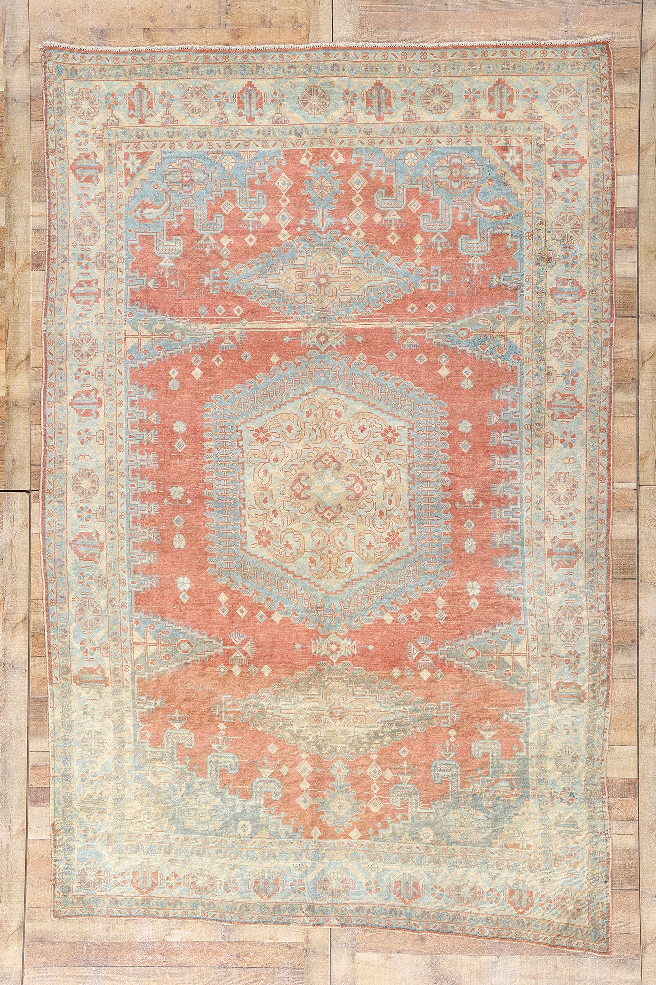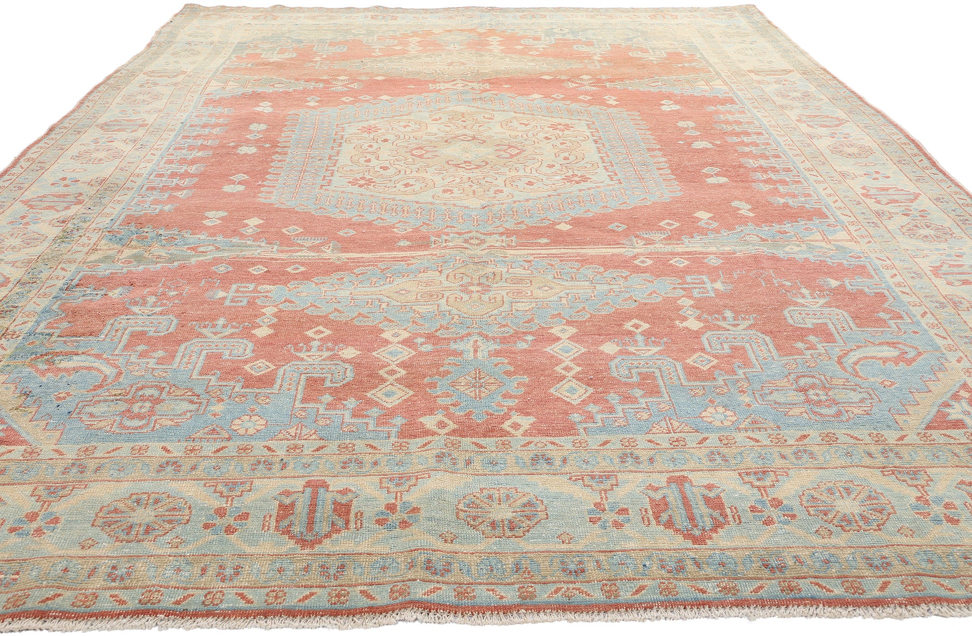 This hand-knotted wool distressed vintage Persian Viss rug effortlessly combines tribal enchantment with laid-back luxury, thanks to its soft, antique-wash finish that imbues the piece with a weathered finesse, while preserving its timeless beauty. The richly striated red field serves as a captivating backdrop, enhancing the subtle sophistication of the design. At the center, a hooked hexagonal medallion is anchored by hooked cross pendants at either end, drawing attention with its geometric precision. Inside the medallion, Ram's Horn motifs symbolize strength and fertility, surrounded by curved sickle leaves, stylized florals, and delicate foliage, all of which evoke a deep connection to nature and the cycle of life.