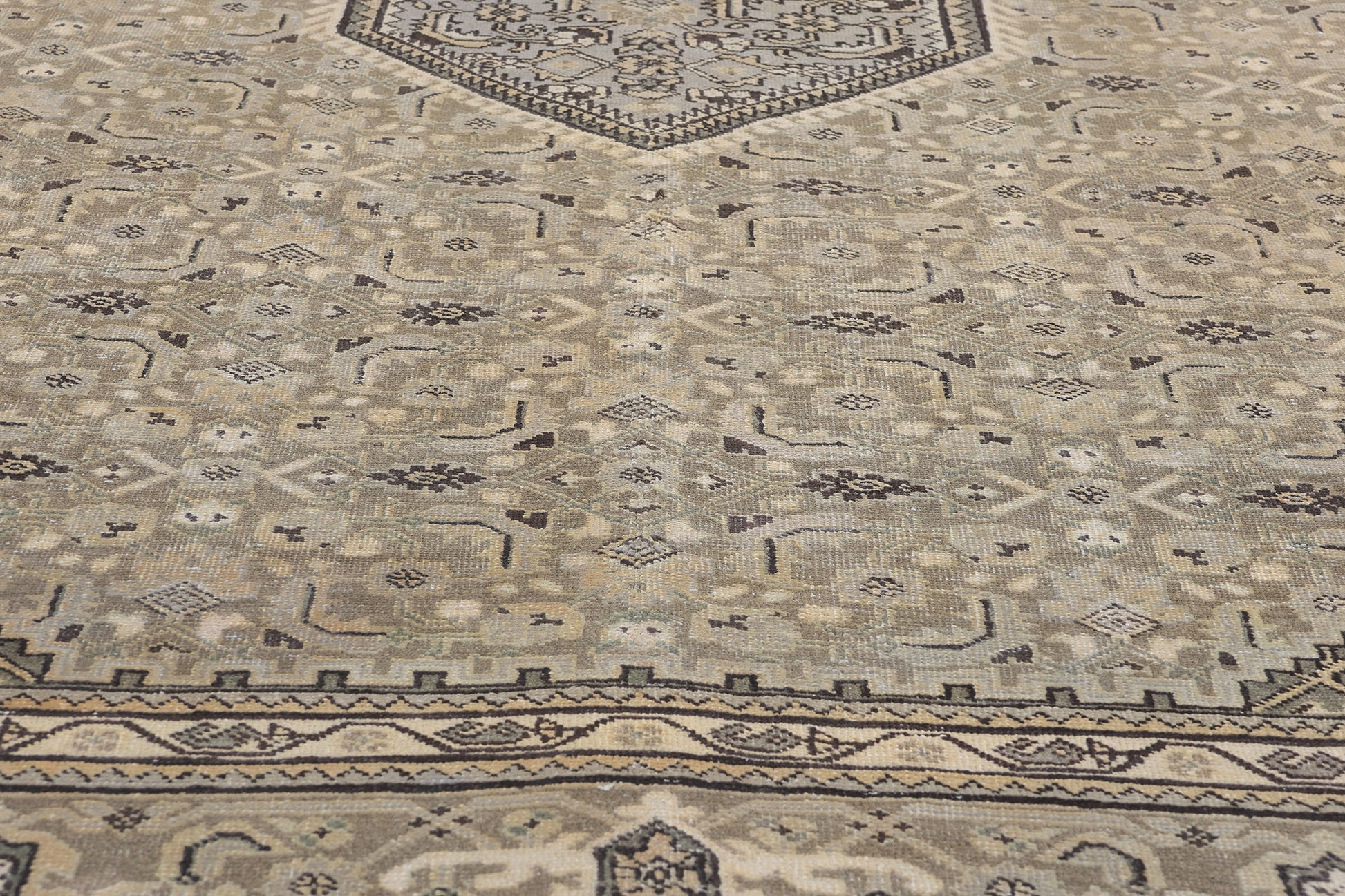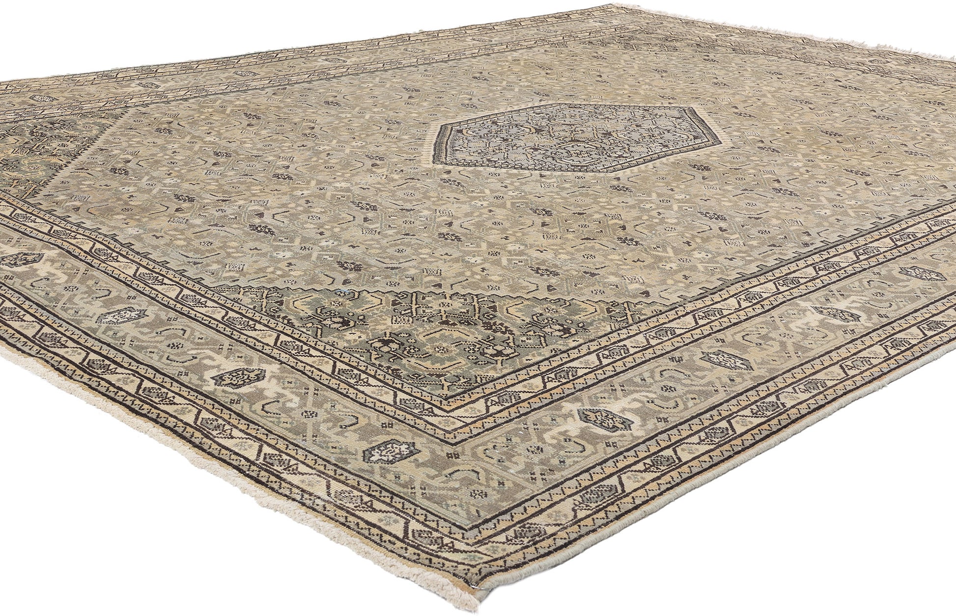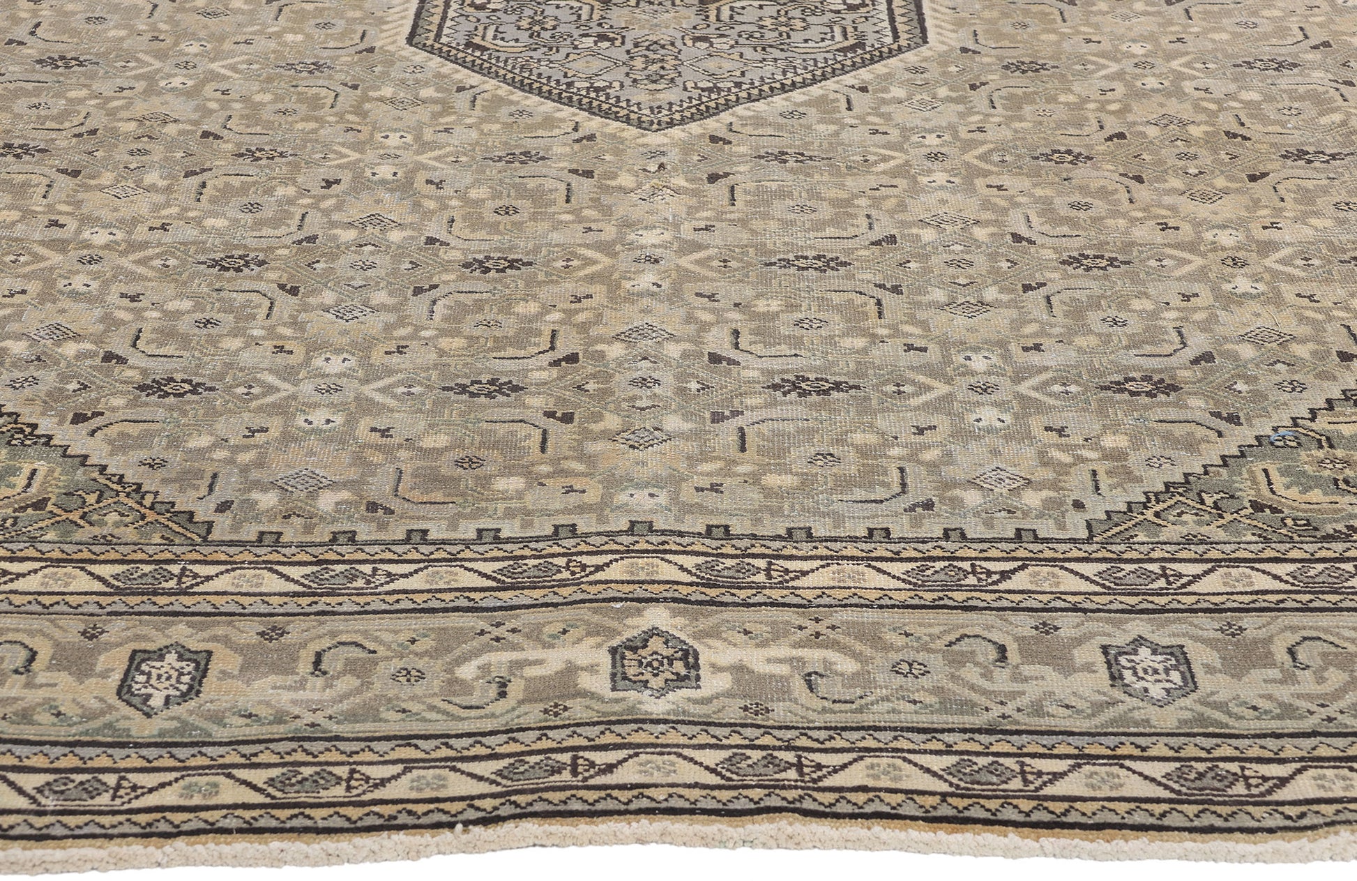 Framing the central design is a classic turtle vine scroll border, a symbol of longevity and prosperity, which is flanked by both inner and outer meander boteh guard bands. These additional borders, along with the subsidiary sawtooth guard stripes, enhance the overall structure of this Persian masterpiece, further elevating its visual appeal. With its combination of elegance, intricate details, and historical depth, this vintage Ardabil rug serves as both a functional piece and a work of art, adding warmth and character to any space it graces.