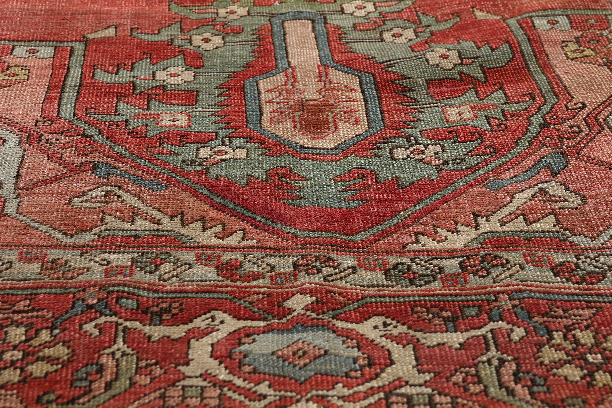 The rare light green field elevates this Serapi into exceptional territory—an uncommon and highly coveted ground that enhances the sculptural quality of the design. Rectilinear vines and stylized botanical elements move confidently across the surface, their angular articulation lending a distinctly architectural cadence. Rose and light green corner spandrels bloom with foliage and floral motifs, gently framing the central composition while preserving its monumental clarity.