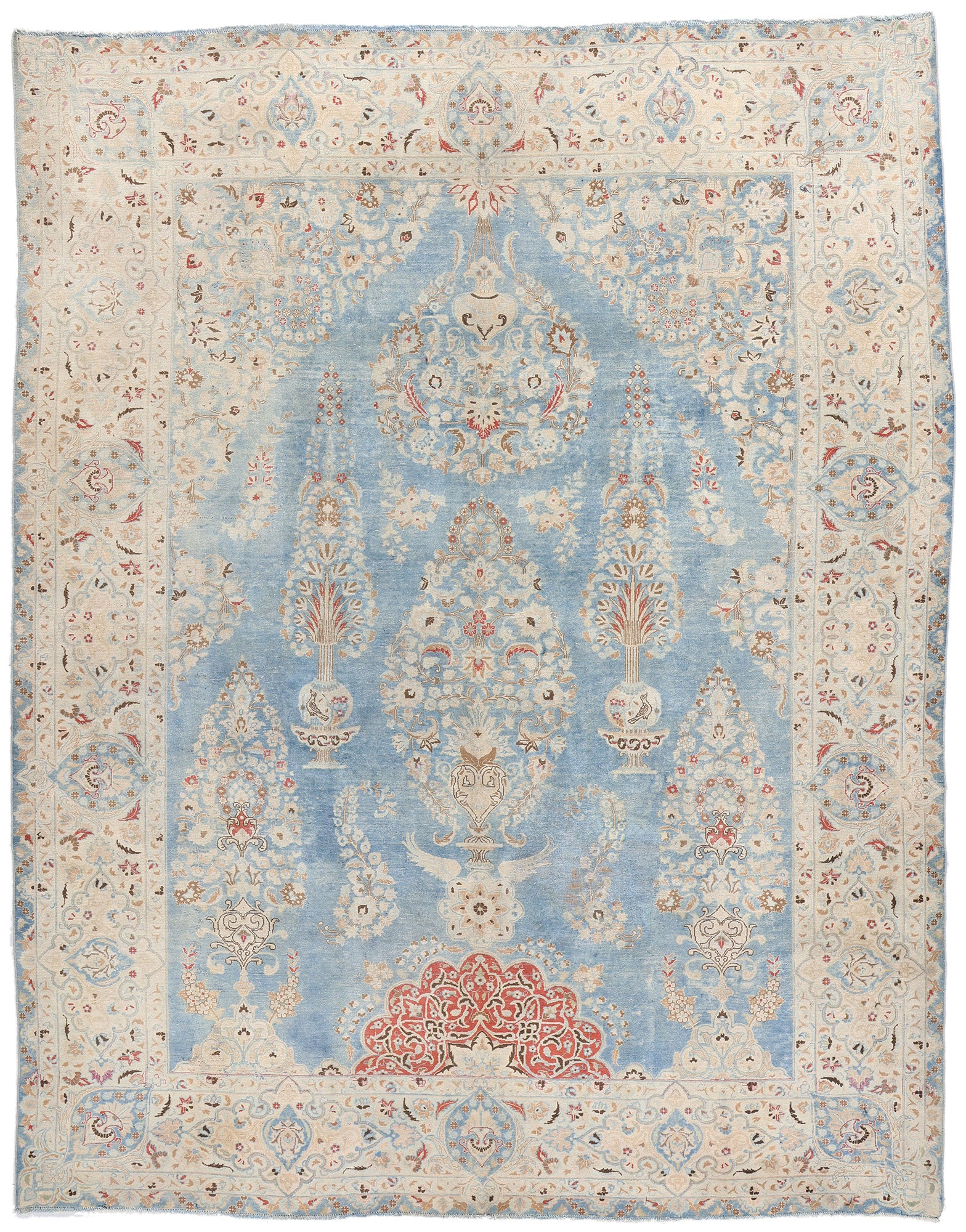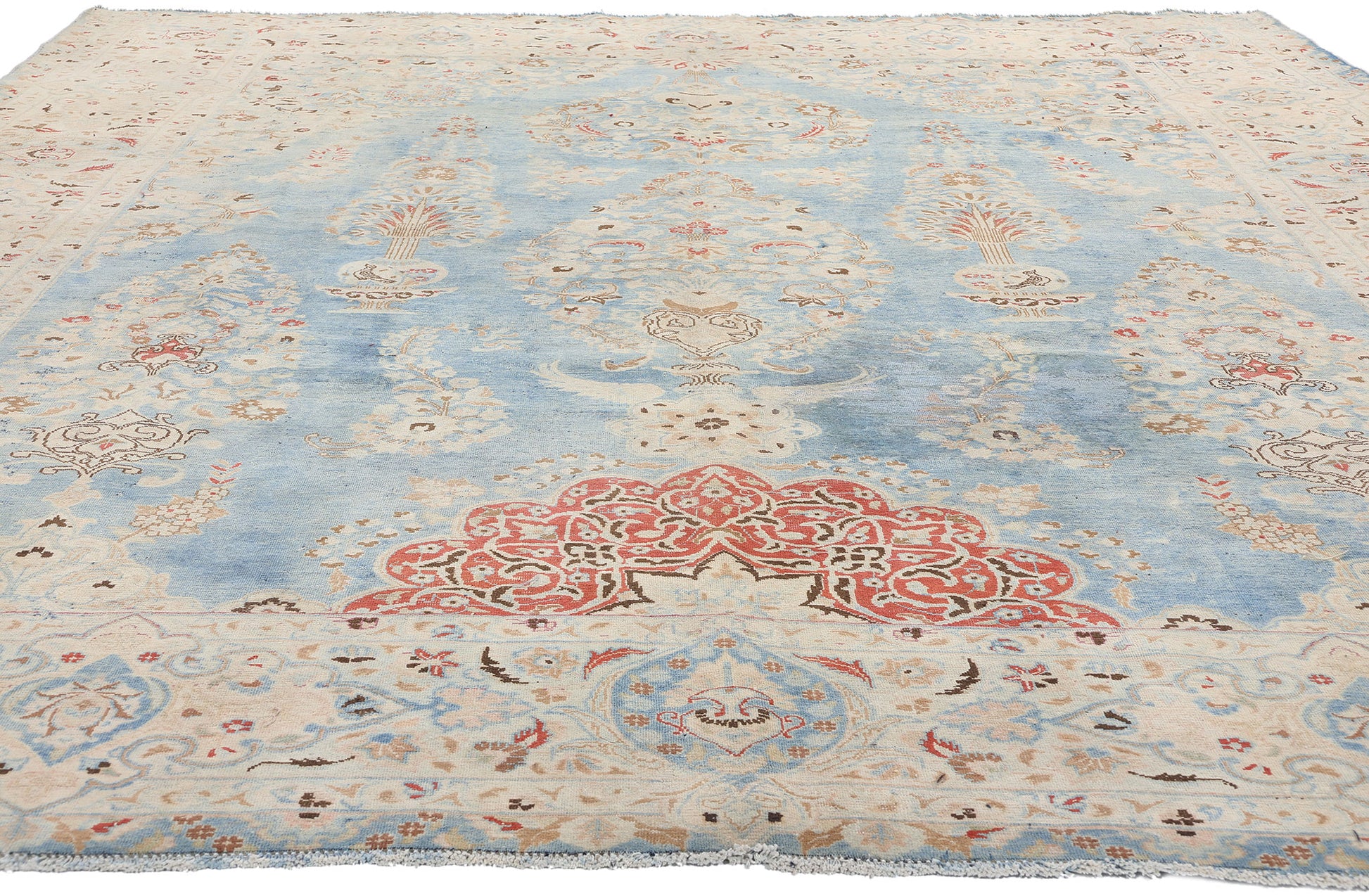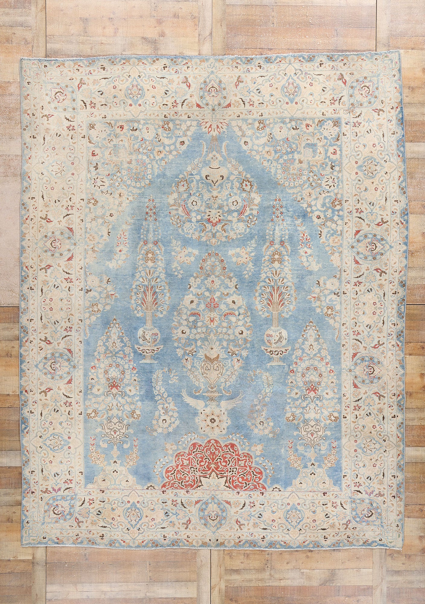 This hand-knotted wool antique Persian Mashhad rug is a captivating representation of classic Persian artistry, distinguished by its elegant vase design and finely executed details. The distressed Mashhad rug features a directional layout that beautifully frames the central scene, where an ornamental vase levitates at the heart of the design, overflowing with blossoming boughs. Set against a serene sky blue backdrop, the vase becomes a focal point, radiating a sense of serenity and magic. Surrounding the vase, additional flowery tree boughs spring forth from bulbous jardiniere vases with pedestals, creating a dynamic and layered composition. The meticulous details of birds and roses etched on the vases further elevate the rug's visual allure, imbuing it with an exotic, yet inviting ambiance.