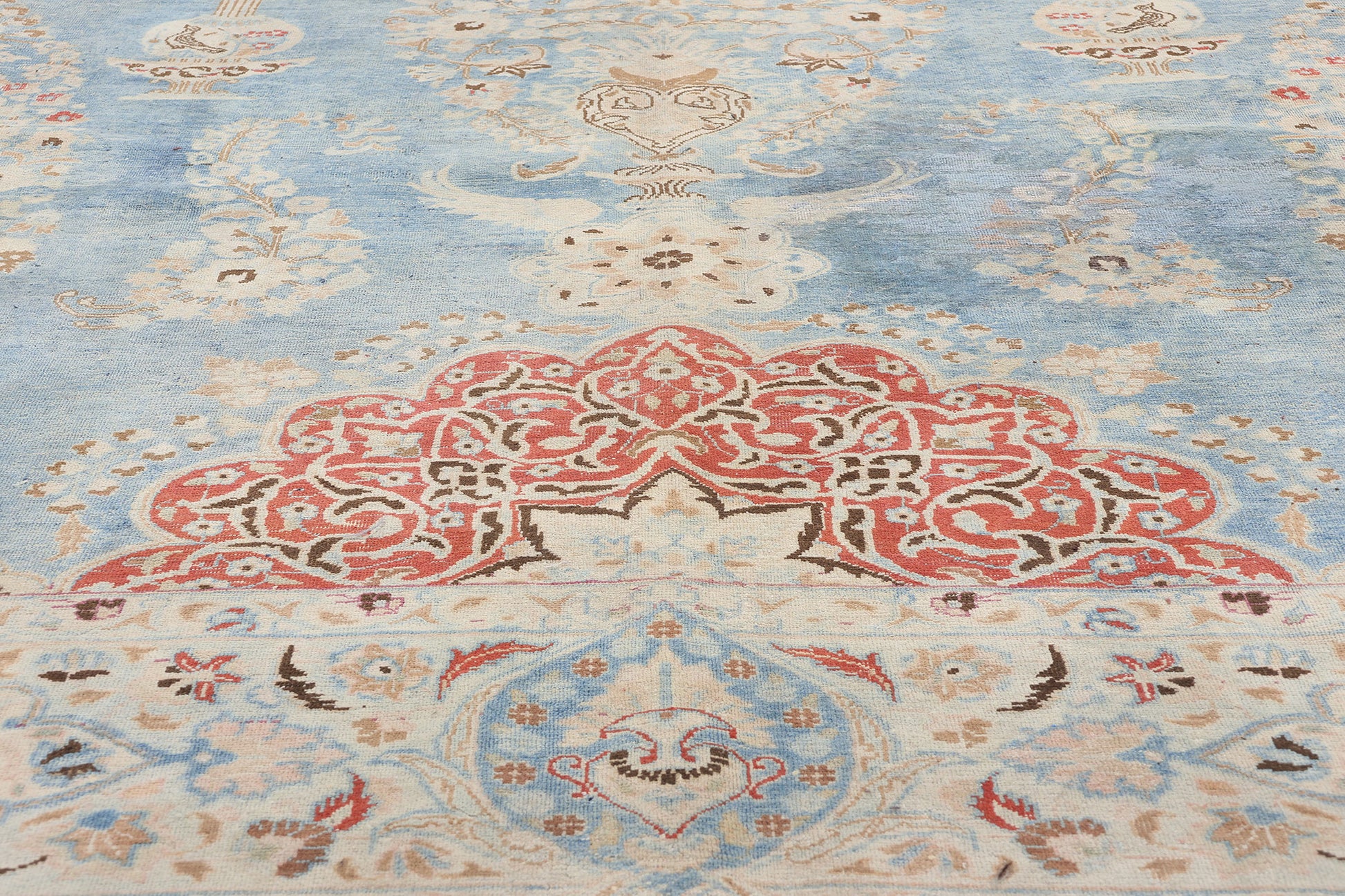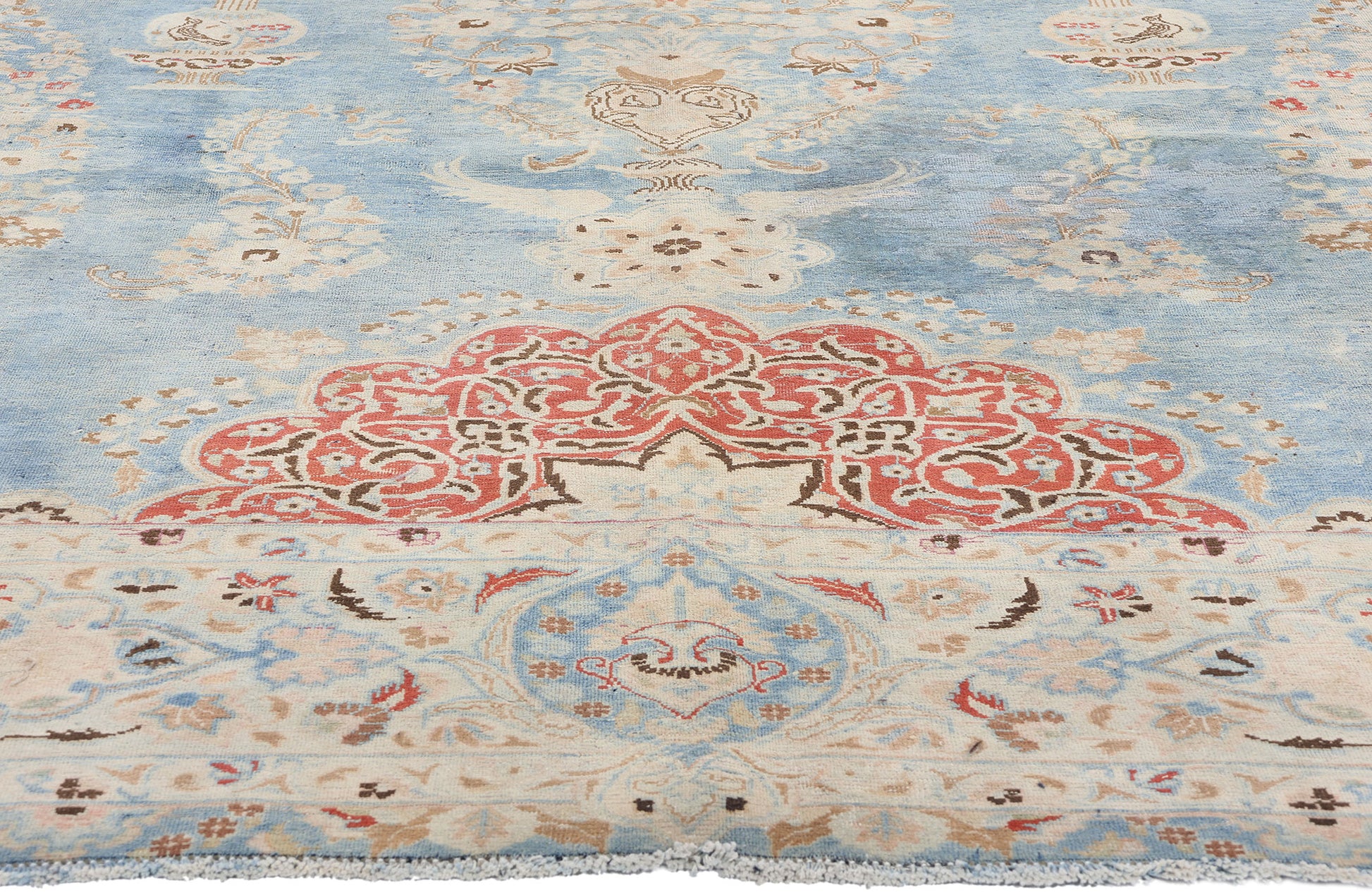 Elaborate corner spandrels echo the floral patterns within the field, creating a sense of harmony throughout the composition. A lively cusped red half-medallion planted at the bottom center provides a striking juxtaposition to the rest of the design, introducing a warm contrast against the cool tones of the central field. This combination of vibrant reds and soothing blues enhances the rug's dynamic visual appeal, making it a statement piece that balances opulence with tranquil beauty.