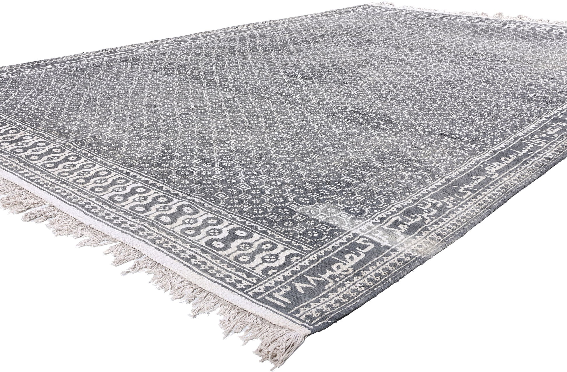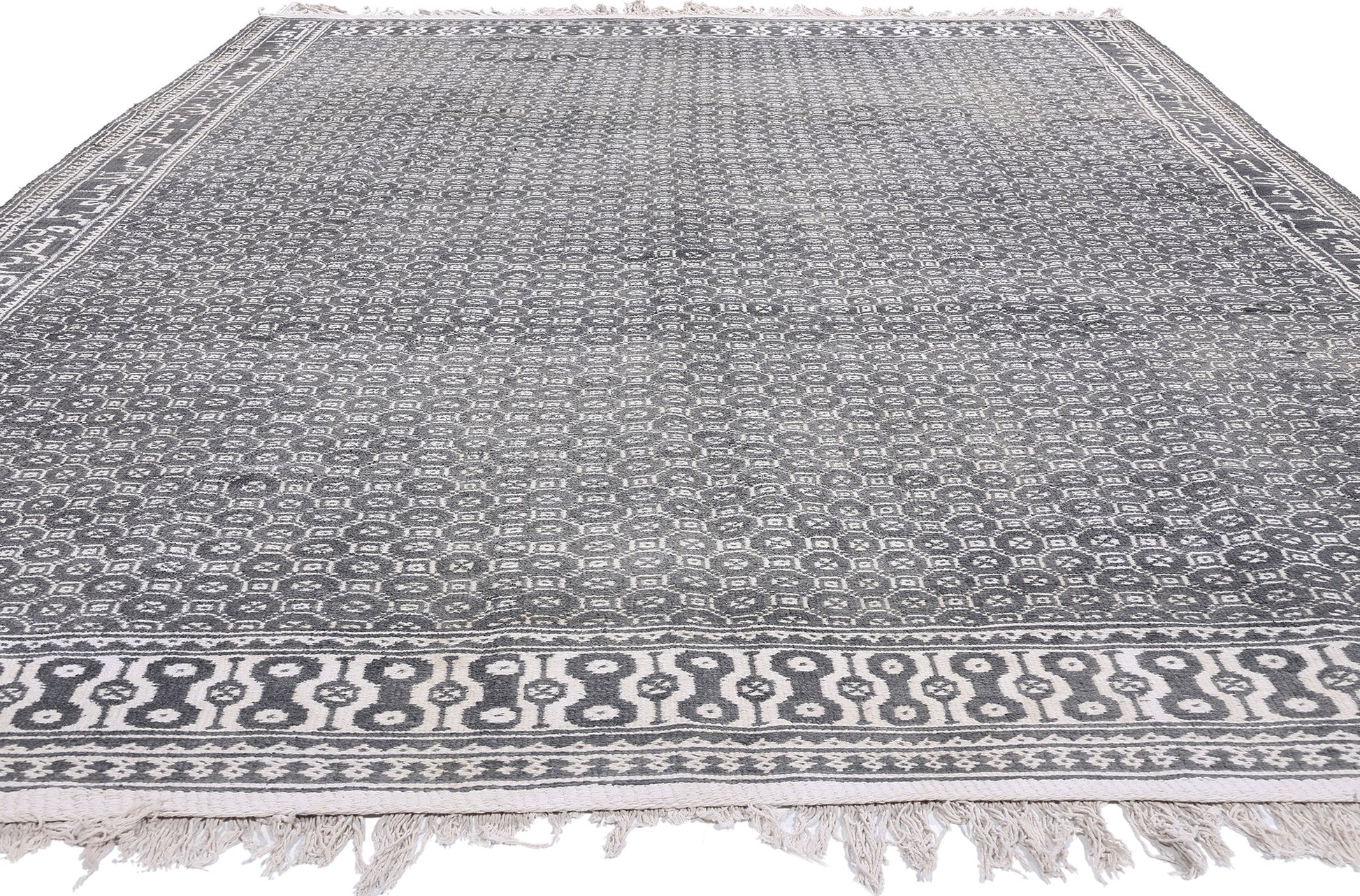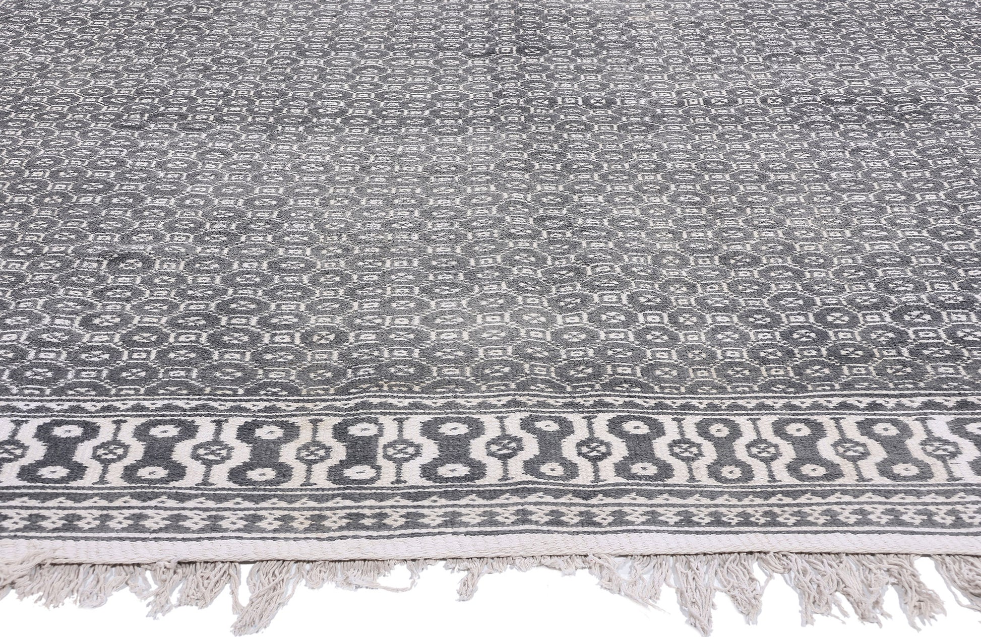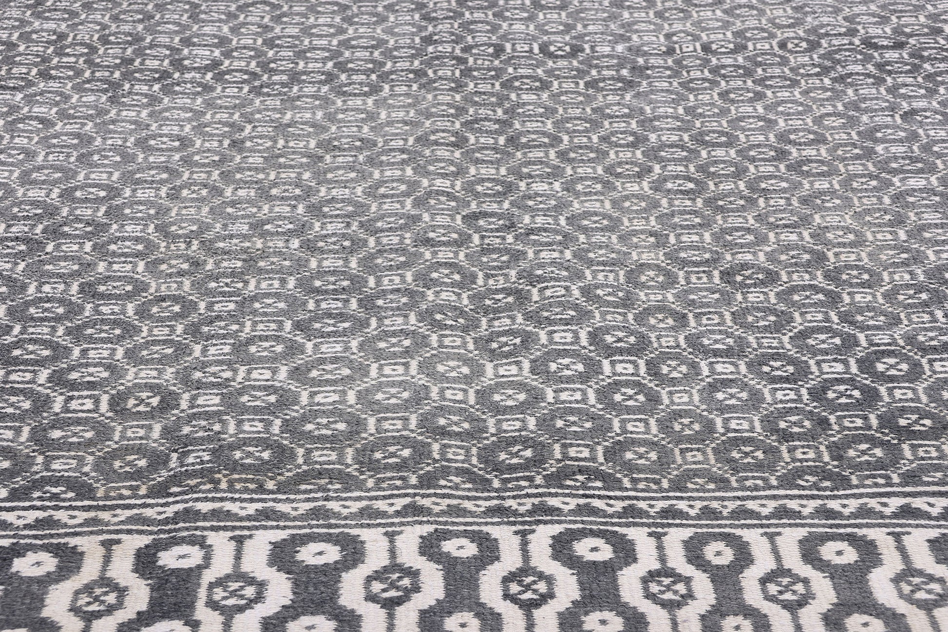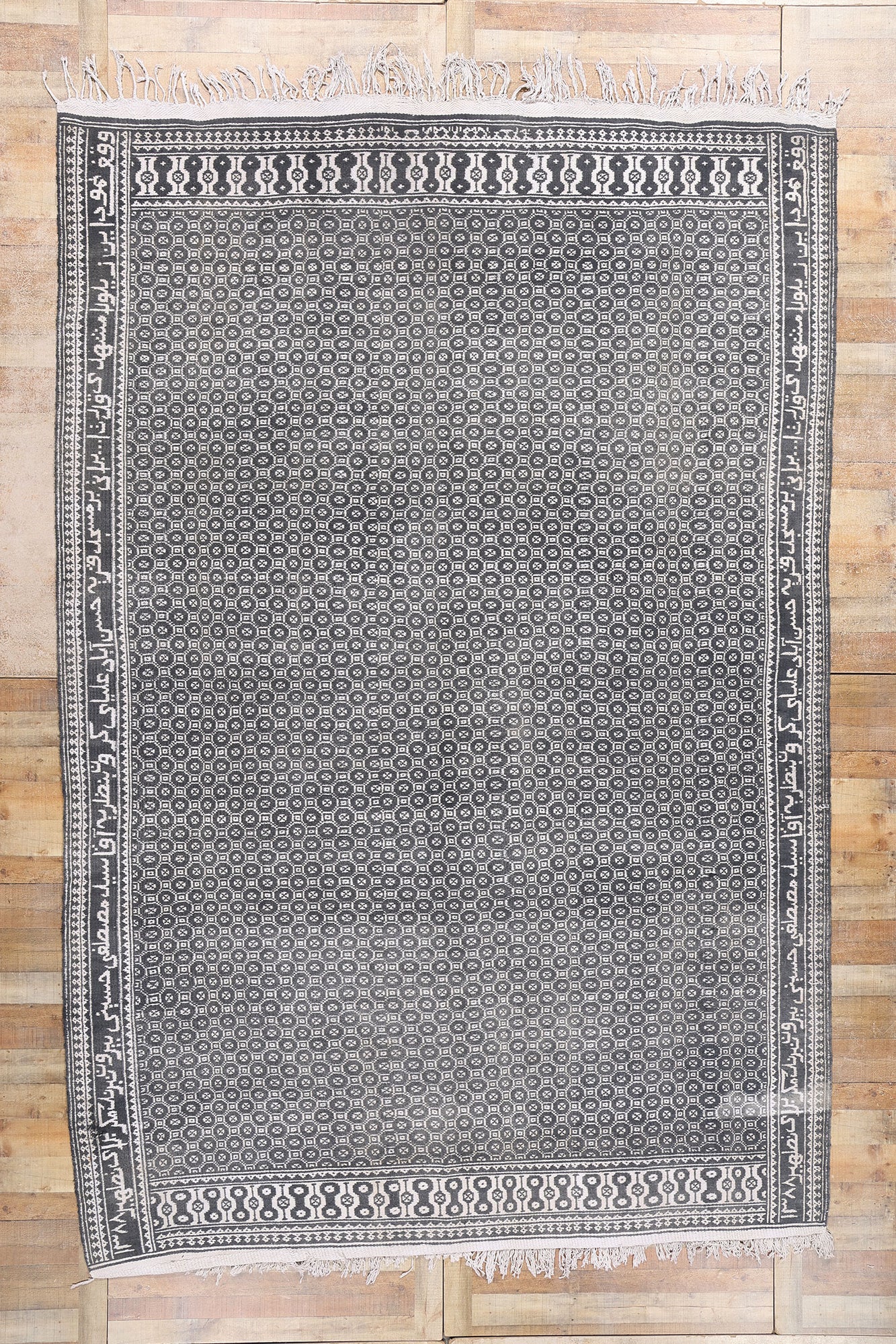The allover pattern of this Ziloo is composed of intricately woven geometric motifs in a refined palette of dark gray and ivory. These repeating motifs, arranged in a meticulous grid, create a sense of balance and harmony, evoking the mathematical precision and symbolic geometry that underpin Persian art. The dark gray tones provide a grounding contrast to the lighter ivory, enhancing the clarity of the design and emphasizing the depth of the weaver’s skill. The overall aesthetic is both minimalist and sophisticated, blending functional utility with modern elegance.