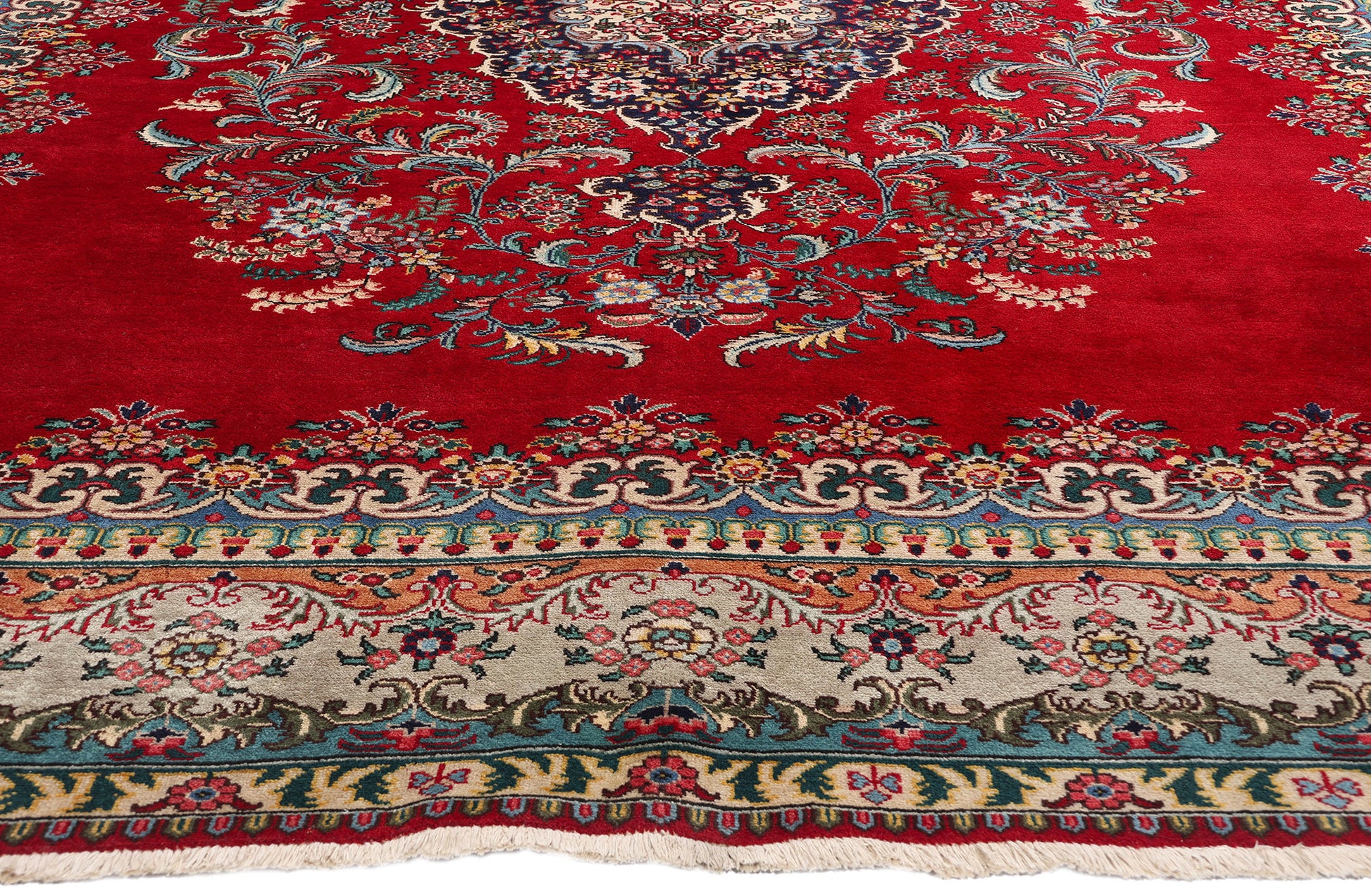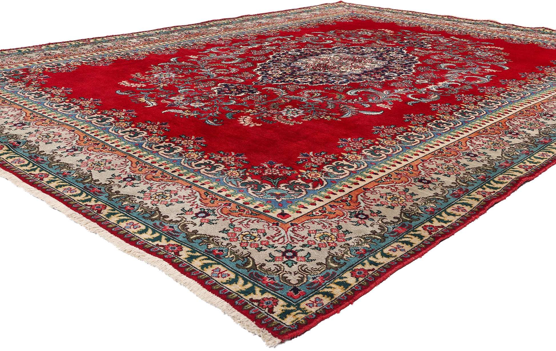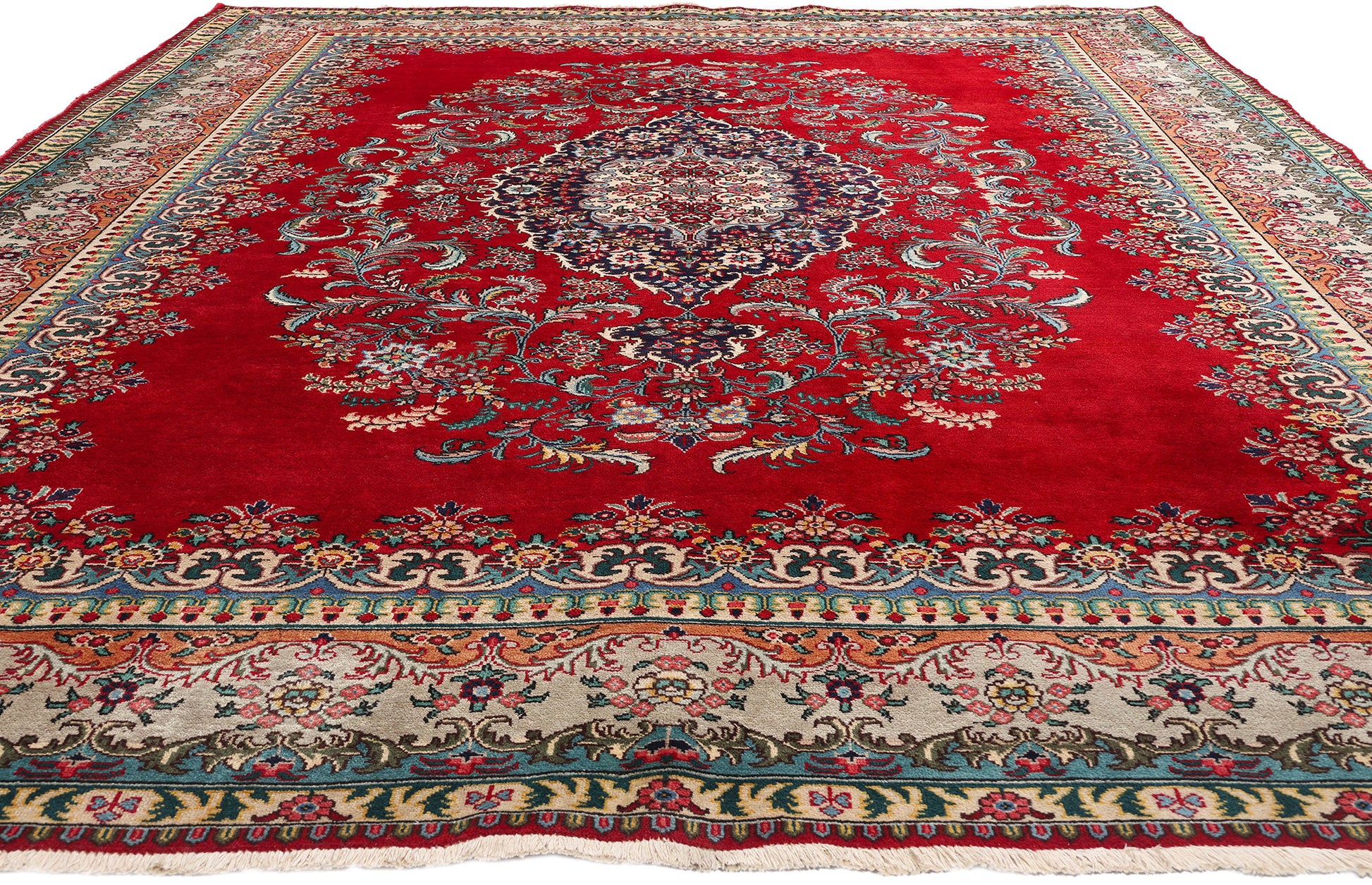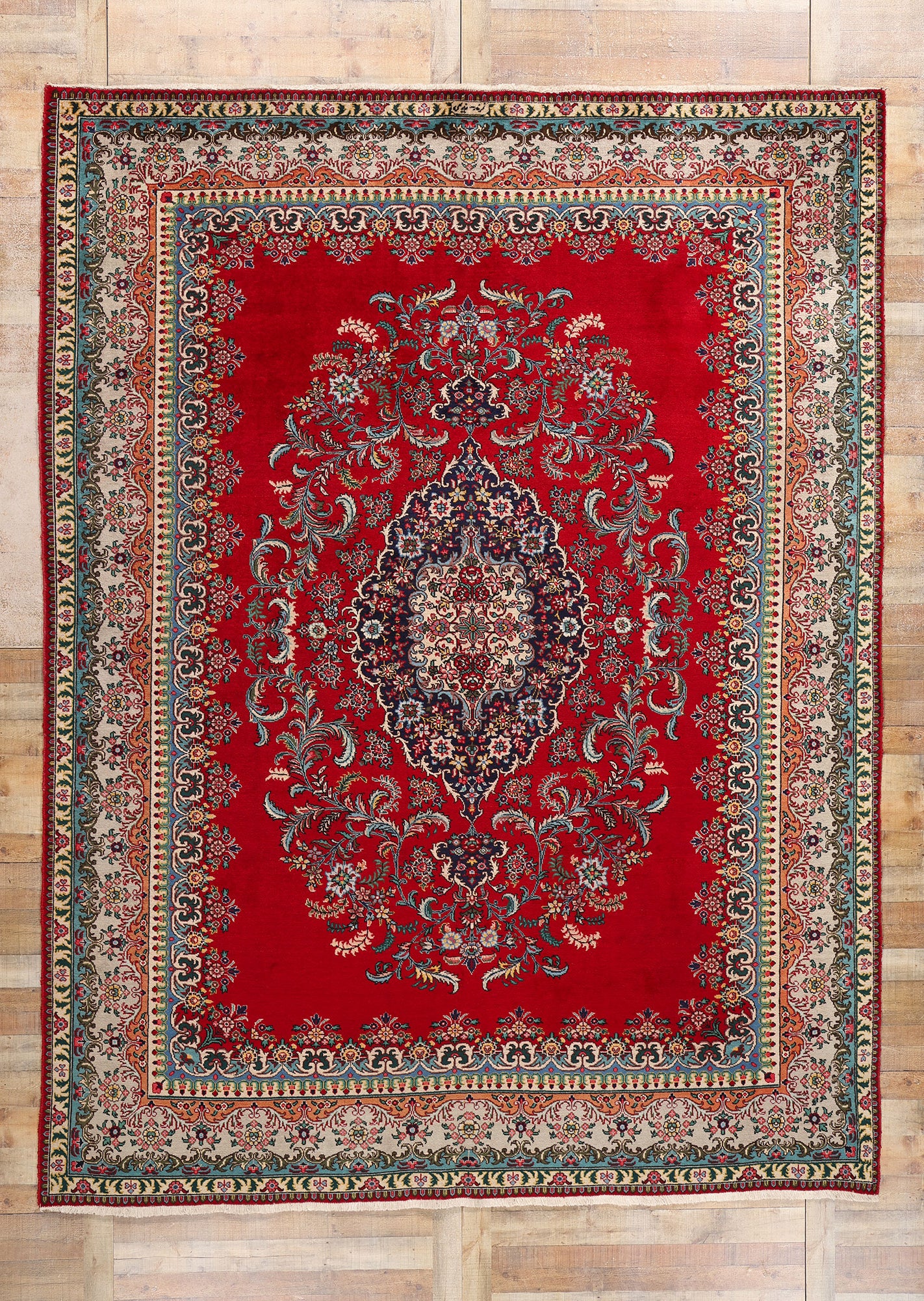 This vintage Persian Tabriz rug is a splendid example of masterful craftsmanship and traditional design. Hand-knotted from fine wool, the Tabriz rug features a striking central medallion set against a rich red field, a color historically revered in Persian culture for its symbolism of wealth, courage, and joy. The medallion is intricately detailed with a complex arrangement of Persian flowers, including blooming palmettes and lotus blossoms, each chosen for their symbolic meanings—palmettes signify life and fertility, while lotuses represent purity and rebirth.