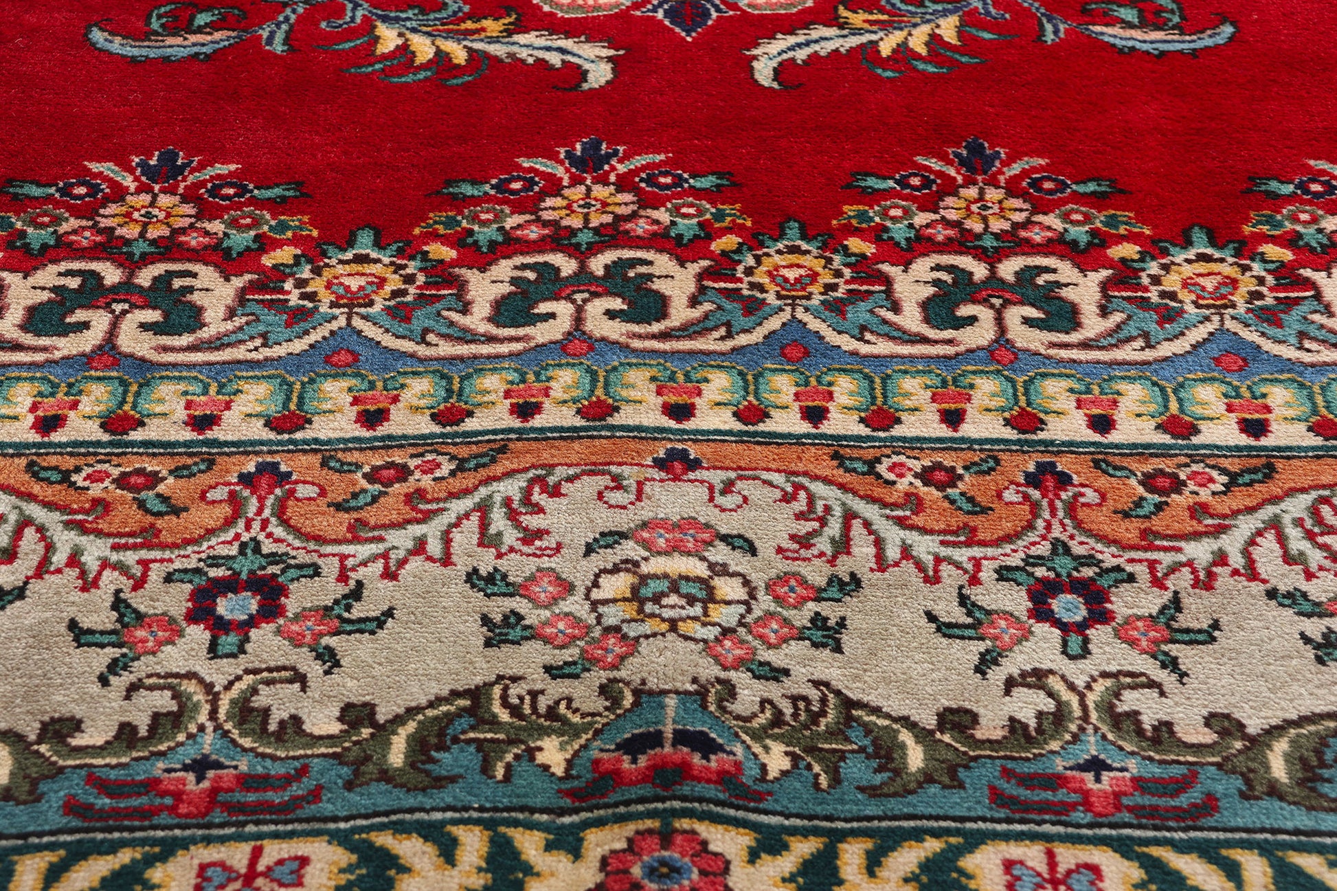 The rug’s border is a work of art in itself, enclosed with a primary botanical border that showcases a repeating pattern of florals and vinery, meticulously detailed and vibrant against the softer background. This main border is flanked by a series of inner and outer guard bands, each featuring smaller, continuous floral motifs that complement the grandeur of the main design. These guard bands serve not only as a decorative frame but also function to protect the integrity of the artwork within, echoing the traditional use of borders in Persian rugs to encapsulate and preserve the beauty of the central tableau.