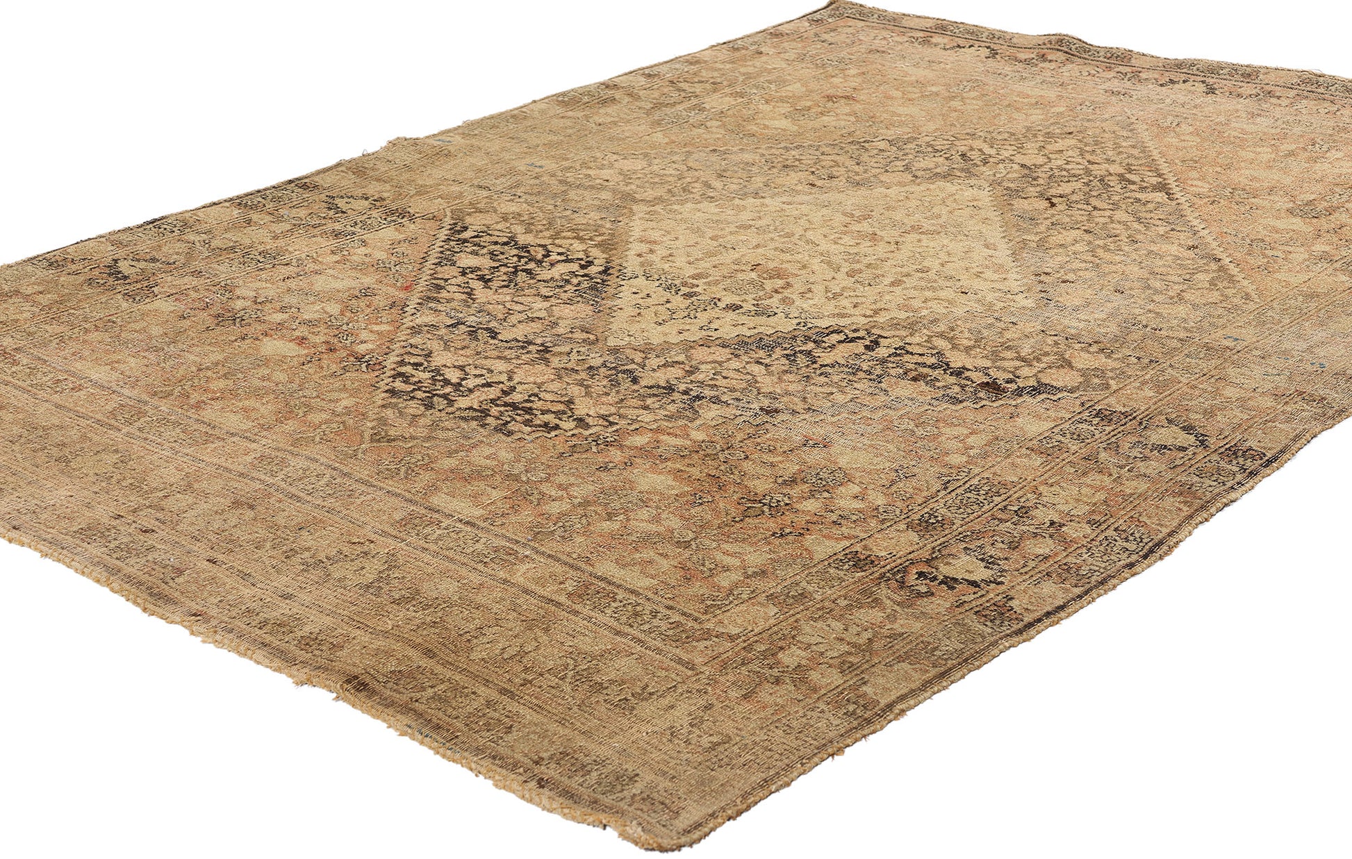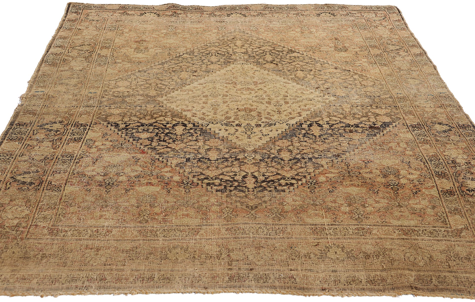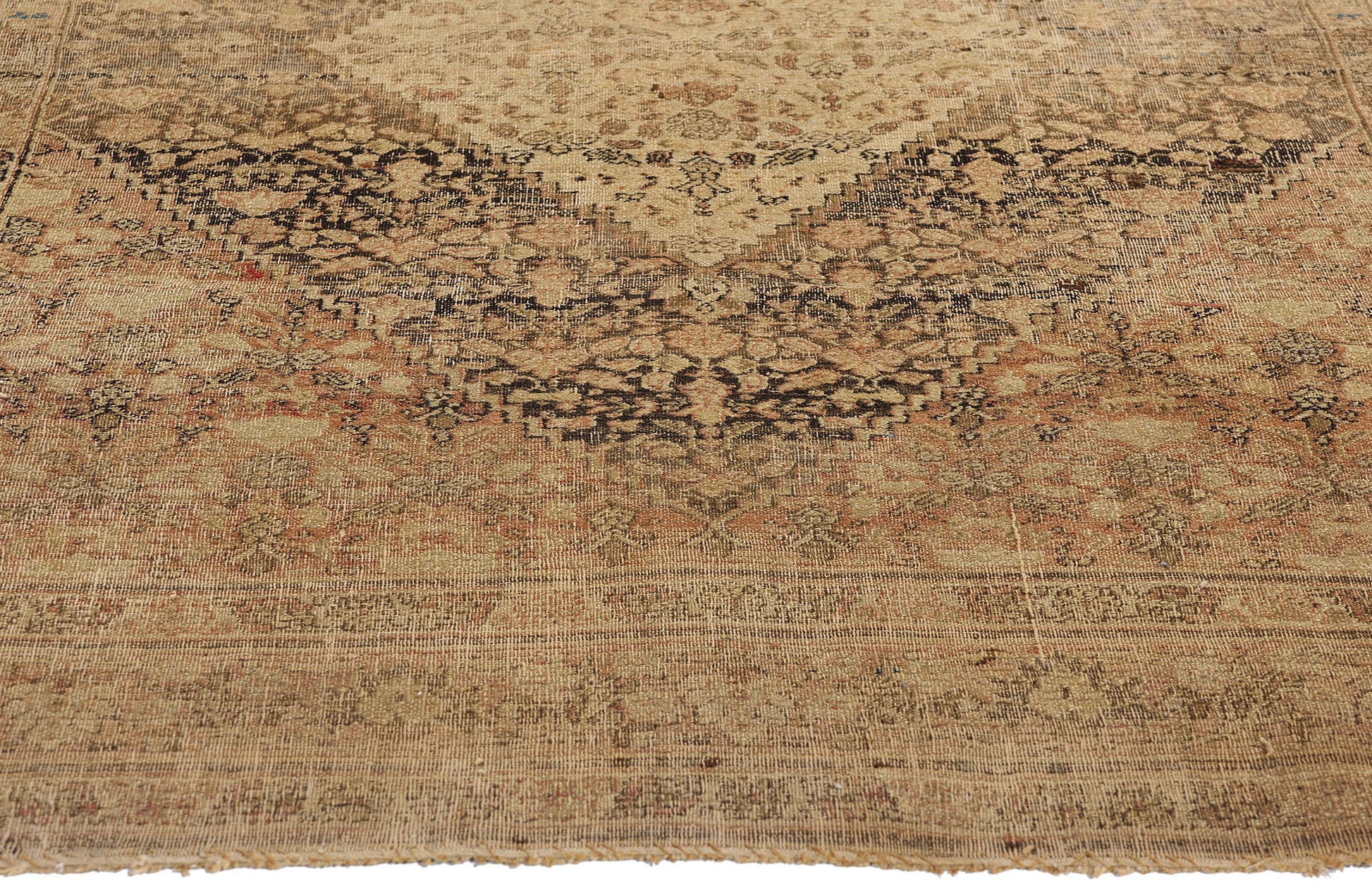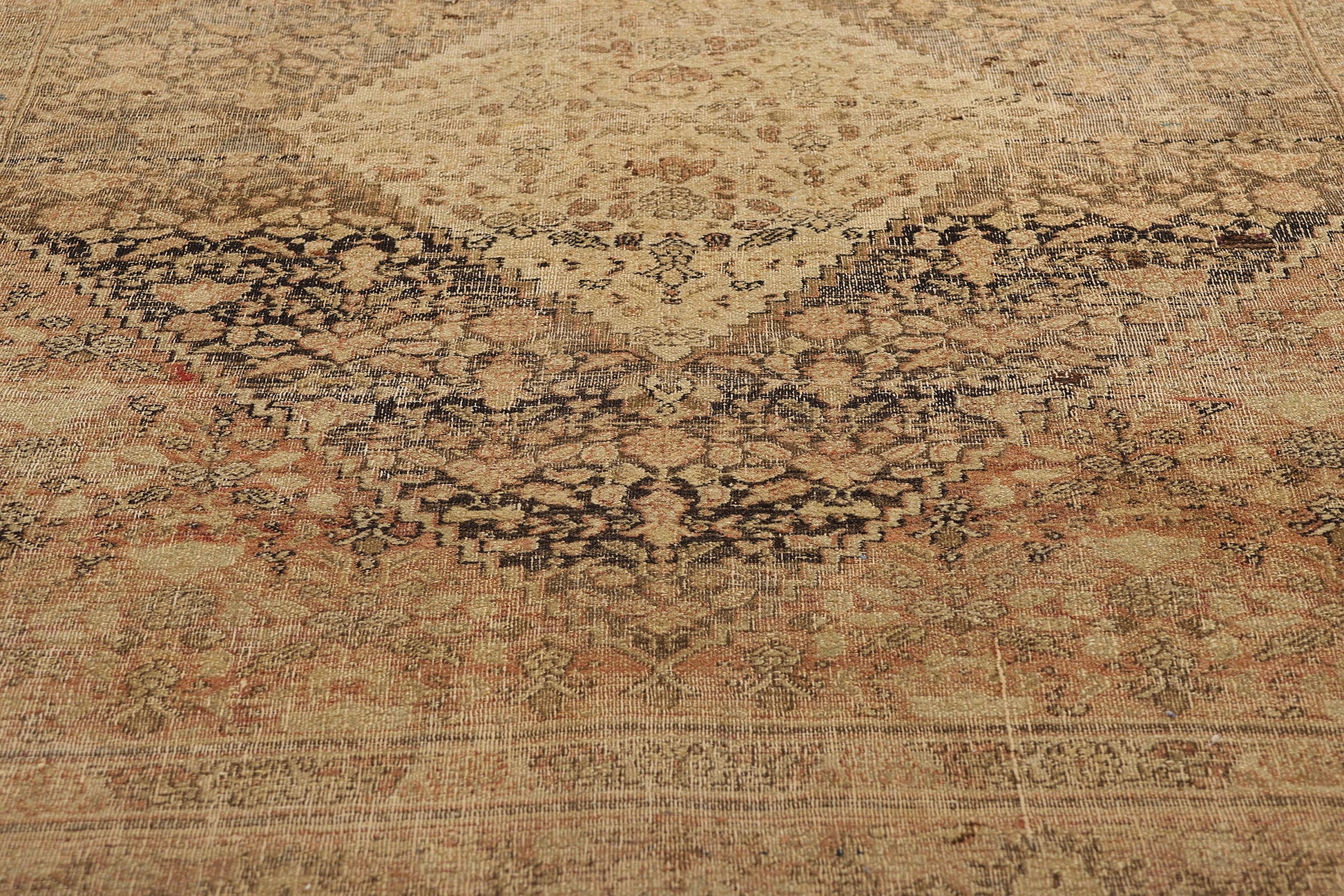This hand-knotted wool distressed antique Persian Mahi Tabriz rug eloquently marries modern rustic charm with laid-back luxury, making it a perfect representation of aged elegance and refined taste. At the heart of its design, a concentric stepped central medallion draws the eye, intricately detailed and beautifully faded, suggesting a history rich with cultural significance. The medallion, subtle yet commanding, is enveloped in an allover pattern of Herati motifs, which are rendered with exceptional artistry and precision, lending an air of relaxed refinement to the rug’s rugged beauty.