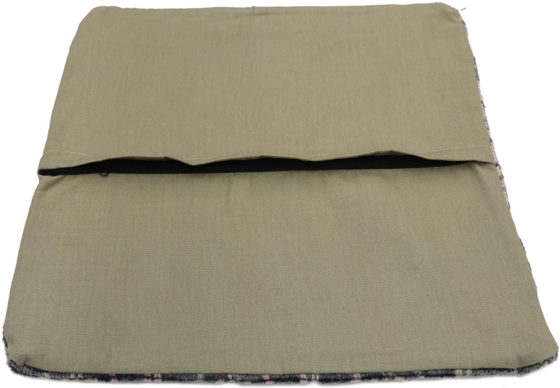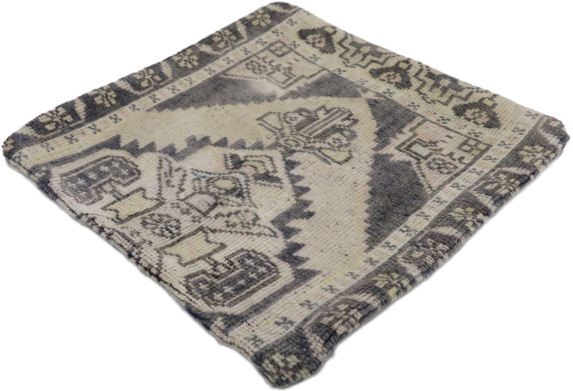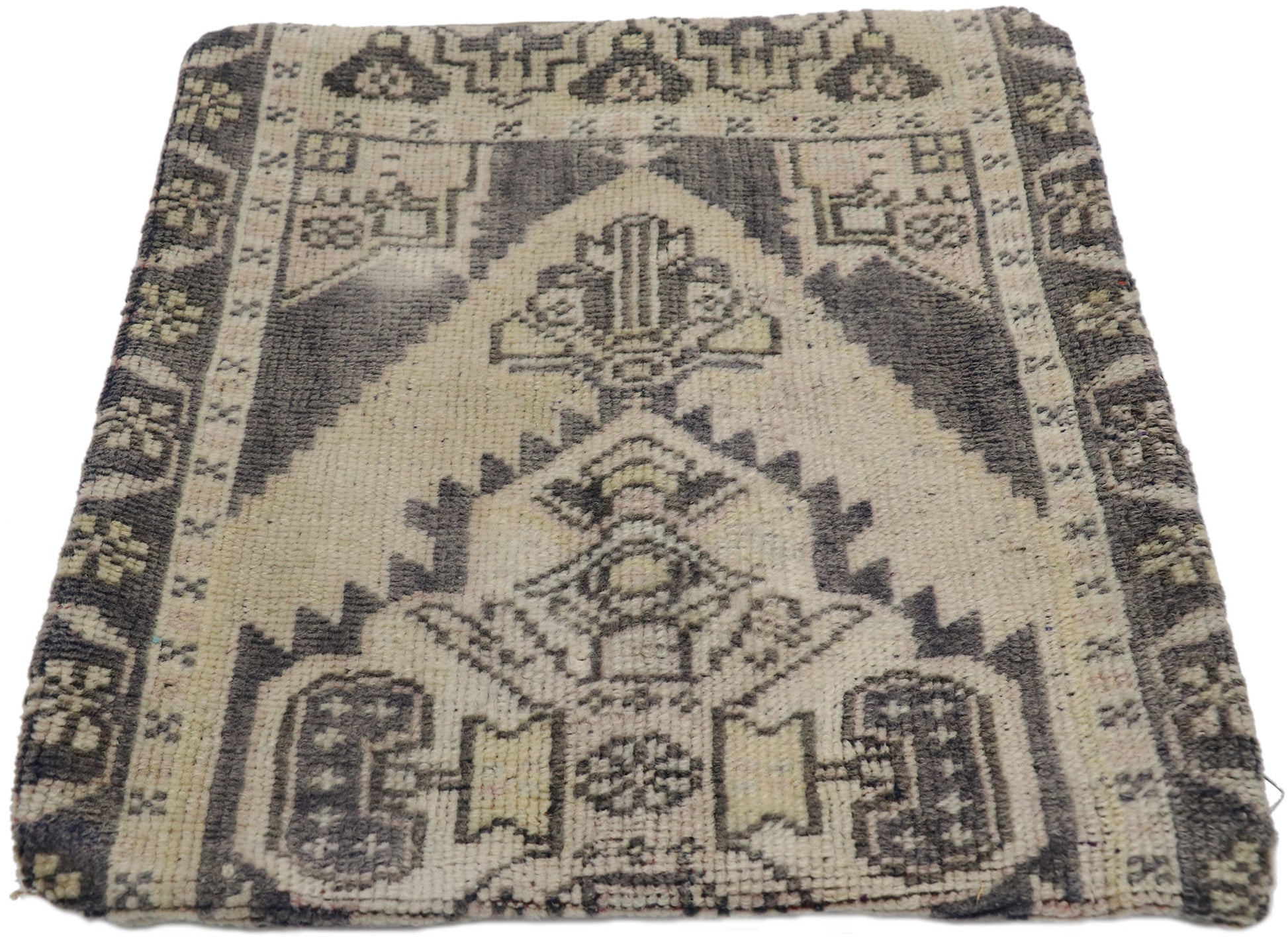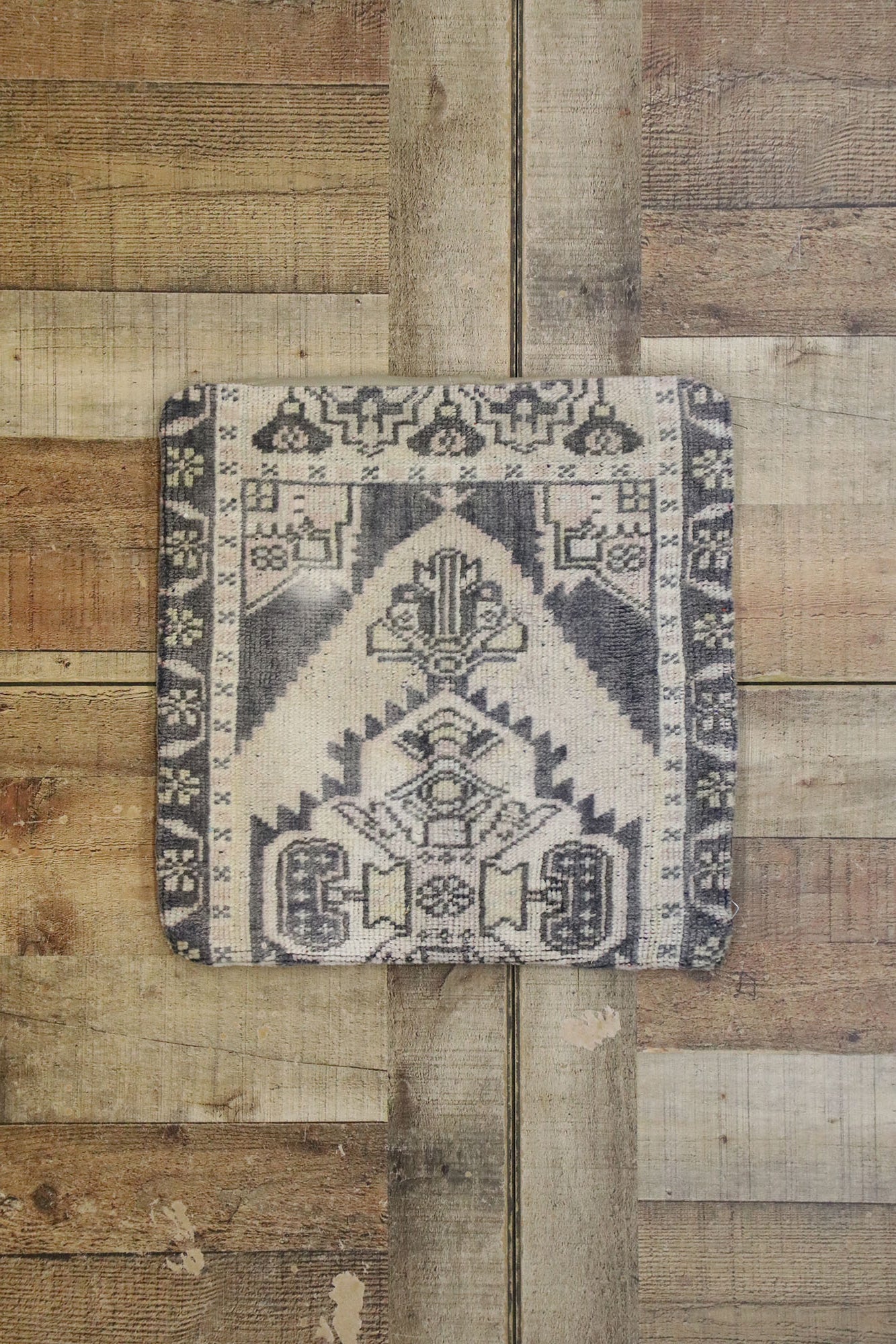 Emanating nomadic charm with elements of comfort and functional versatility, this vintage Turkish rug pillow cover will take on a curated lived-in look that feels timeless while imparting a sense of warmth and welcomed informality. This pillow cover was made from a vintage Turkish rug. The eye-catching geometric pattern and earthy colorway work together creating a truly one-of-a-kind look. The overall design aesthetic is simple and modest with an emphasis on functionality. With its timeless style, incredible detail and texture, this vintage rug pillow emanates so much character and will boost the coziness factor in nearly any space. It blends beautifully with modern and traditional interiors; and would also complement mountain living for luxury ski chalets, secluded hunting lodges and ranch estates found in Montana, Colorado, Lake Tahoe, Wyoming, or the Adirondacks.