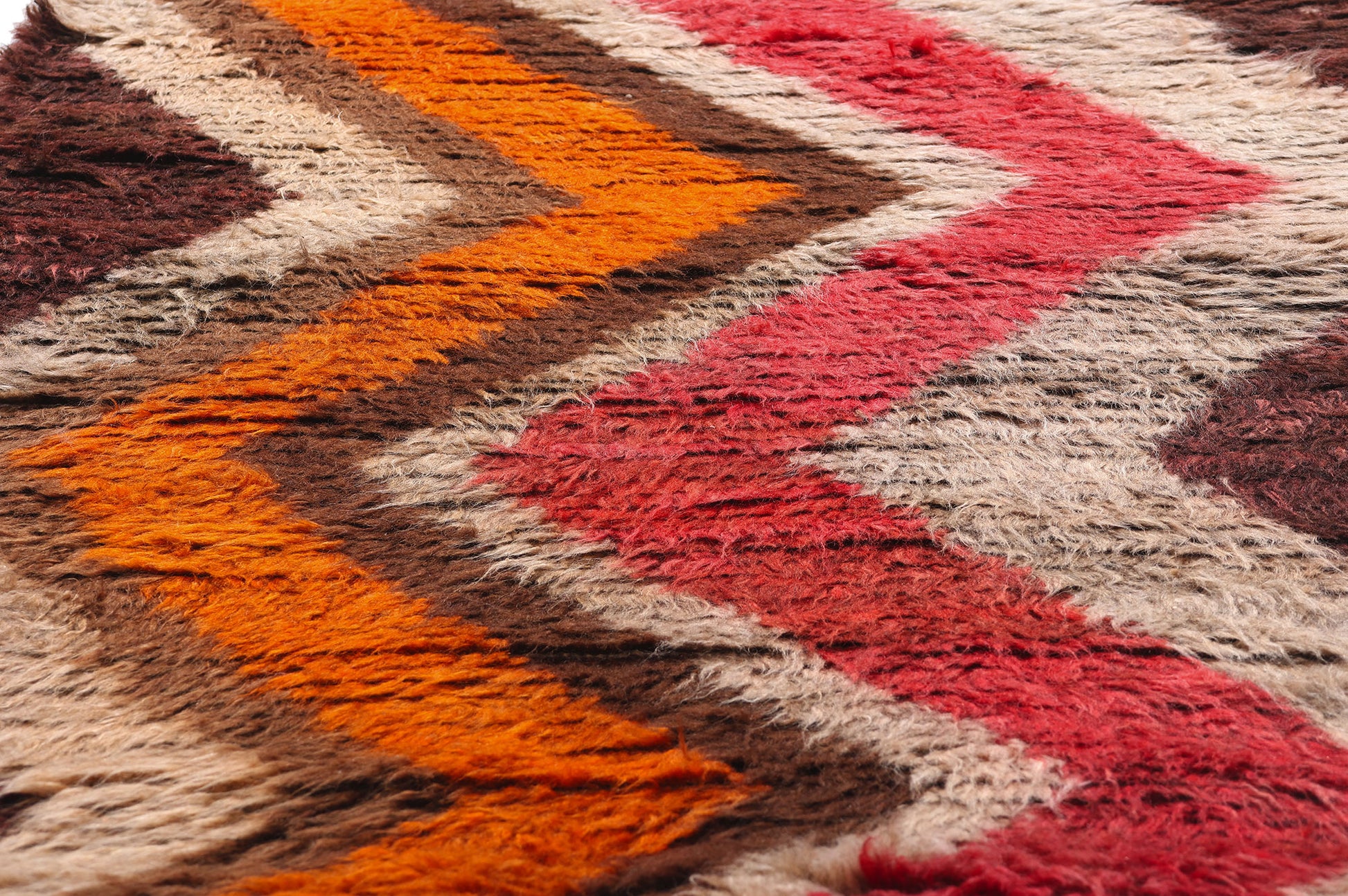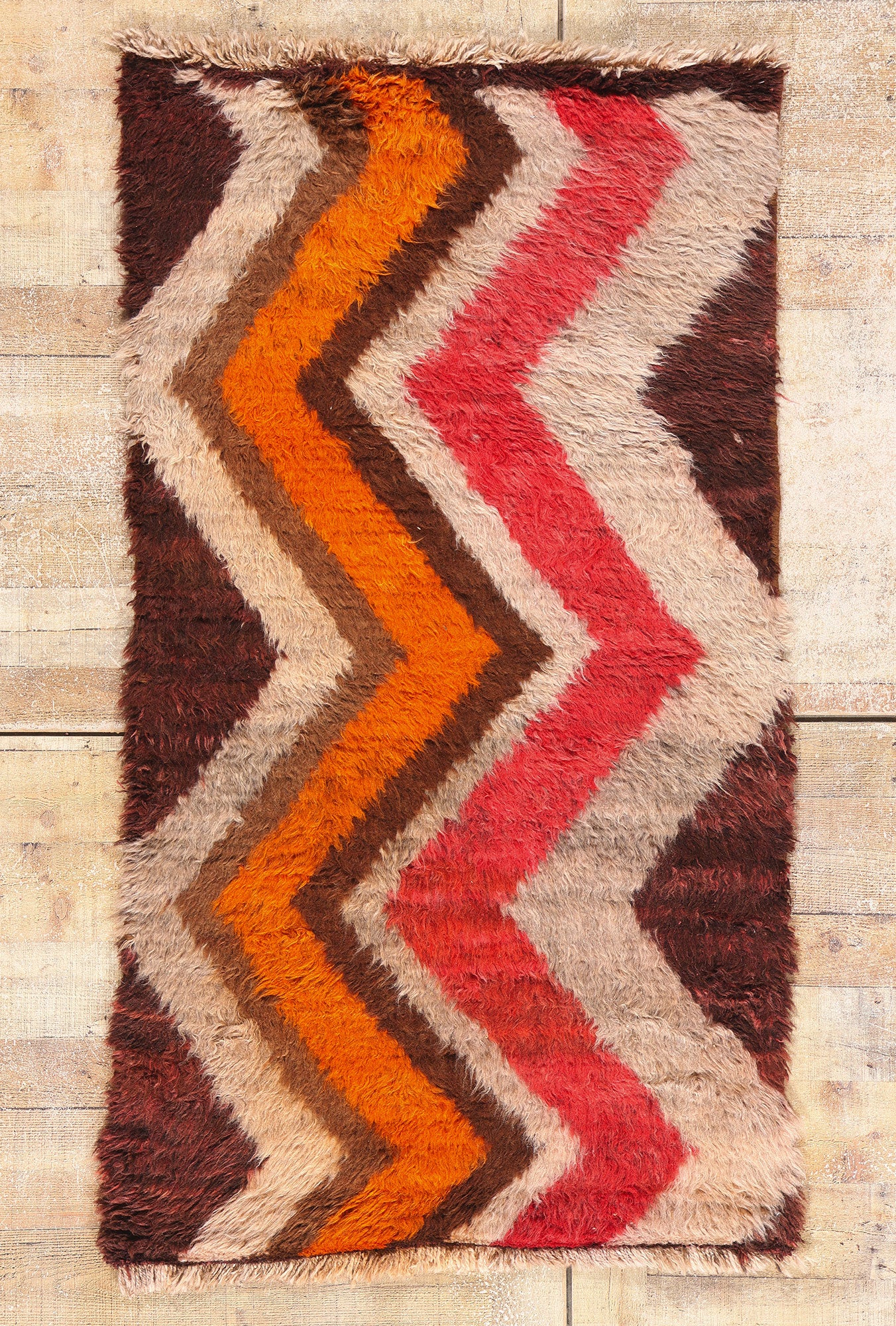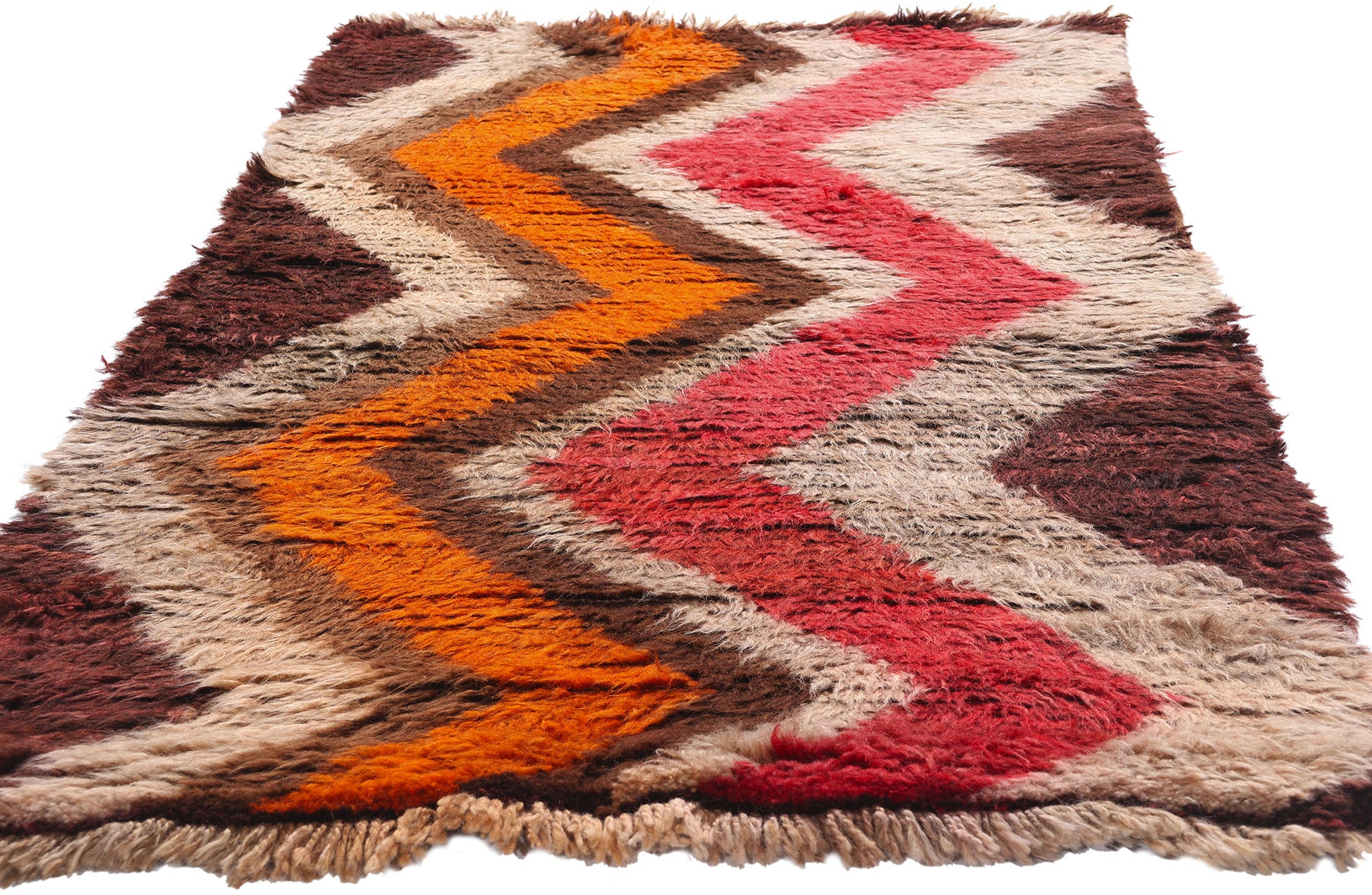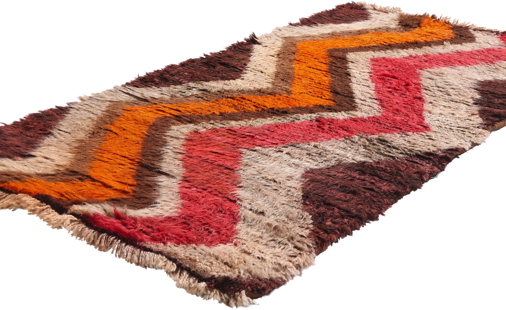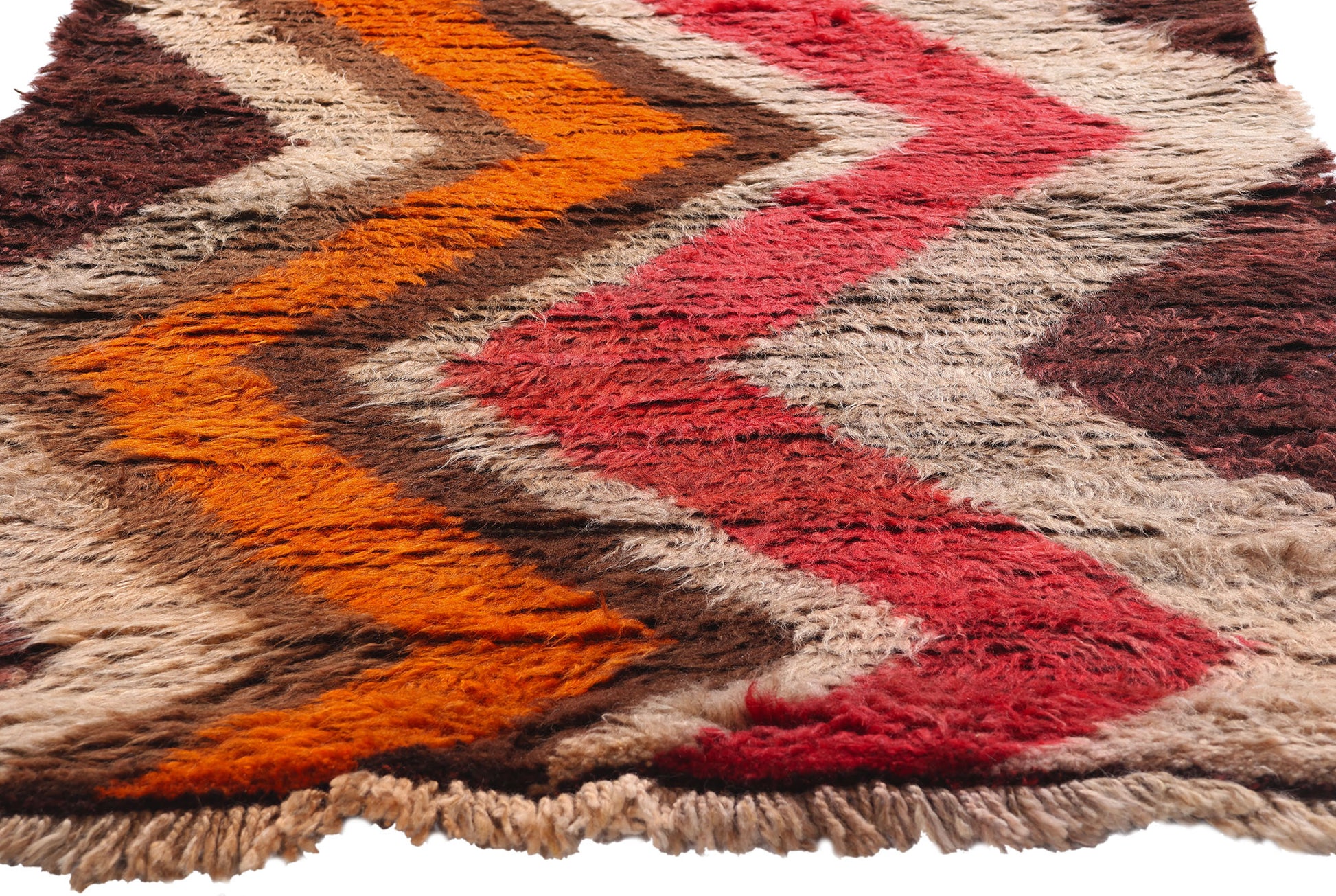 This hand-knotted wool vintage Boujad Moroccan rug is a vibrant celebration of color, culture, and craftsmanship. Woven with the authentic spirit of the Berber tribes from the Boujad region, this Moroccan rug showcases a design that is both modern and timeless. The bold chevron pattern, with its rich earthy tones of orange, red, puce, oxblood, brown, and warm beige brings a sense of energy and warmth to any space. The zigzagging lines form a visual rhythm that evokes movement and depth, making the Boujad rug not just an accessory, but a statement piece in nearly any room.