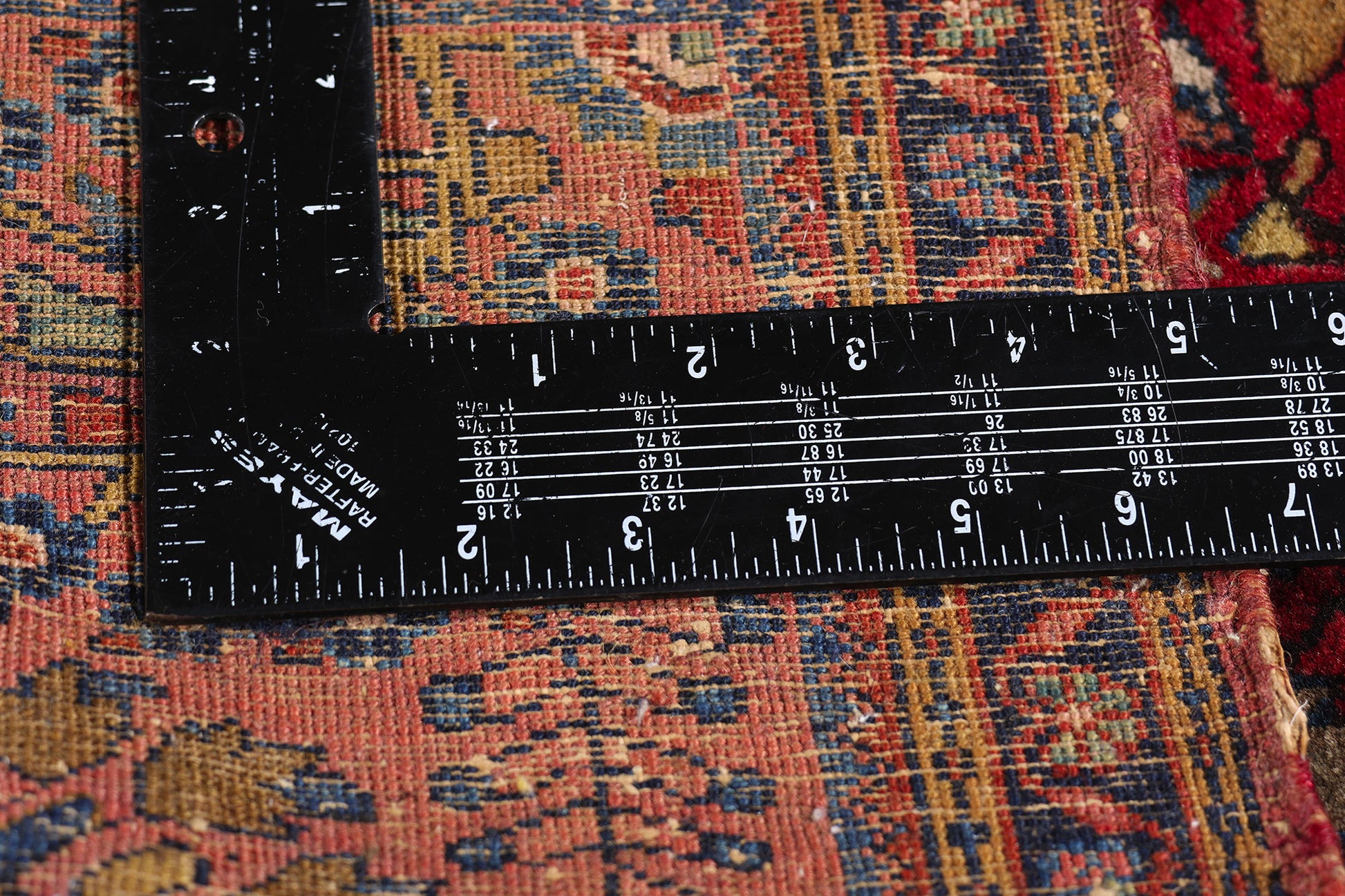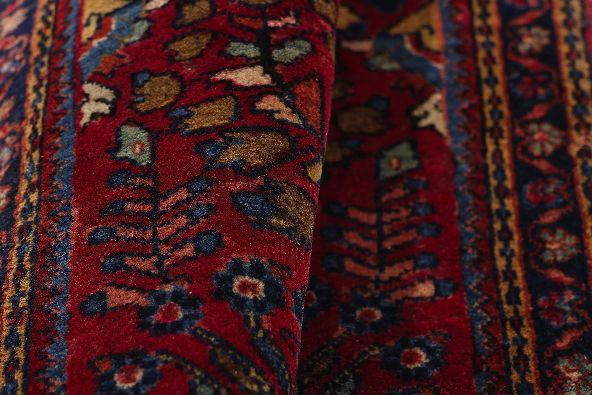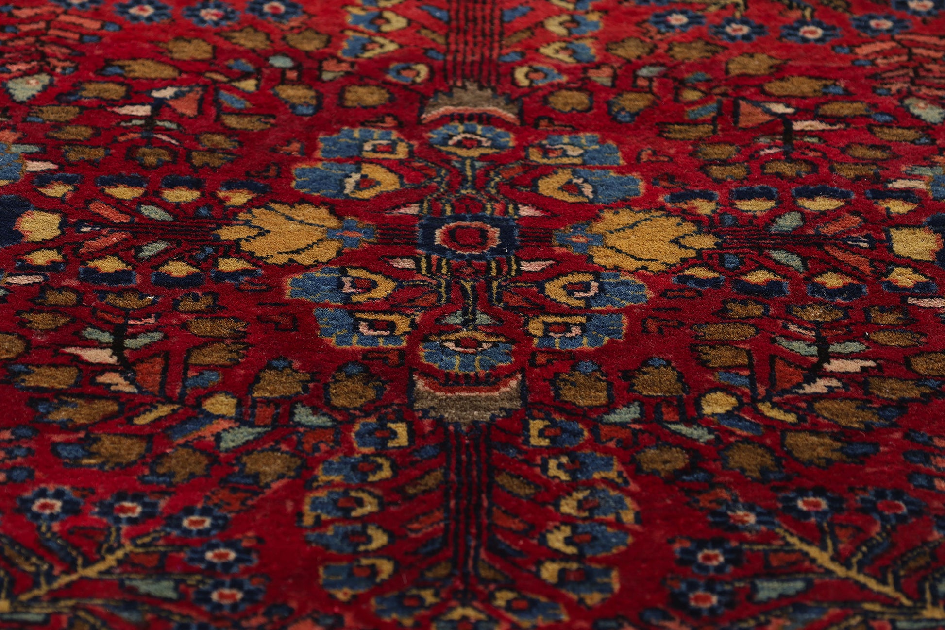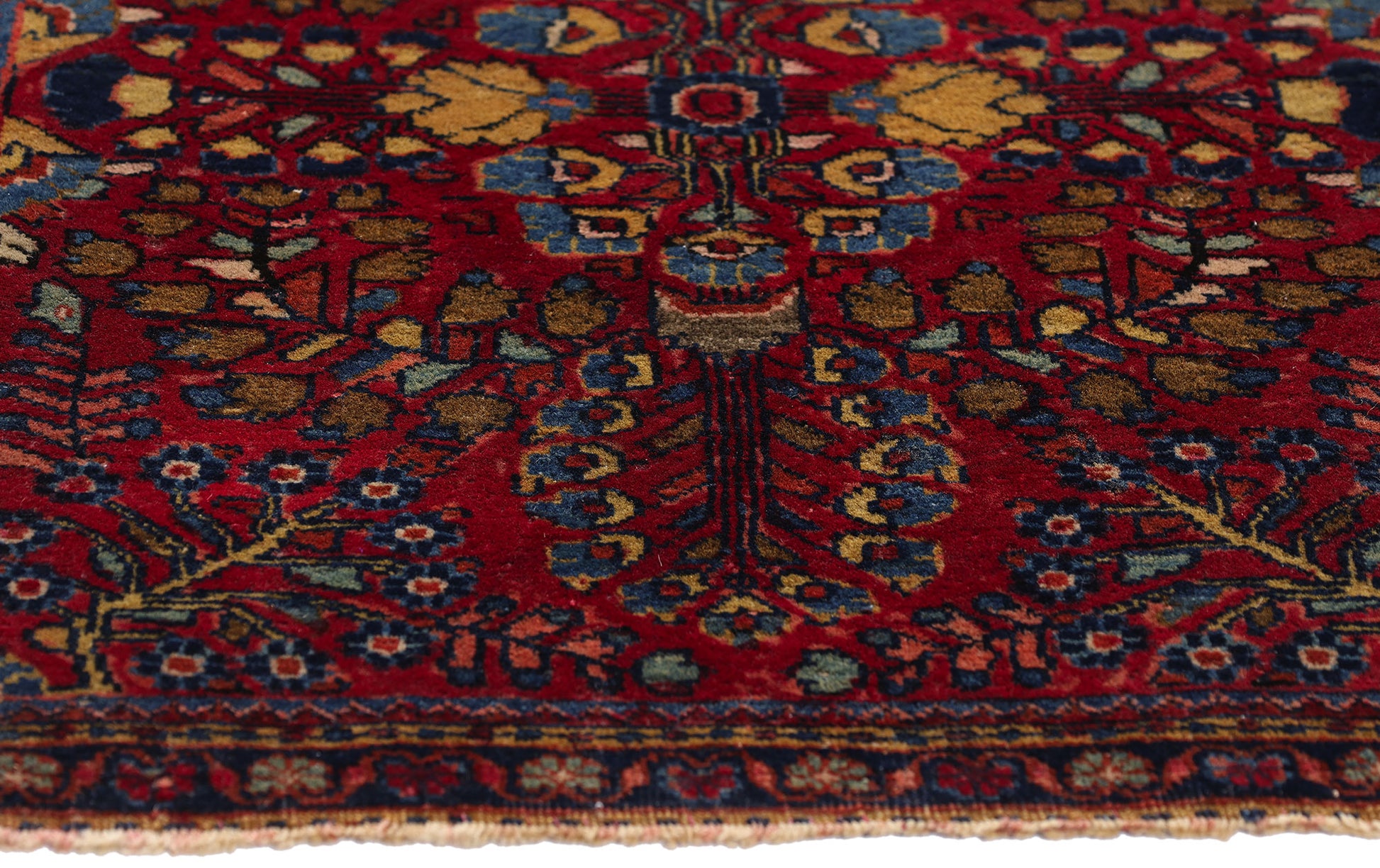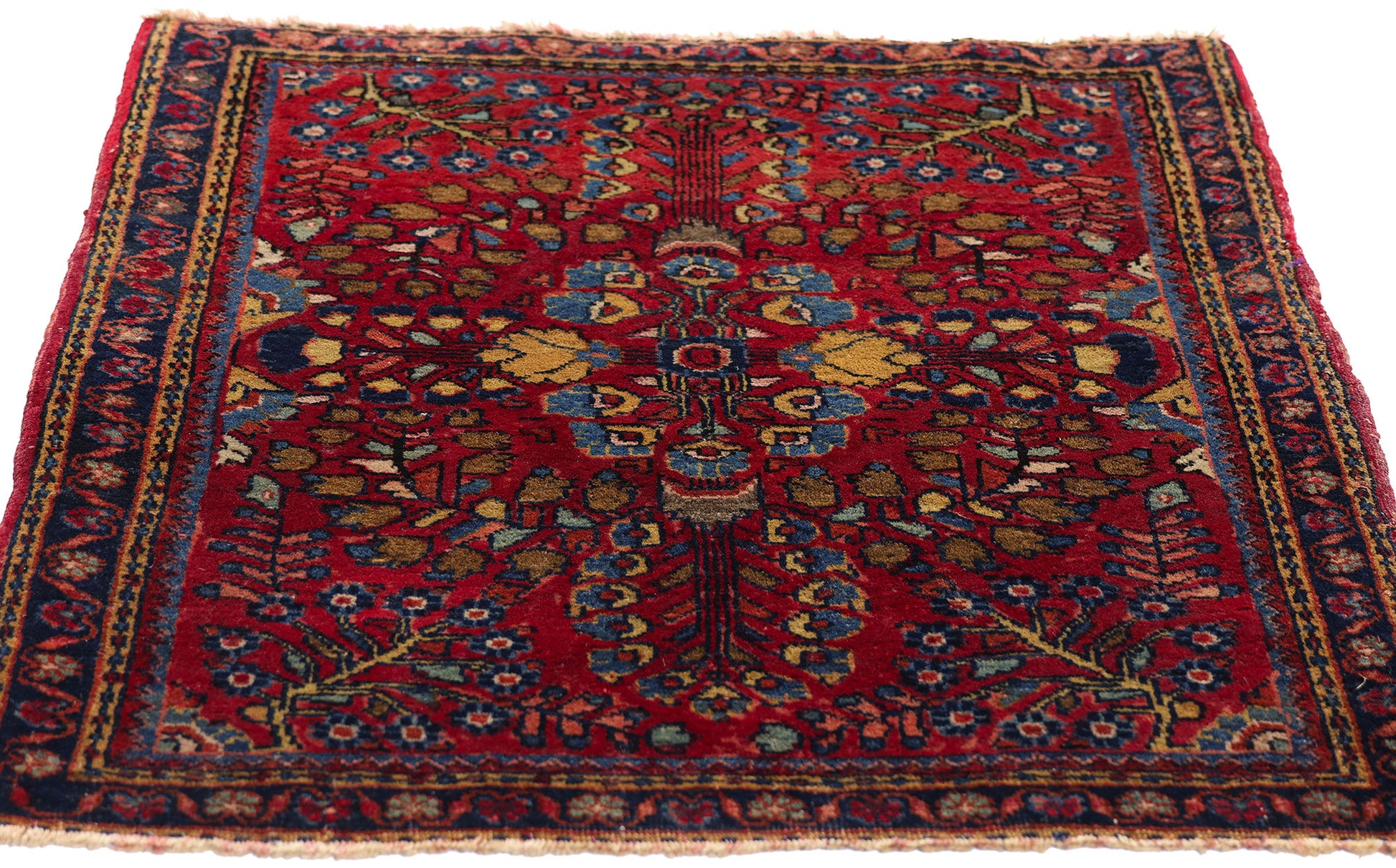 Radiating with regal elegance and old-world charm, this hand knotted wool precious antique Persian Sarouk rug is a sublime expression of classical refinement and botanical grandeur. Woven in the early 20th century, this petite yet commanding carpet embodies the enduring prestige of the Sarouk weaving tradition, celebrated for its dense floral arrangements and sumptuous color saturation. Its deep crimson field serves as a rich canvas for a lavish floral medallion to blossom—a symmetrical bouquet of stylized foliage and painterly blossoms rendered in sapphire blue, golden saffron, brown, and soft rose.