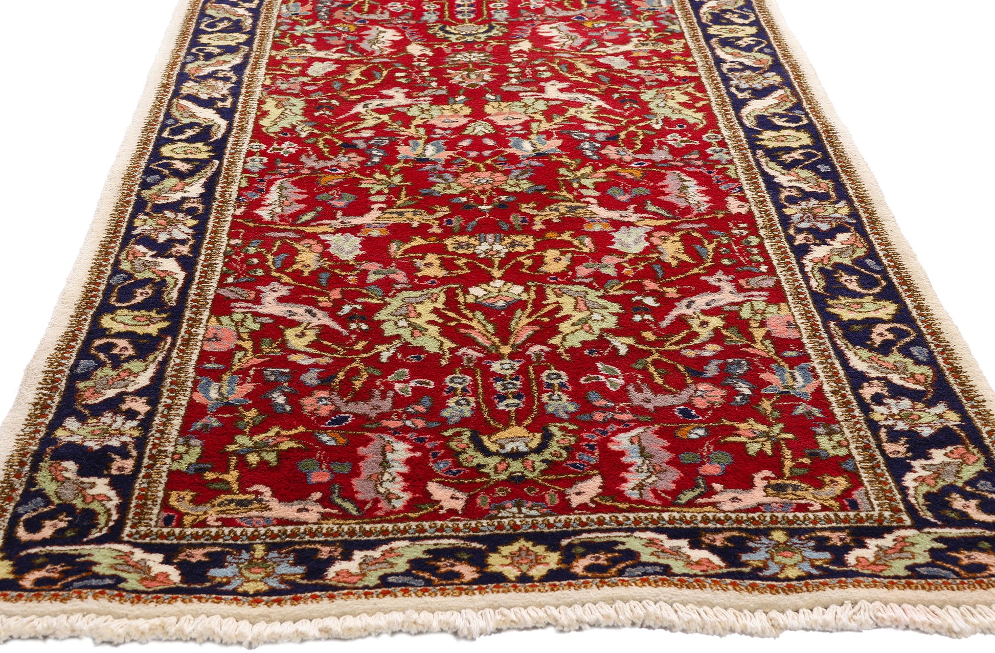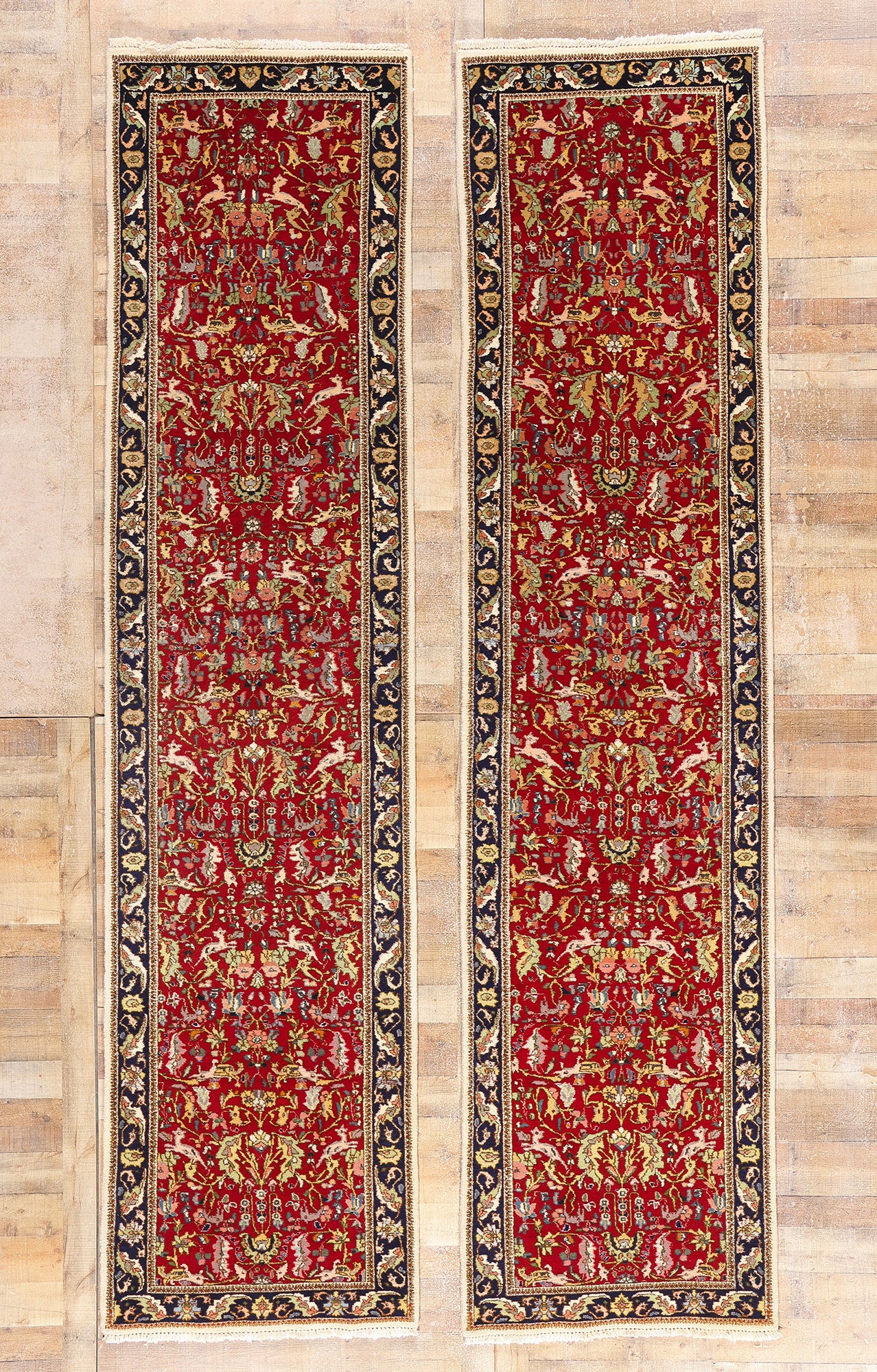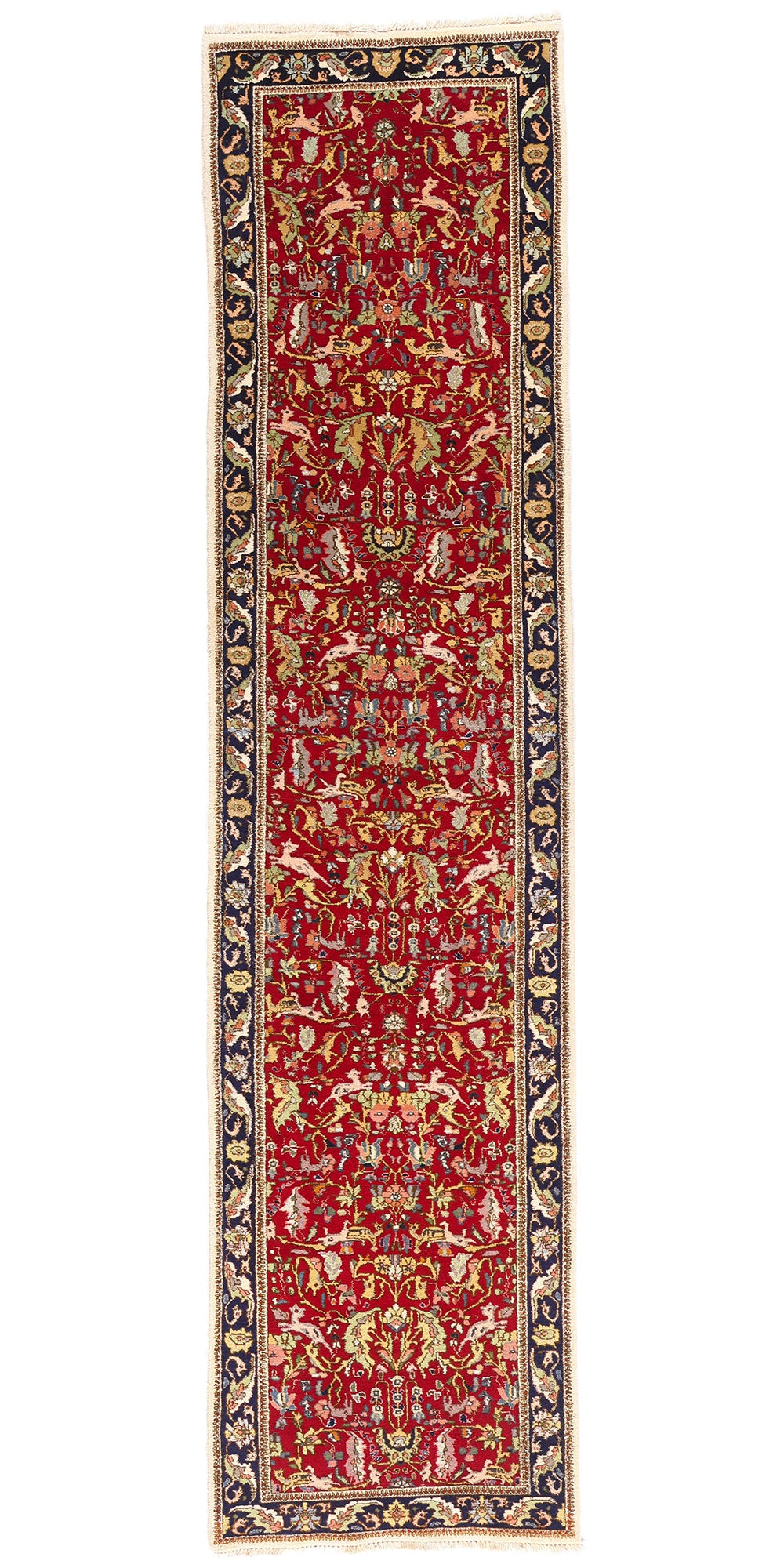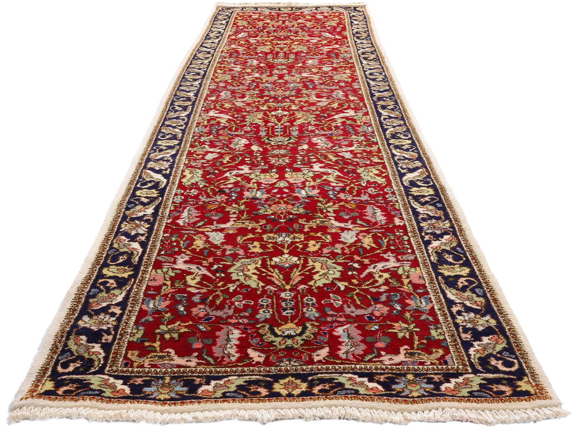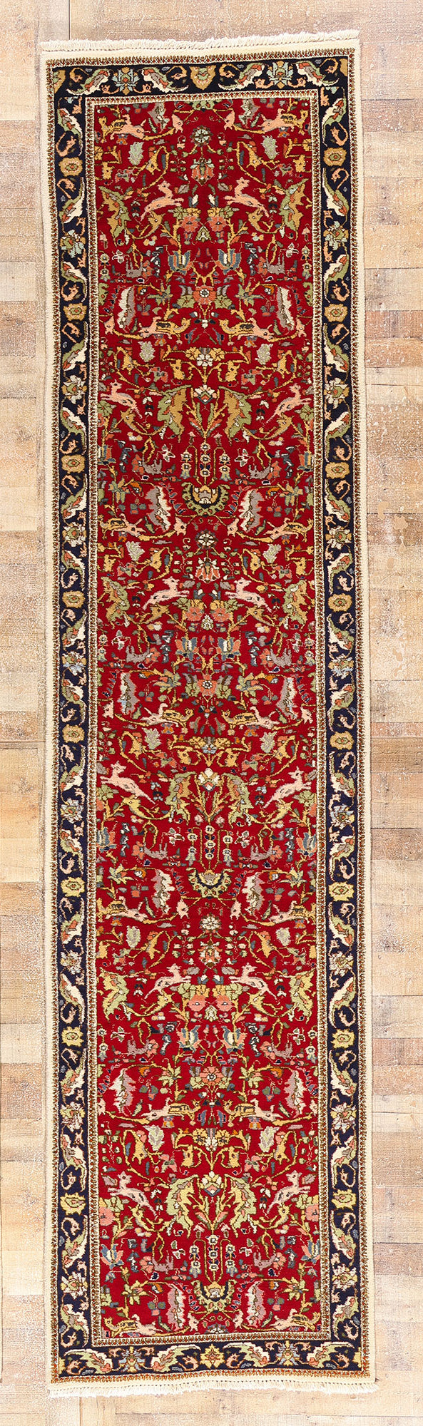 Woven with courtly refinement in one of Persia’s most esteemed weaving centers, this hand-knotted wool antique Tabriz runner is a symphonic composition of color, flora, and storytelling. Set upon a resplendent red field, its surface blossoms with three stately “Tree of Life” motifs, each gracefully anchored along the axis of the design. These symbolic trees unfurl upward and outward in rhythmic harmony, surrounded by an effusion of botanical splendor—echoing the Persian garden ideal, where order, beauty, and paradise converge in visual poetry. The enchanting composition is not merely decorative; it is a living manuscript of paradise on earth, rendered knot by knot with precision and spiritual resonance.