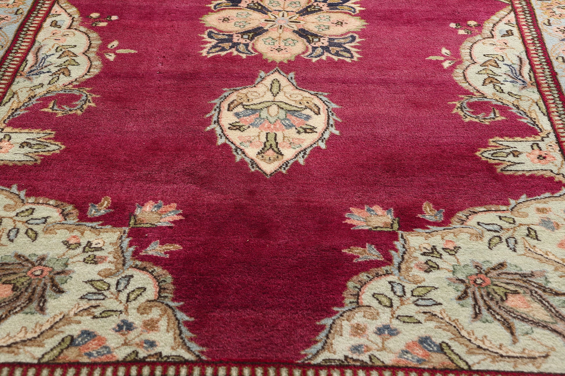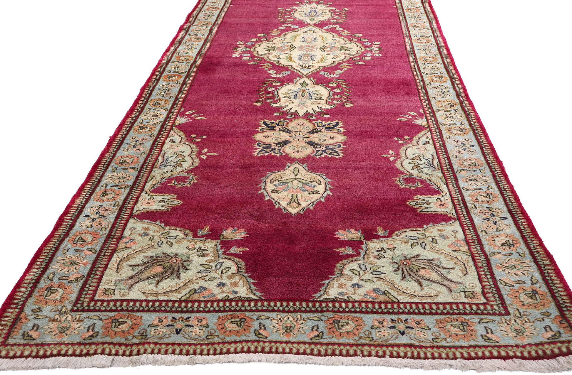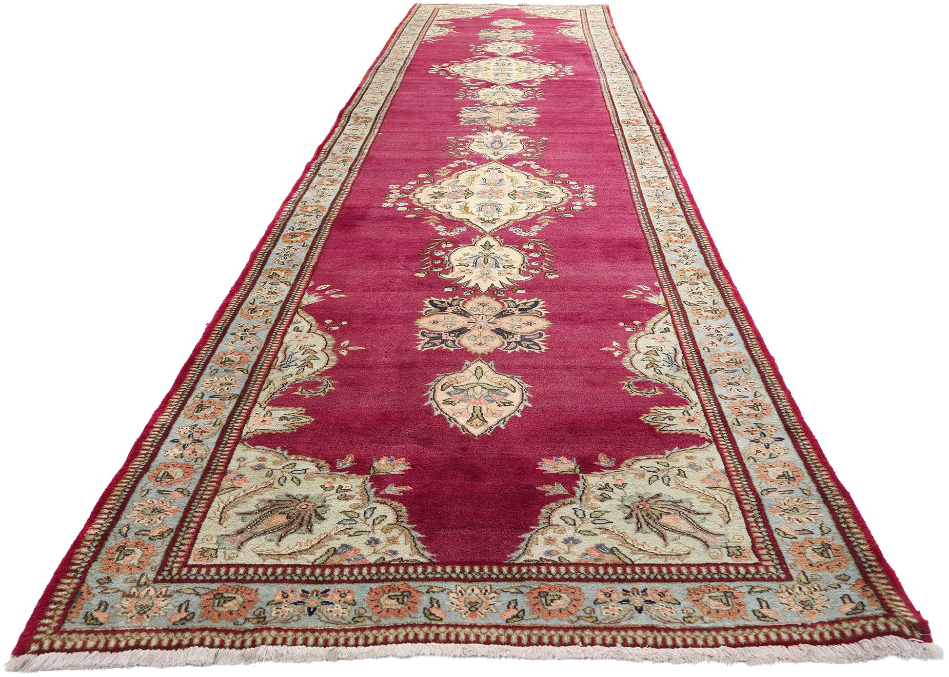 This stunning hand-knotted wool vintage Persian Tabriz rug runner exemplifies the grandeur and intricacy of traditional Persian textiles. The Tabriz carpet runner features a deep red field that immediately captures the eye, providing a rich backdrop for the symmetrical arrangement of ornamental medallions. These cusped medallions are intricately filled with a variety of Persian floral motifs, each detailed to convey the luxurious craftsmanship of Tabriz artisans.