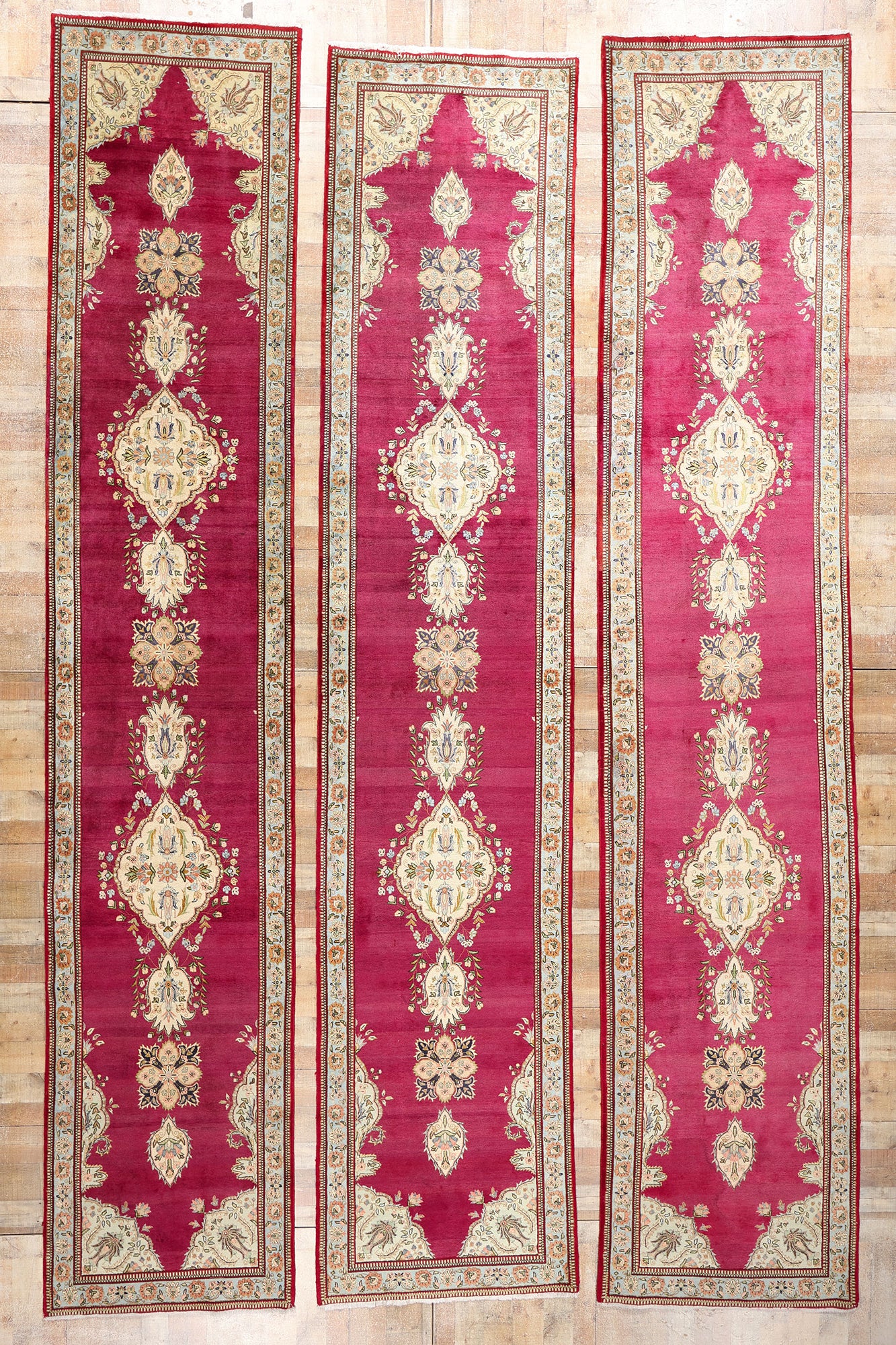 Finding three matching vintage Persian Tabriz runners from the mid-20th century is a rare and valuable occurrence. The coordination of such pieces in both design and condition suggests a high level of craftsmanship and careful preservation over decades. Each runner, echoing the same intricate patterns and vibrant color schemes, serves as a testament to the artistry and attention to detail characteristic of Tabriz weavers. Their preservation not only enhances their aesthetic value but also contributes significantly to their cultural and historical significance, making them a coveted treasure for collectors and enthusiasts of fine Persian textiles.