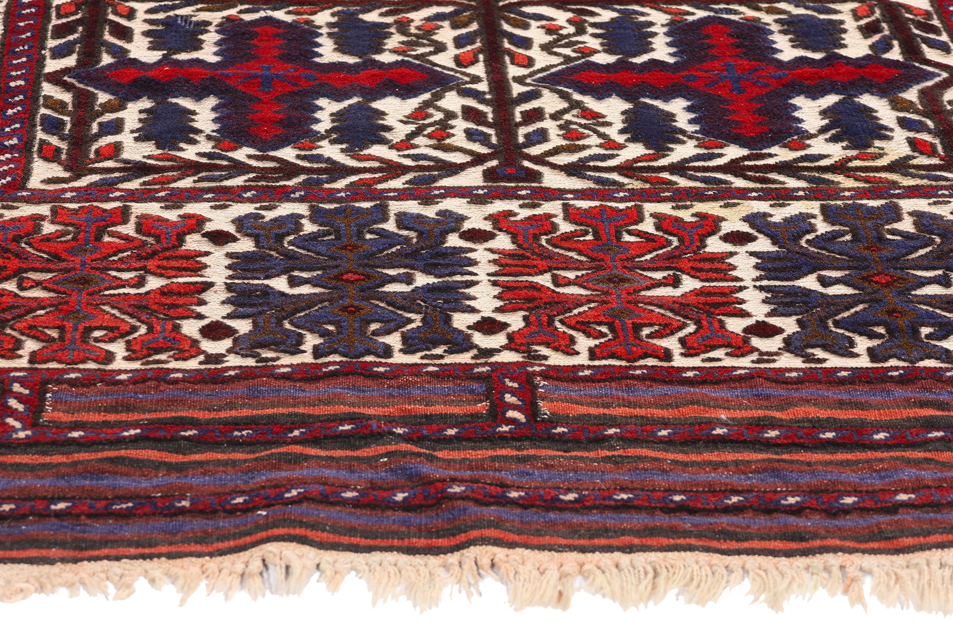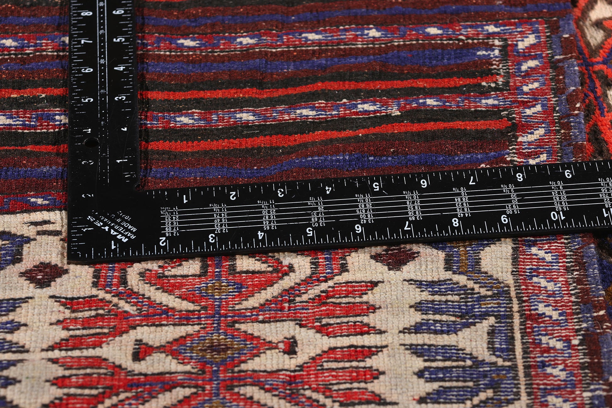 The tactile quality of this Soumak rug is as captivating as its visual appeal, thanks to the distinctive flat-weaving technique used in its construction. The Soumak technique, characterized by its durable and textured finish, provides both a sense of depth and a unique braided appearance. This antique rug is not only a visual masterpiece but also a testament to the enduring artistry and storytelling embedded in Caucasian tribal textiles. Whether displayed as a focal point in an entryway or as an accent in a cozy study, this Caucasian masterpiece carries with it a sense of history, craftsmanship, and cultural significance that transcends time.