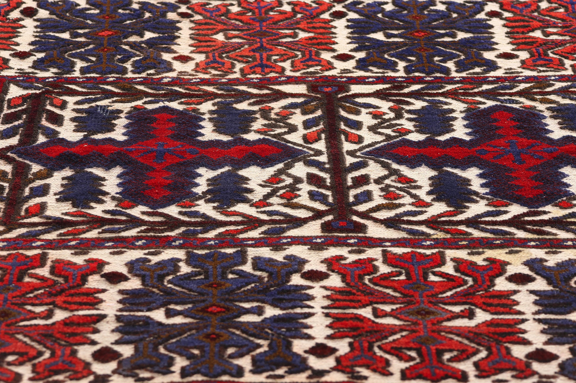 Surrounding the central medallions, the field is adorned with an intricate array of stylized floral motifs and vine-like forms in alternating hues of red and navy blue. These elements symbolize fertility, growth, and the interconnectedness of life. The artistry of the design is further elevated by its dynamic color palette, with the contrasting ivory field amplifying the vibrancy of the surrounding motifs. The detailed, repetitive patterning creates a rhythmic flow, showcasing the skill and creativity of the weaver while drawing the viewer's eye inward to the heart of the design.