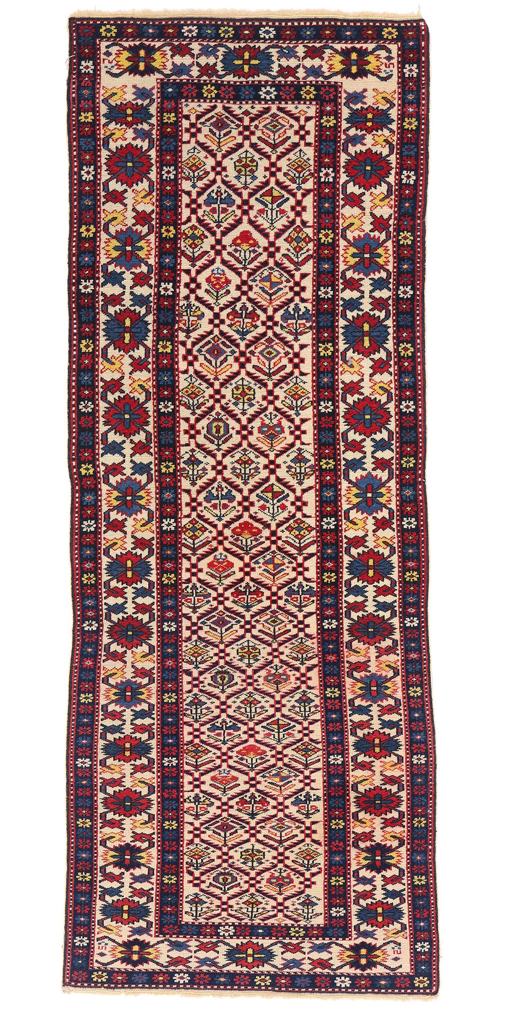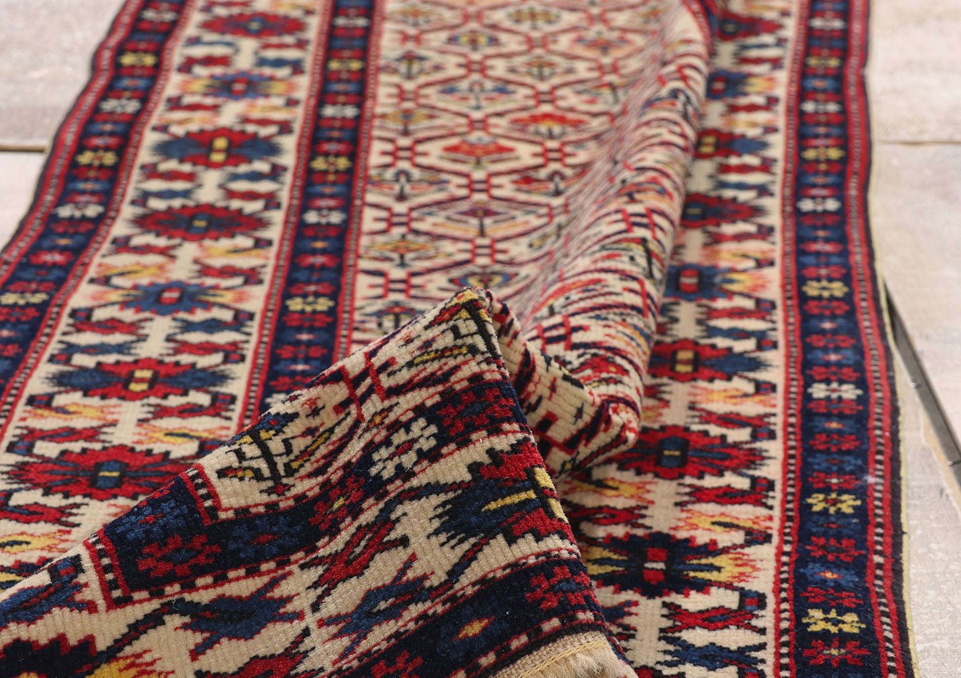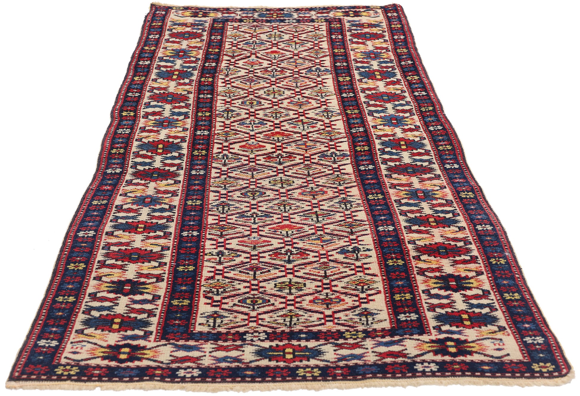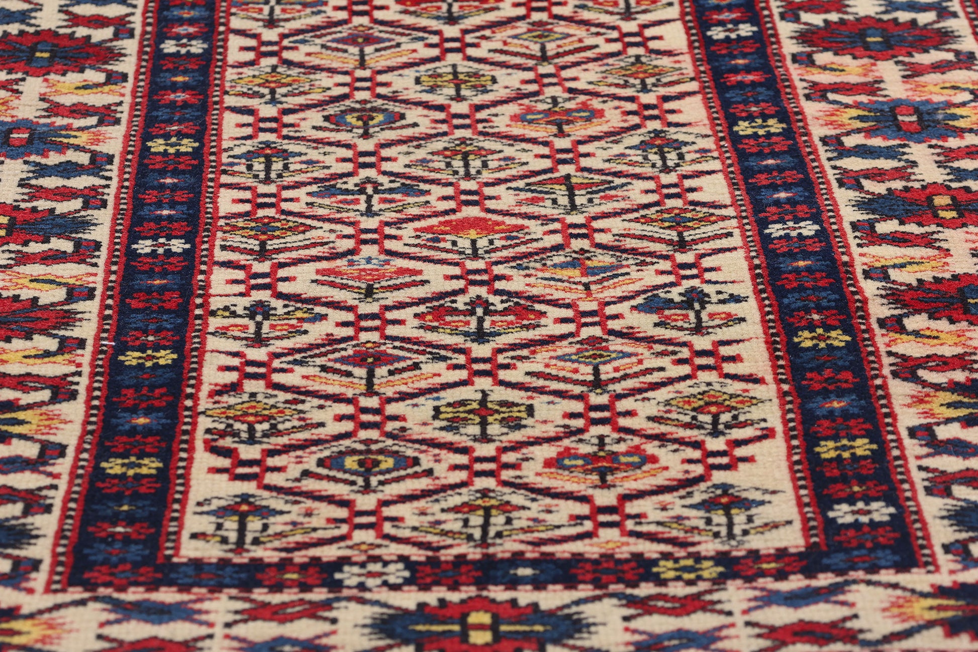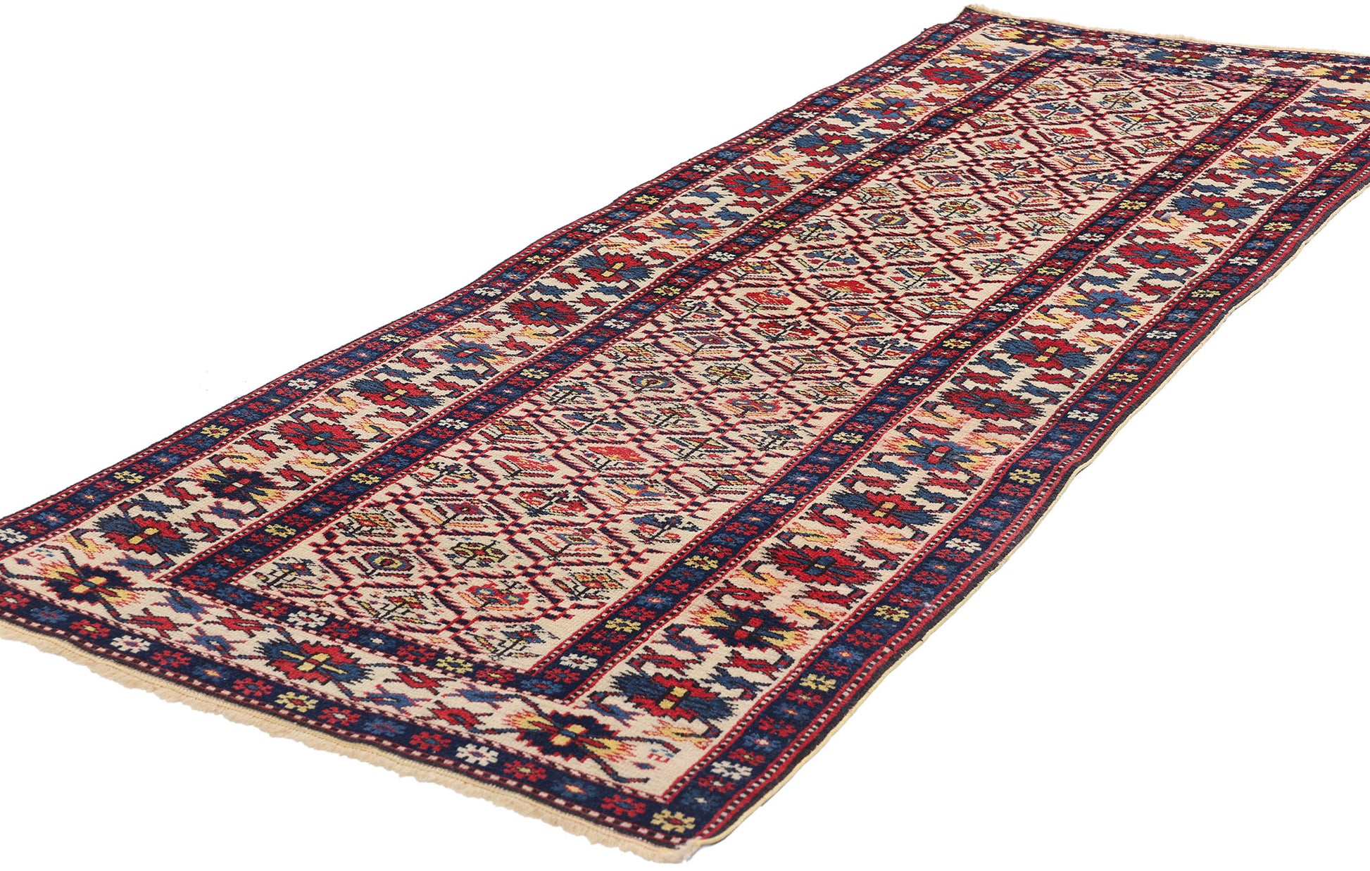 The Shirvan rug's radiant colors—deep blues, rich reds, and earthy golds—are punctuated by sharp contrasts and vivid accenting tones, bringing the design to life. Each floral element, meticulously woven, embodies the profound connection between the people and their environment, reflecting an understanding of nature’s cycles and a reverence for its beauty. The lush reds and blues symbolize vitality, while the bright yellow accents suggest the presence of warmth and light, enhancing the feeling of a flourishing, ever-renewing landscape. The way these colors interplay throughout the piece evokes a sense of movement, as if the flowers are blooming before your eyes, one petal unfolding after another.