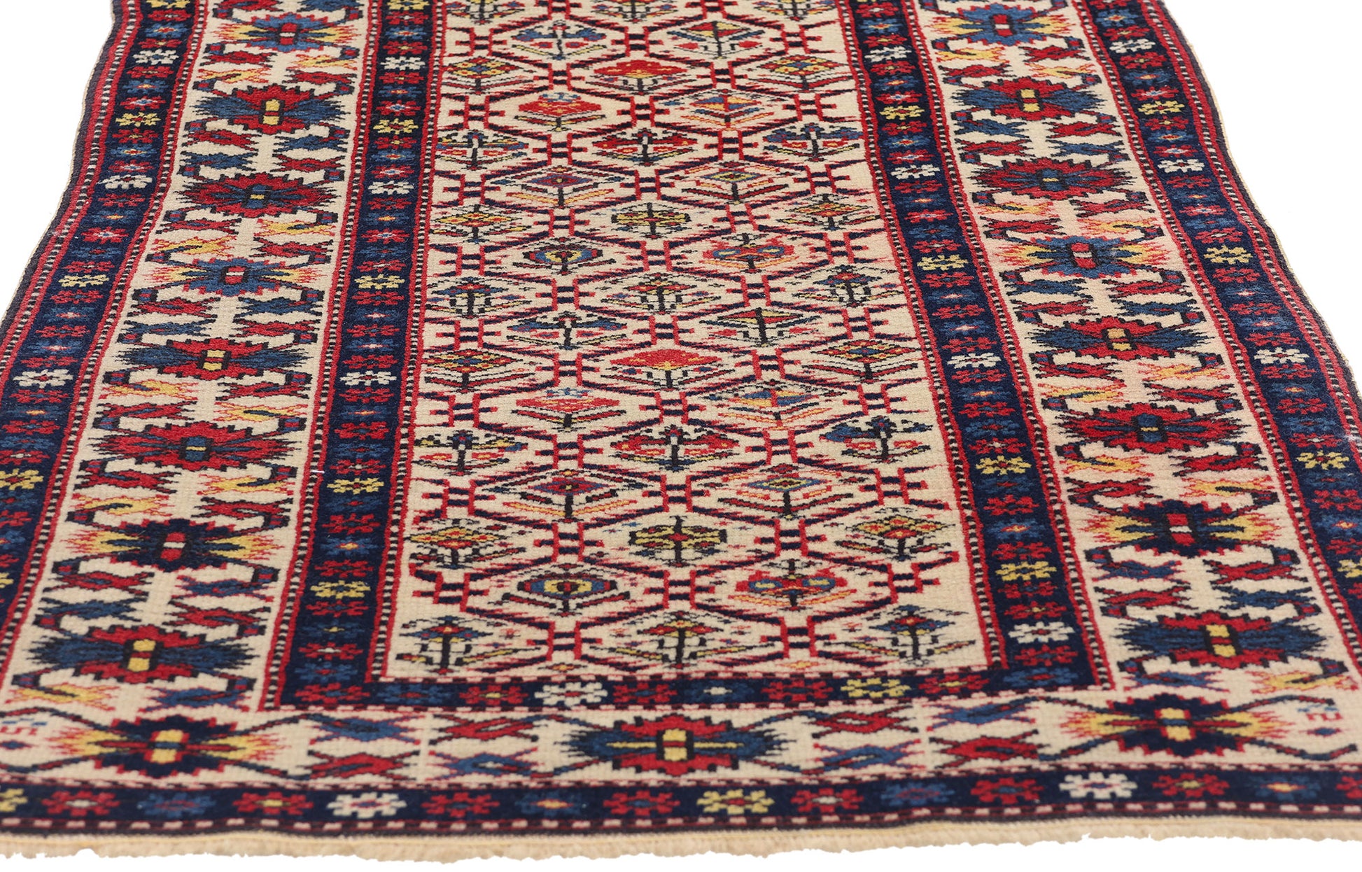 This hand-knotted wool antique Caucasian Shirvan rug runner, a striking piece from the Late 19th Century, is an exceptional testament to the artistry of the Caucasus region. Its field is a rich tableau of vibrant colors, showcasing a finely executed arrangement of geometric motifs, primarily composed of stylized floral patterns and repeating diamond shapes. The intricate design, composed with painstaking care, unfolds with a rhythmic elegance, drawing the eye into a mesmerizing dance of color and form. The central field, adorned with harmonious motifs, creates a dynamic yet balanced visual flow that echoes the beauty of the natural world.