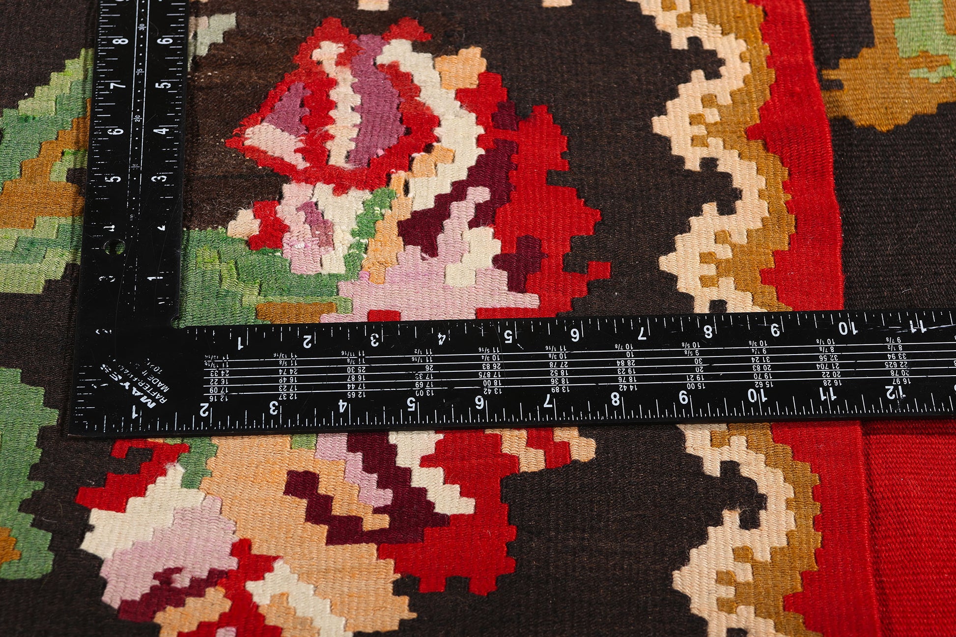 What distinguishes Karabagh kilims from their Balkan cousins or Persian peers is their unapologetic theatricality—opulent yet grounded, flamboyant yet composed. The deep coffee-brown ground serves as dramatic stagecraft, elevating the floral medallions into luminous forms that seem to hover with painterly flourish. And yet, despite its visual exuberance, this Caucasian flatweave rug maintains a classical discipline, with symmetry and balance guiding the eye from end to end. The rhythmic repetition of floral clusters echoes liturgical chant or folk refrain—an aesthetic tradition sung in wool and color. This duality—ornate yet ordered—is a testament to the sophisticated cultural synthesis that flourished in the Caucasus under both Ottoman and Russian sway.