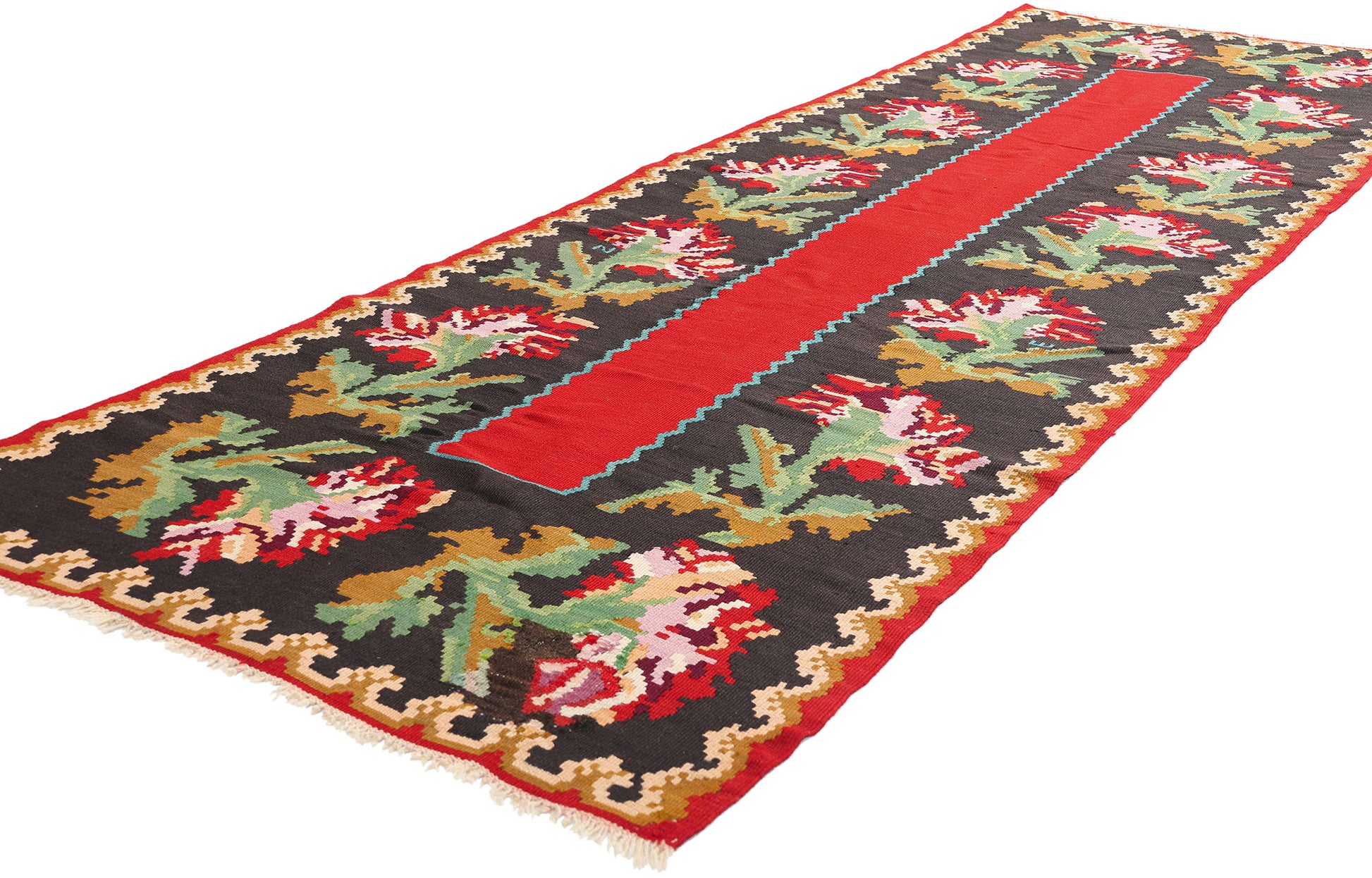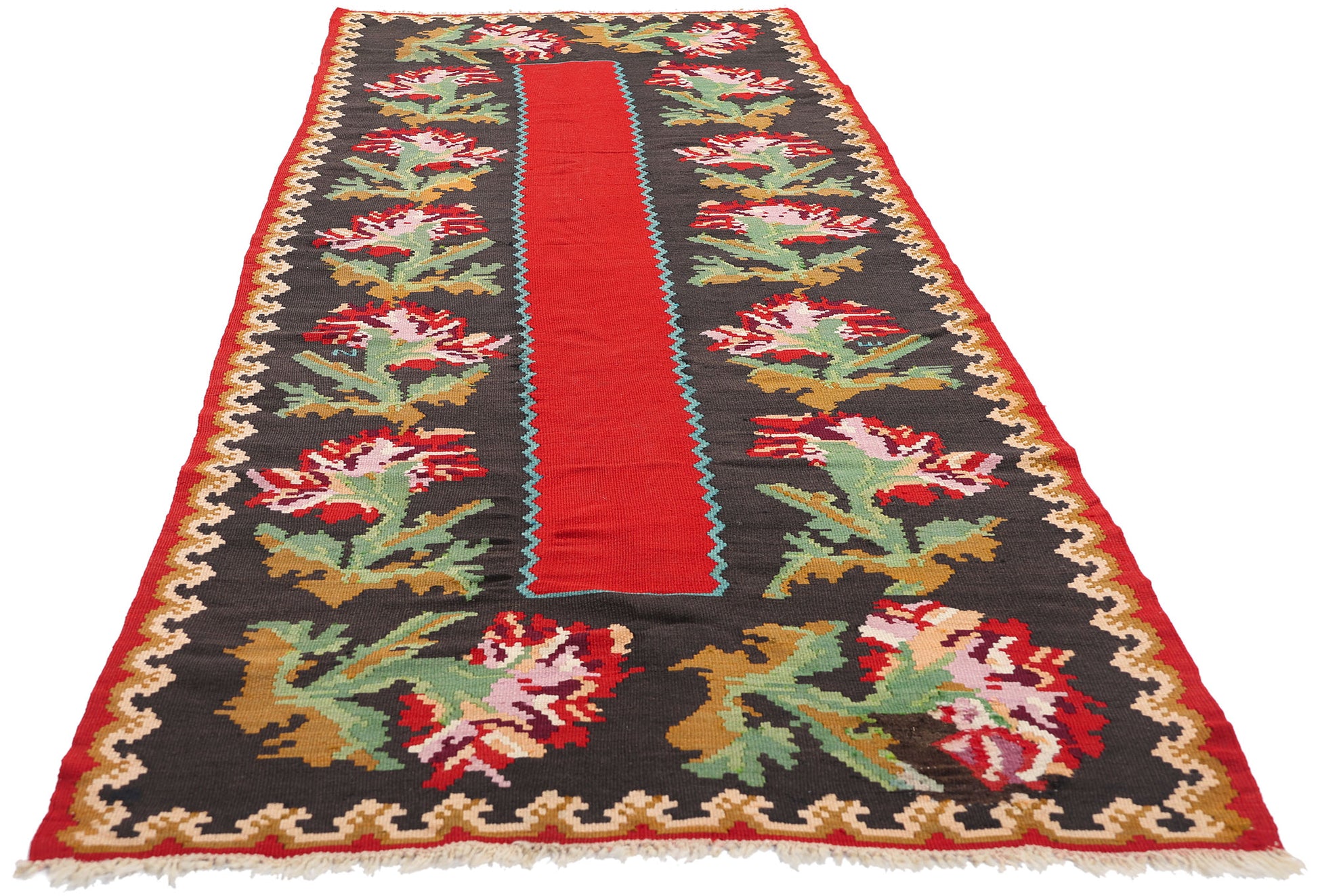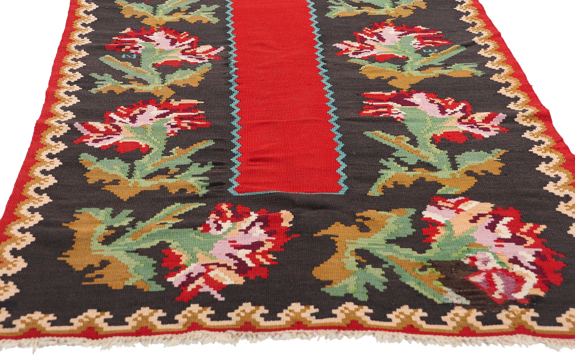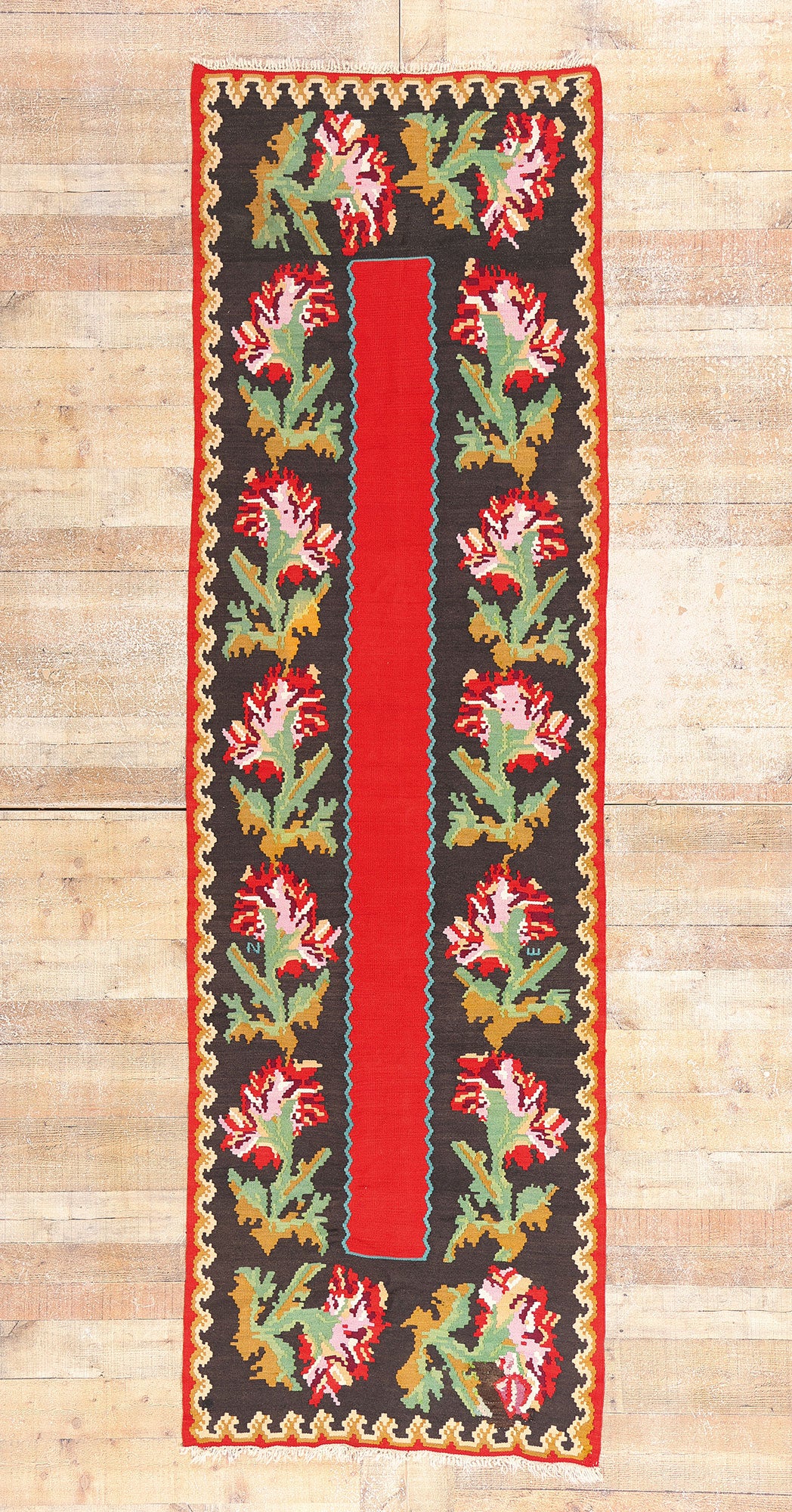 Like a woven bouquet from the mountains of the southern Caucasus, this handwoven wool antique Karabagh kilim runner blooms with the grandeur of roses shaped by both tradition and imperial fancy. Wrought in the Karabagh region—where Armenian and Azeri artisans alike plied their looms with rhythmic devotion—this runner captures the romantic flourish of 19th-century Russian-influenced floral design, translated into the angular dialect of flatweave design. The composition is anchored by a bold red panel, framed in undulating turquoise sawtooth chevron lines that ripple like a garden path bordered in dew. Surrounding this central field, flamboyant cabbage roses unfurl along both sides, their layered petals rendered in rich crimsons, tender pinks, and ivory, all nestling within a thicket of verdant, oak-like foliage.