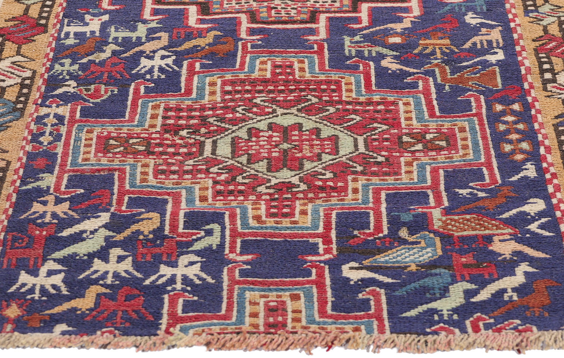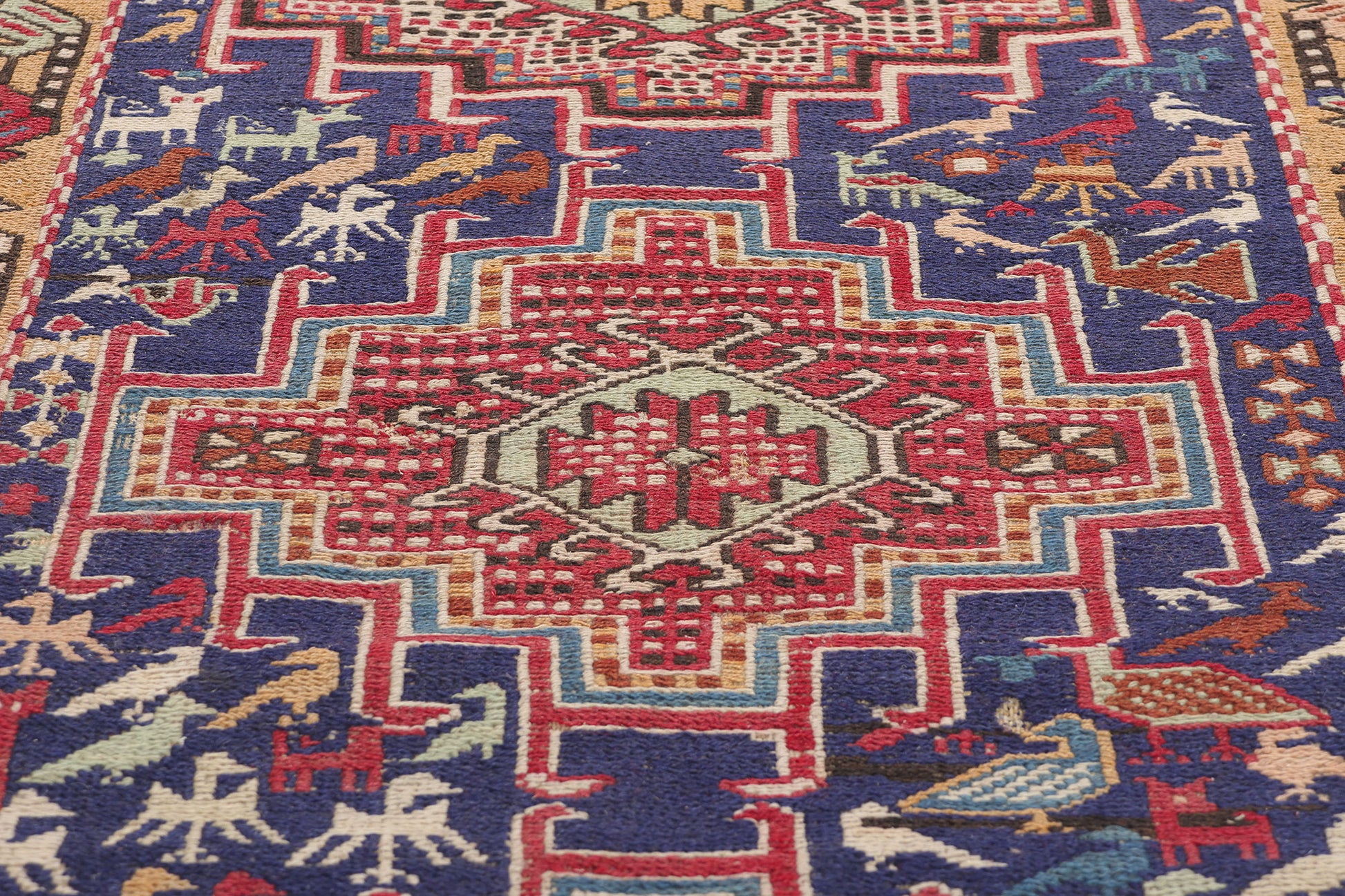 This enchanting handwoven wool antique Caucasian Soumak rug is a tableau of symbolic artistry and masterful weaving, steeped in the cultural traditions of the Caucasus region. The tribal rug's design centers around three bold latch hook medallions, known as the Wheel of Life, which symbolize the cyclical nature of man’s existence. These medallions, artfully woven in vibrant reds, beige, light green and pale orange, are adorned with sun symbols and pinwheels, each representing life, energy, and the passage of time. The dynamic nature of these ambiguous motifs is further accentuated by the lively blue field, which serves as a vibrant canvas for a menagerie of symbolic creatures and geometric motifs.