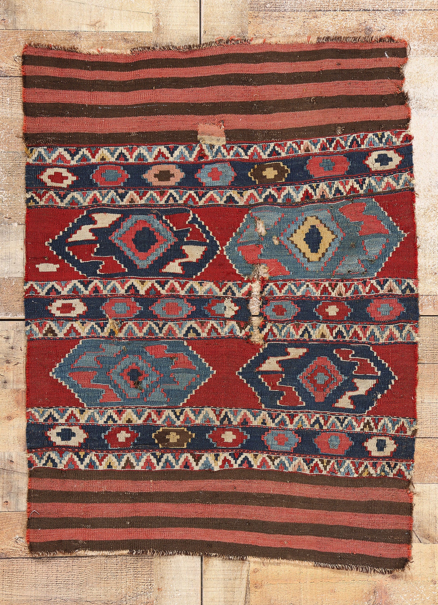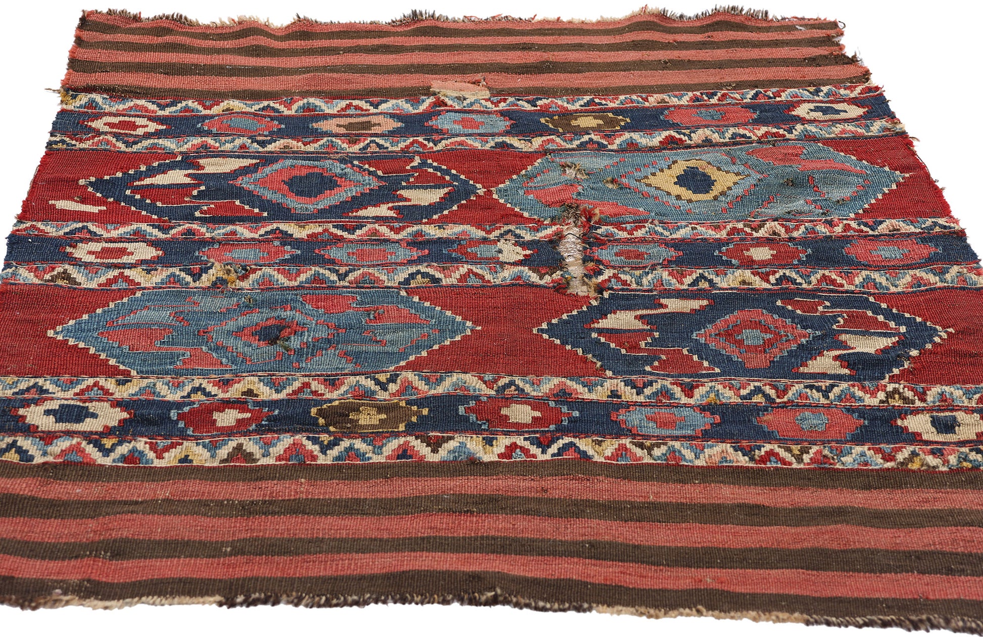This distressed antique Caucasian Shirvan kilim rug from the 1880's is more than just a piece of decor—it's a historical artifact rich with cultural significance. Its worn areas tell the story of a journey through time, elevating it as both a functional textile and a work of art. Whether displayed on the floor or as a wall hanging, this kilim brings with it a deep sense of history, nomadic elegance, and craftsmanship. Its imperfections are a testament to its resilience, making it a captivating piece that resonates with both collectors and those who appreciate the beauty of timeworn artistry.
