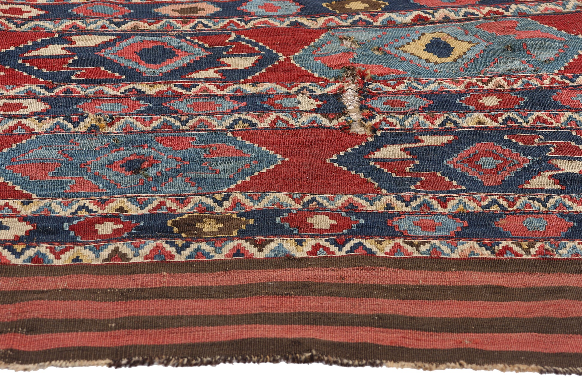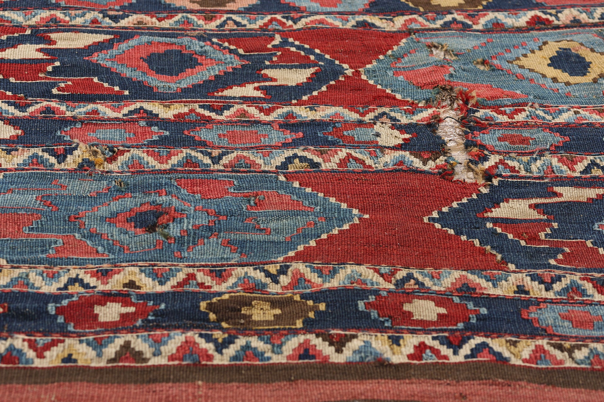 The color palette, achieved through the use of natural vegetable dyes, features deep reds, blues, and earthy tones that have softened with age, lending the antique Caucasian rug a warm, worn patina that enhances its antique allure. The areas of visible wear highlight its past, showing that this piece was not only decorative but functional in everyday life. Its flatweave construction, characteristic of Shirvan kilims, ensured its durability, allowing it to endure over a century of use while maintaining its structural integrity.