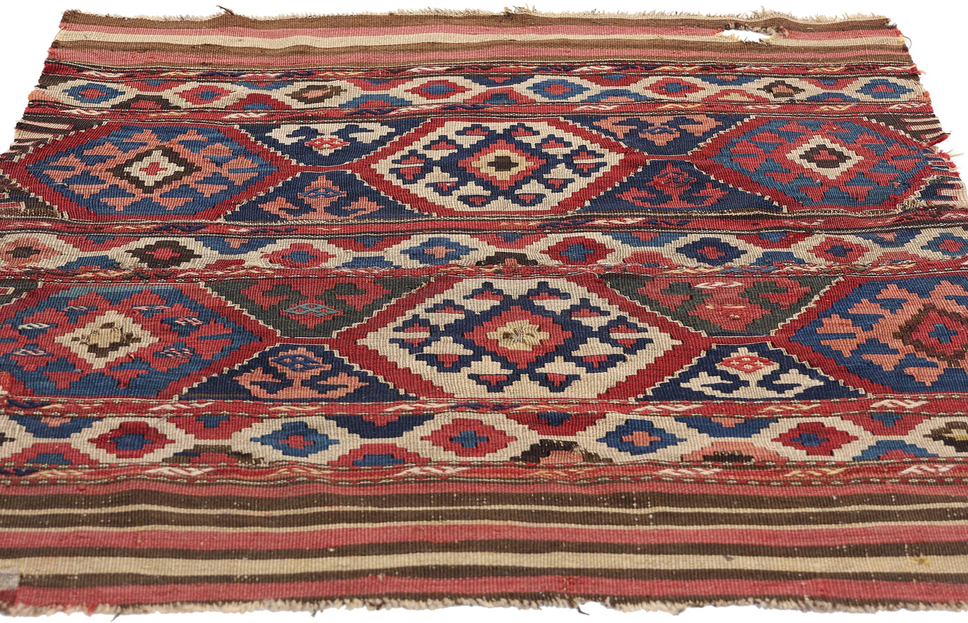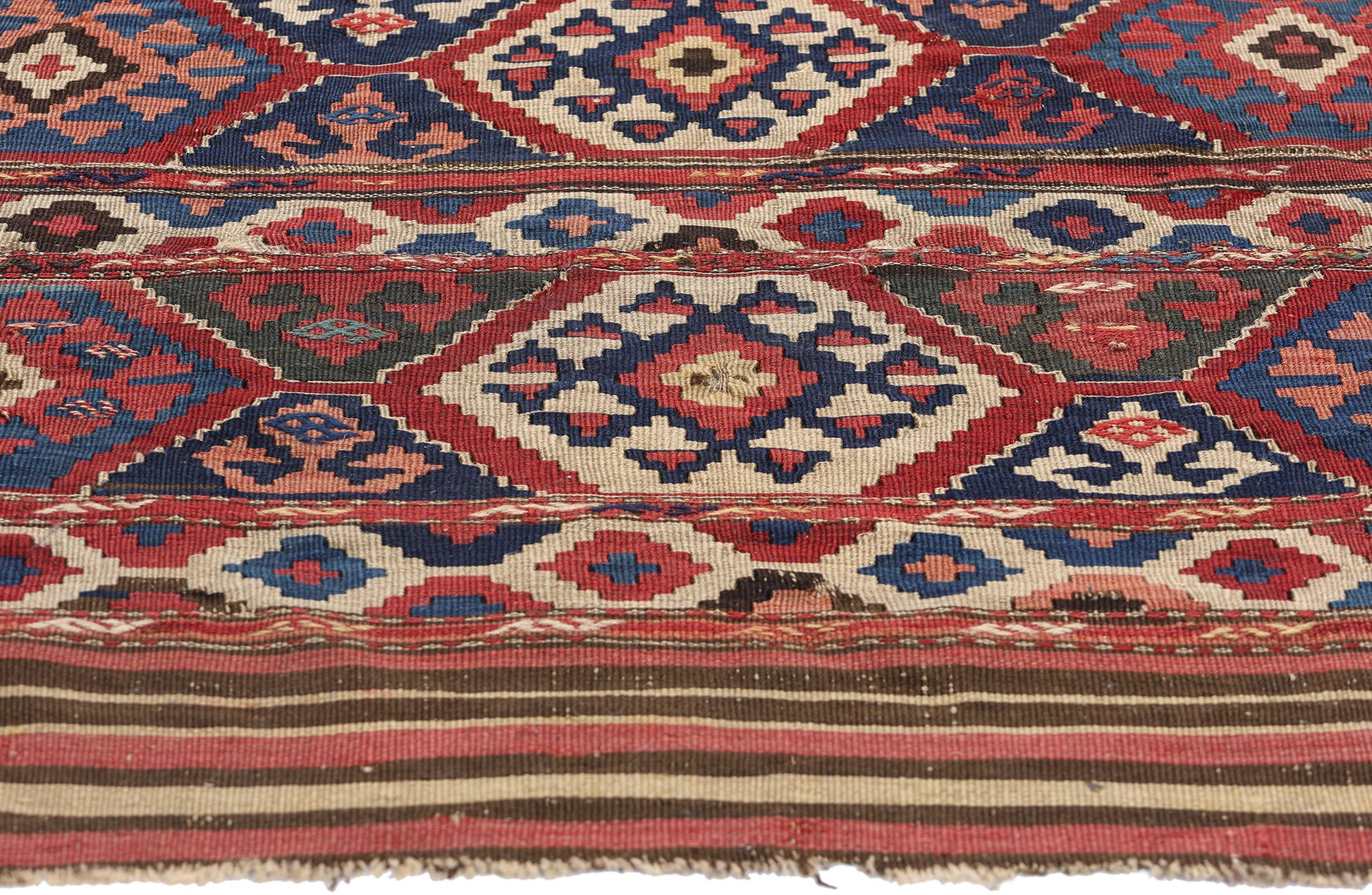 Embark on a compelling journey with this handwoven wool distressed antique Caucasian Shirvan kilim rug from the late 19th century, a piece that exudes the rugged beauty and nomadic charm of the Shirvan weaving tradition. This weathered tribal kilim, with its vibrant colors and intricate designs, tells the story of a people deeply connected to the land and to their heritage. The allover geometric design, composed of wide and narrow horizontal bands, is decorated with a variety of ambiguous motifs and tribal symbols that speak to the Shirvan people’s beliefs in protection, fertility, and good fortune.