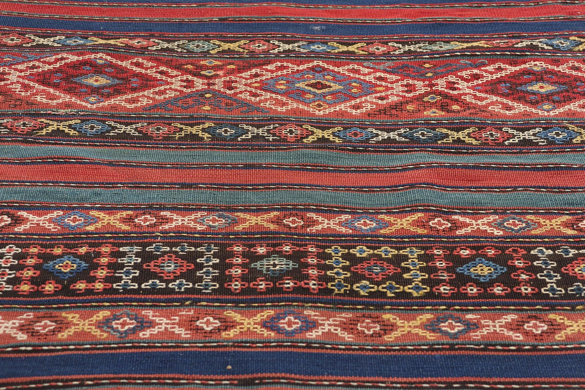 The Caucasian flatweave rug is a symphony of vivid earth tones, with bold reds, deep indigo blues, and refreshing accents of green and ivory flowing in horizontal bands across its length. The central motifs are intricately patterned diamonds, crosses, and stylized flowers, symbols of protection and prosperity, all set within a framework of alternating stripes. These motifs are not just decorative but carry meanings linked to the Shahsavan's beliefs in fertility, spiritual guardianship, and their connection to nature. The linear composition of the bands is a hallmark of Shahsavan weaving, reflecting the structured beauty of their designs, which balance symmetry and detail.