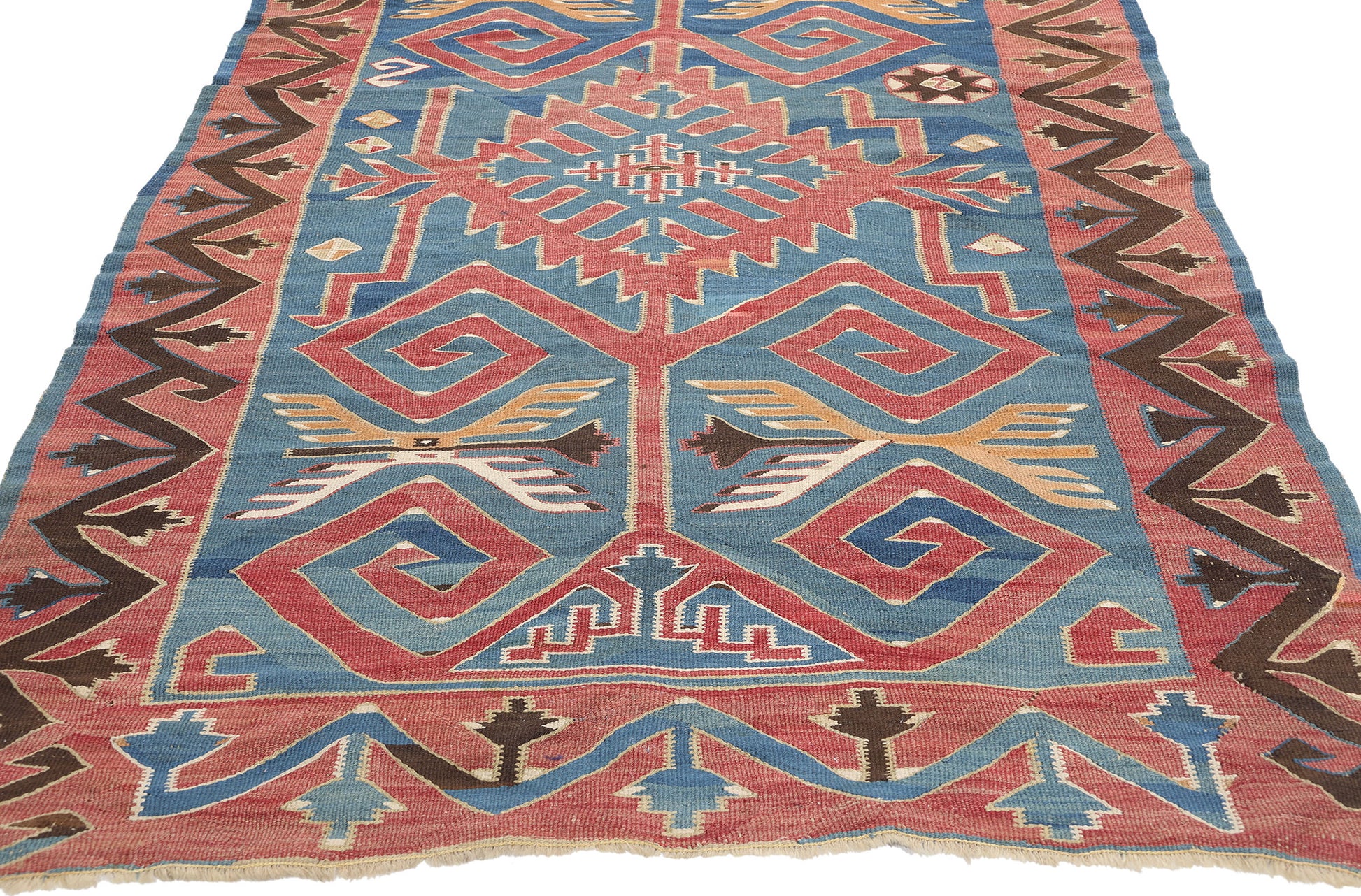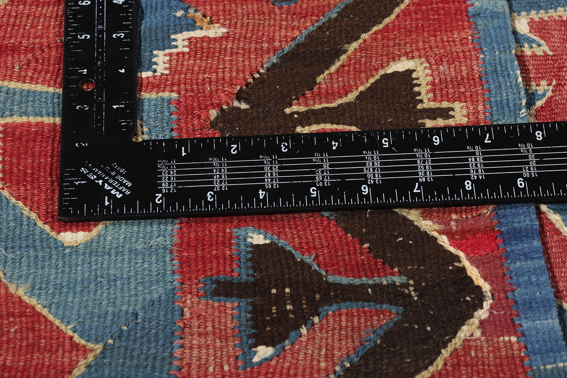 This handwoven wool Caucasian Avar Kilim rug from the late 19th century is a striking example of tribal artistry, hailing from the rugged northern Caucasus region. Dating to the 1880's, it showcases the Avar weavers’ rich tradition of creating bold, geometric motifs that have captivated collectors for generations. The Caucasian kilim rug’s vibrant color palette—featuring a beautiful interplay of deep reds, blues, ochres, and earthy browns—reflects the natural dyes and materials available to the weavers in their mountainous homeland. The intricate patterns are skillfully woven, a testament to the expert craftsmanship passed down through Avar weaving communities.