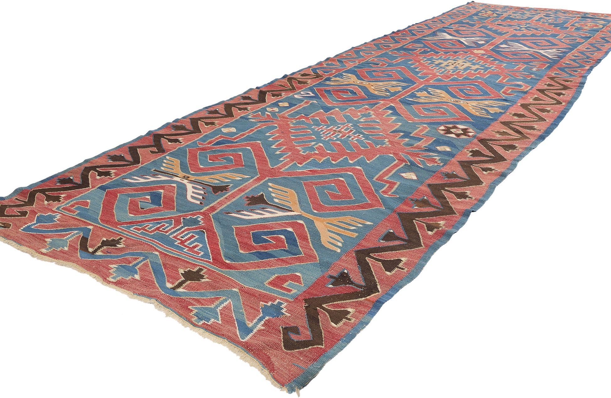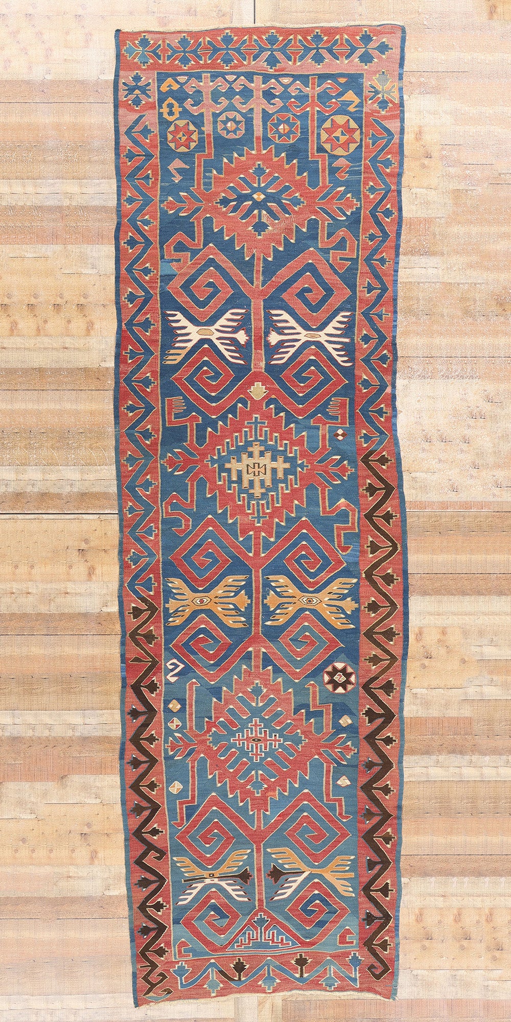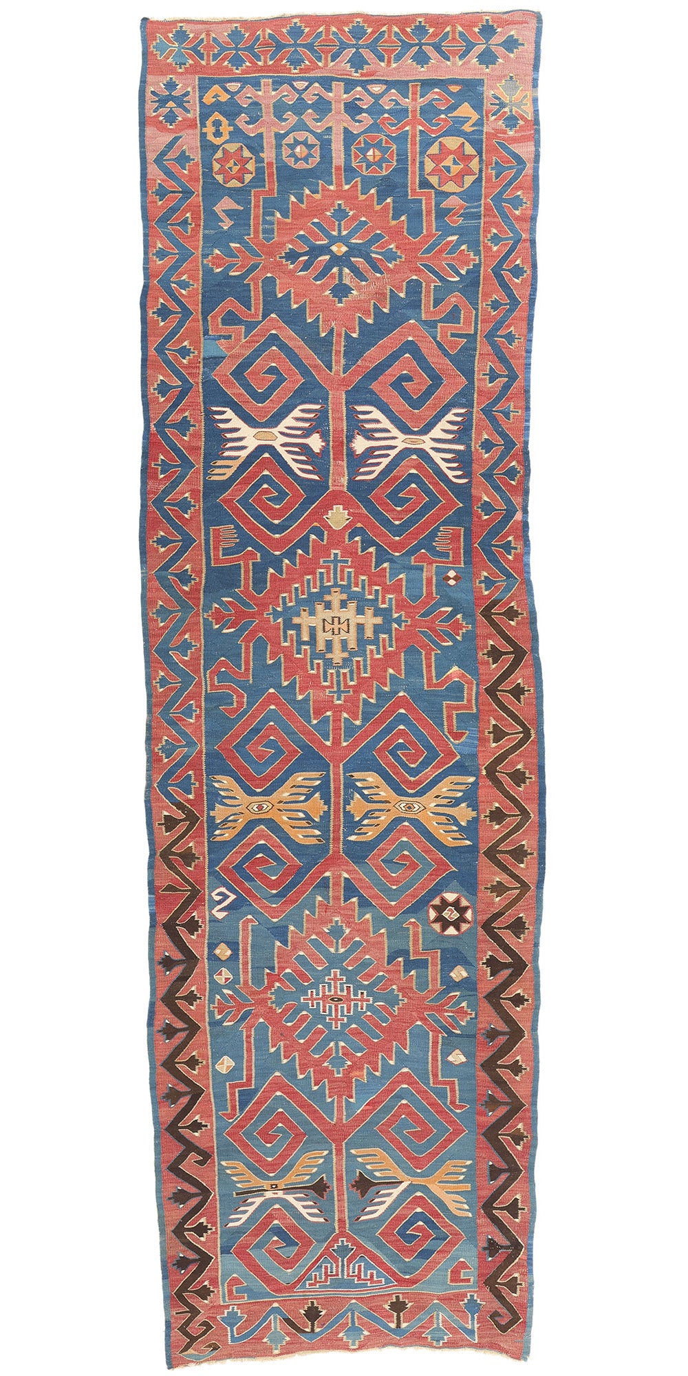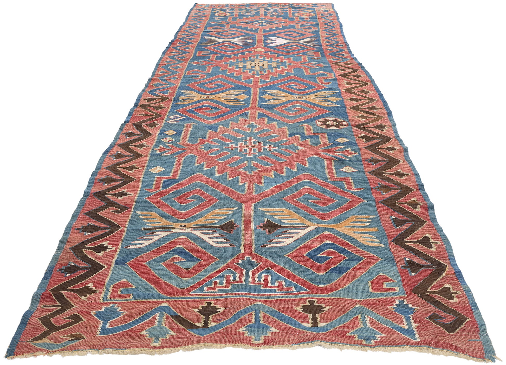 What makes this particular piece exceptionally rare is its grand size, measuring approximately 4 feet by 14 feet. Most Avar kilims are typically produced in smaller, more manageable sizes for household use, making a runner of this magnitude a remarkable find. Its generous length would have been ideal for use in a grand hallway or communal gathering space, underscoring its importance in the context of Caucasian tribal life. Such large-format kilims were often reserved for special commissions or occasions, making this a significant piece not only for its size but also for the care that would have gone into its creation.