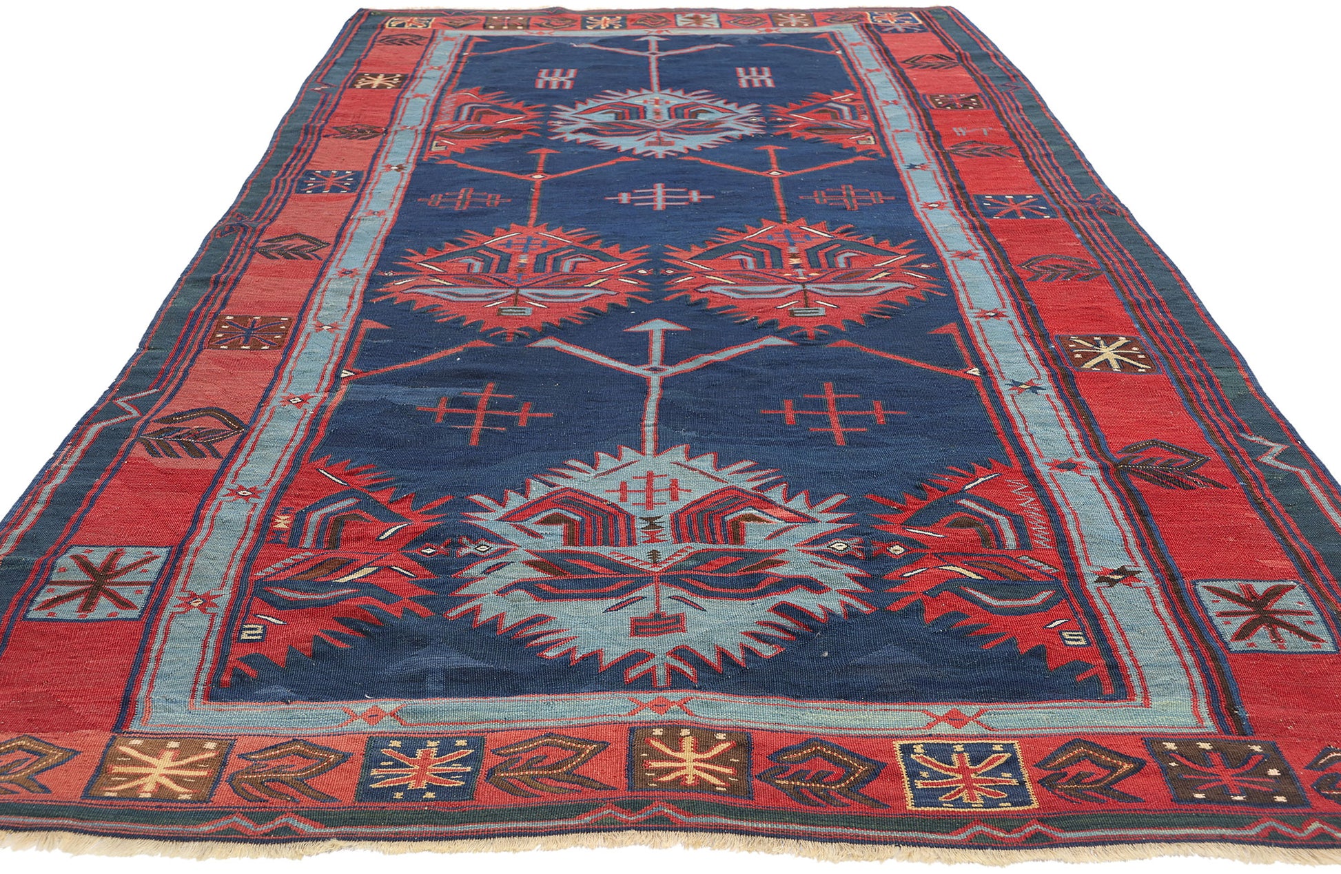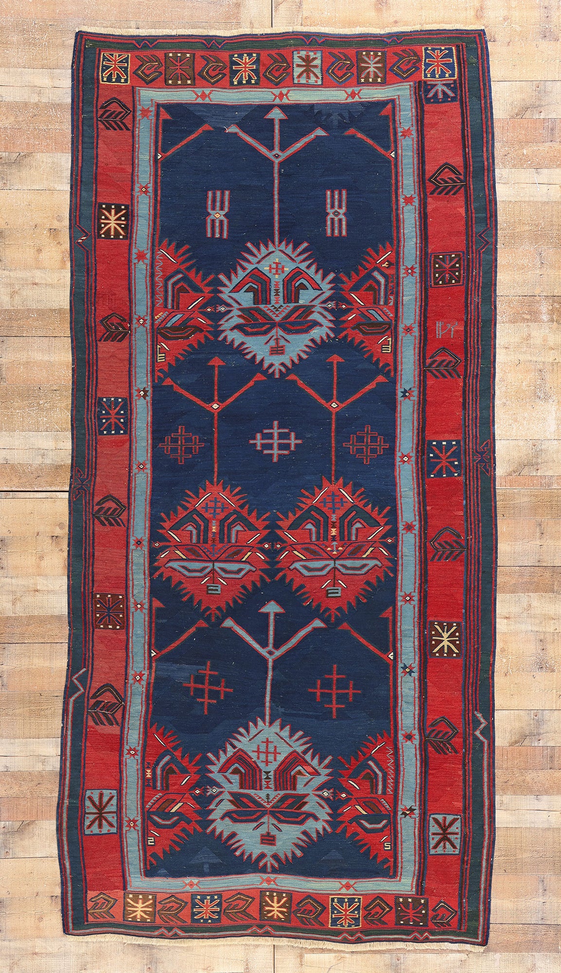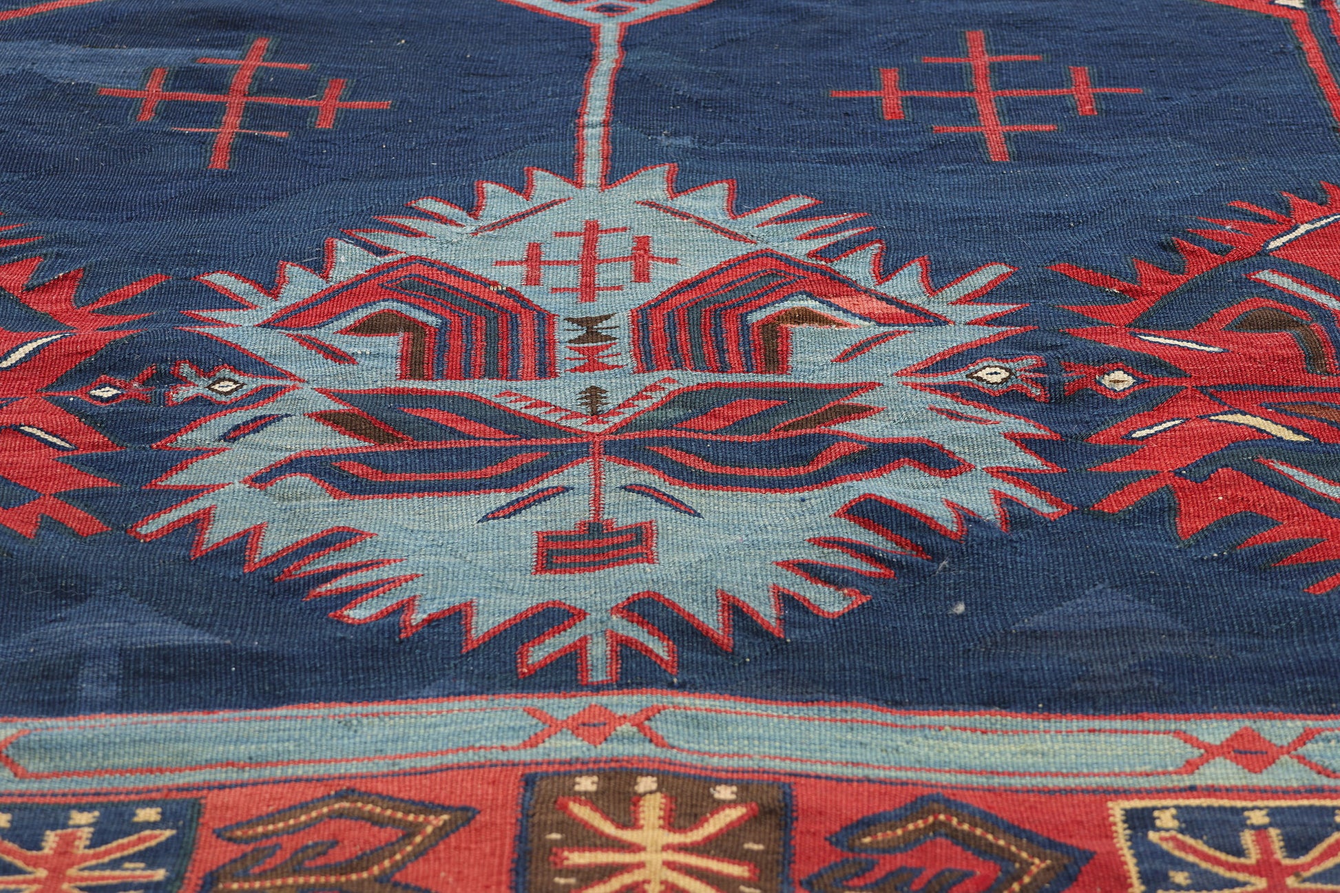 This handwoven wool antique Caucasian Avar kilim rug, crafted by the Avar people of the Dagestan region, is a striking testament to the bold geometric designs and deep symbolism inherent in Caucasian tribal weavings from the Late 19th Century. The Avars, one of the major ethnic groups in the northern Caucasus, are known for their distinctive kilims that combine vibrant color palettes with geometric motifs deeply rooted in their cultural heritage. This piece, with its dramatic contrast of indigo blues and fiery reds, presents a vivid visual narrative of protection, strength, and connection to the natural world.