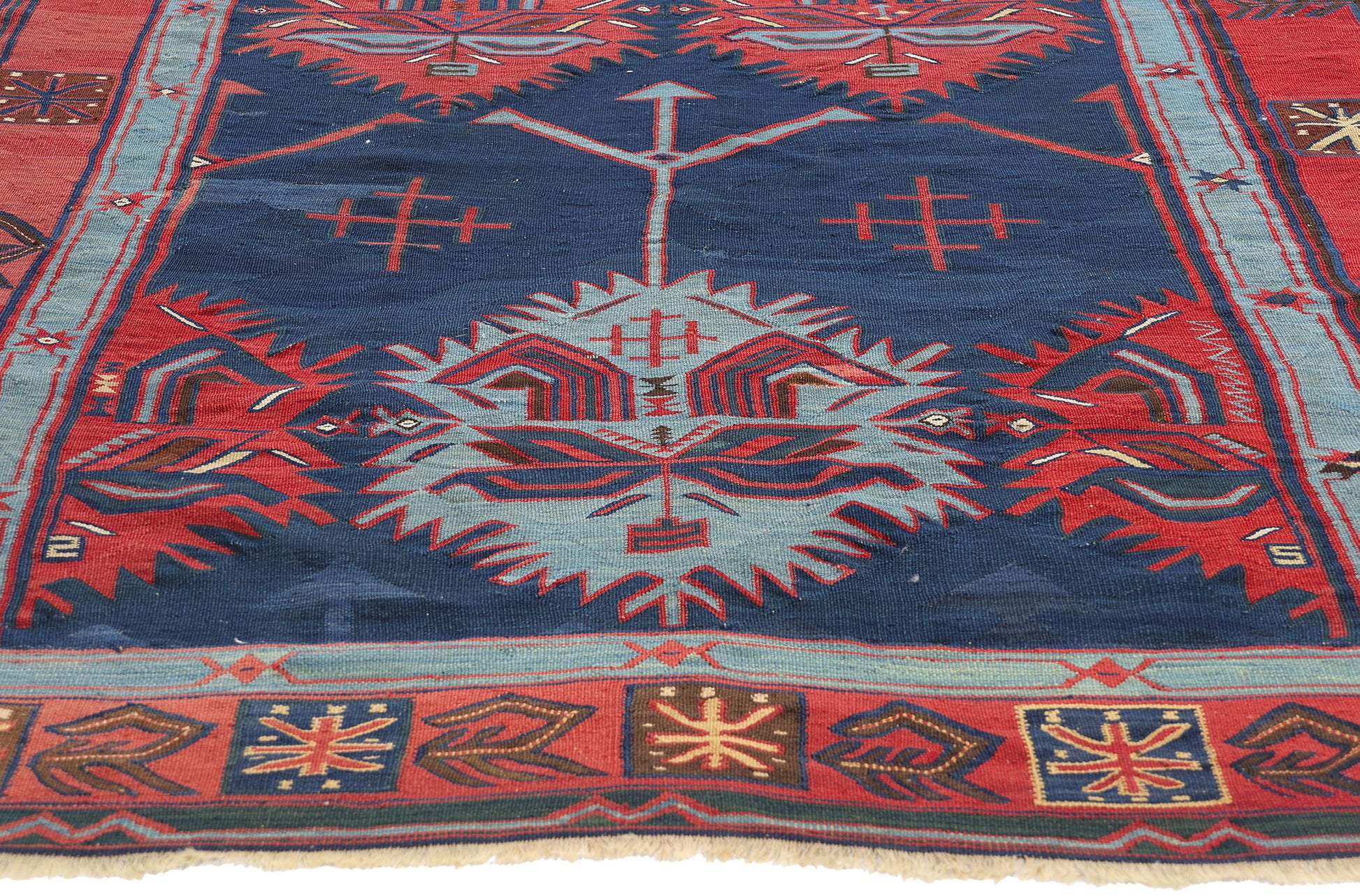 The main border of the rug is adorned with symbolic star and cross motifs, each carefully placed to enhance the central field's protective symbolism. These patterns are not merely decorative; they serve as talismanic symbols, representing balance, harmony, and spiritual safeguarding. The repeating forms create a rhythmic flow around the flatweave rug, reinforcing the themes of continuity and strength. The vibrant red border, offset by the deep indigo field, provides a striking contrast that encapsulates the dynamic energy of Caucasian tribal artistry.