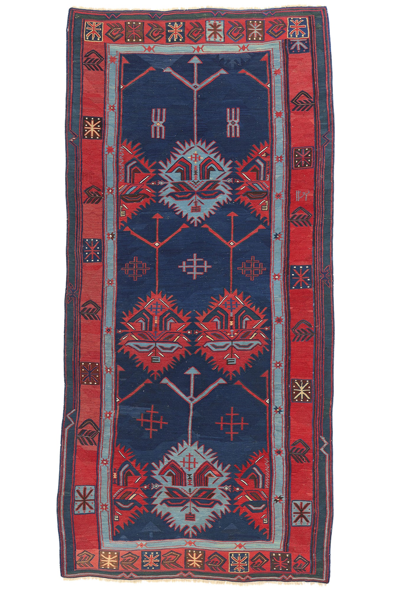 At the heart of this kilim are the powerful serrated medallions and arrow-like motifs, which dominate the field. These symbols are often interpreted as representations of protection, embodying the Avars' deep respect for nature and their spiritual beliefs. The serrated designs radiate energy and light, serving as guardians of the household, while the arrow motifs, pointing upward, symbolize direction, purpose, and spiritual ascent. The geometric precision of the tribal motifs, paired with their bold red and blue coloring, reflects the rugged landscapes and resilient character of the Avar people.