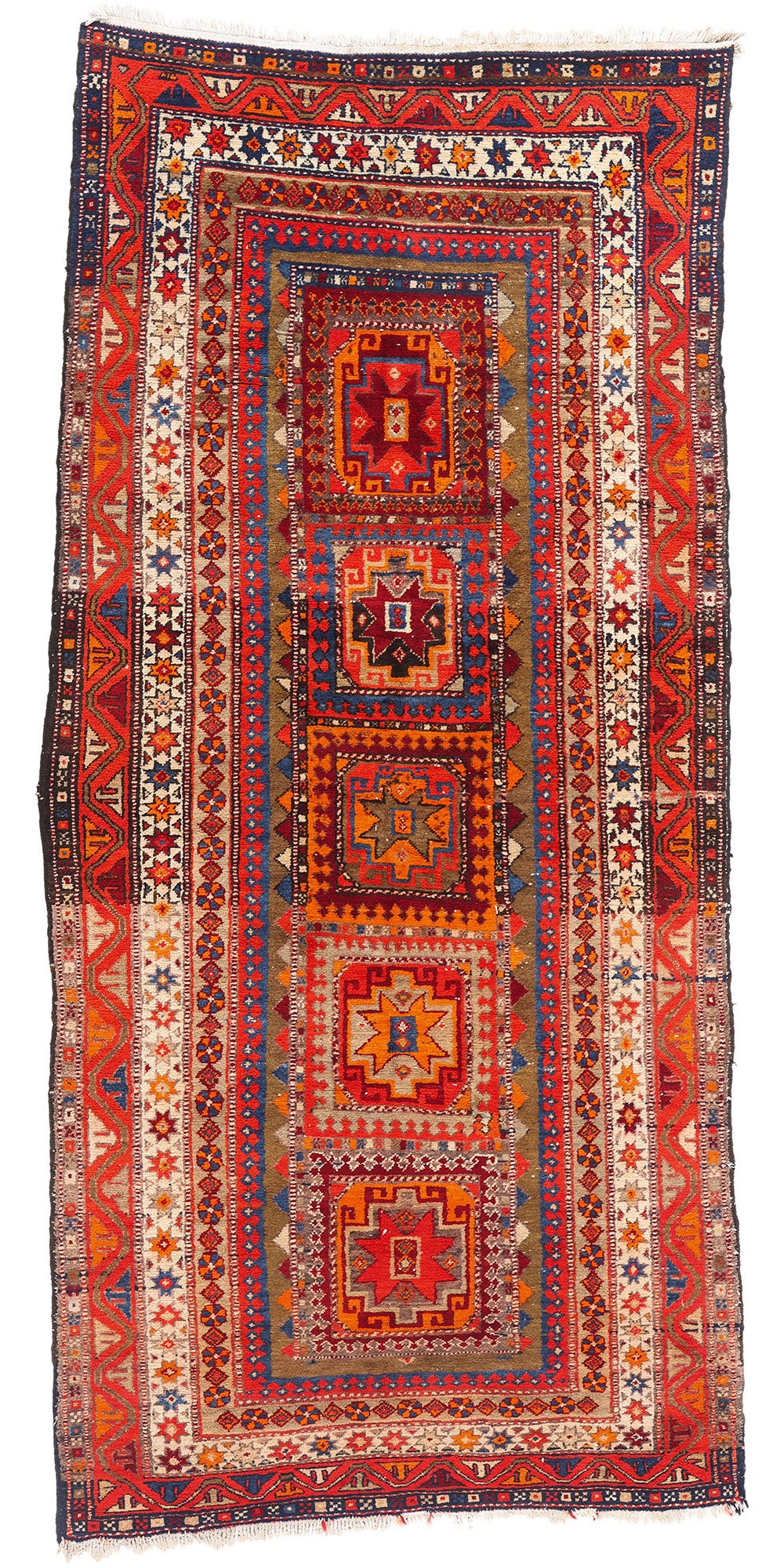 This hand-knotted wool antique Caucasian Kazak rug is a captivating window into the artistic soul of the Caucasus region. Its mesmerizing compartmental design, composed of five striking square panels, draws the eye and spirit alike. Each panel showcases the Star of Wisdom motif, an enduring emblem often associated with Caucasian Lesghi rugs, but also revered and adopted by numerous other tribes. This powerful symbol, with its complex geometry and deep-rooted cultural significance, reflects aspirations of enlightenment, guidance, and clarity, offering a connection to centuries-old traditions that continue to resonate.