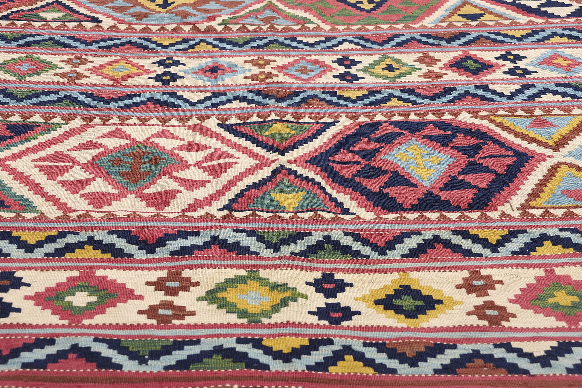 This exquisite handwoven wool antique Caucasian Shirvan kilim rug, crafted by the master weavers of the Shirvan region in the southern Caucasus, is a brilliant display of tribal artistry and craftsmanship. With its dynamic interplay of vibrant geometric motifs, this antique Caucasian kilim is a testament to the deep cultural heritage and artistic traditions of the nomadic weavers. The rug’s striking use of color—bold reds, deep blues, greens, and soft beige—interwoven with intricate patterns, creates a lively composition that commands attention while telling a story steeped in tradition.