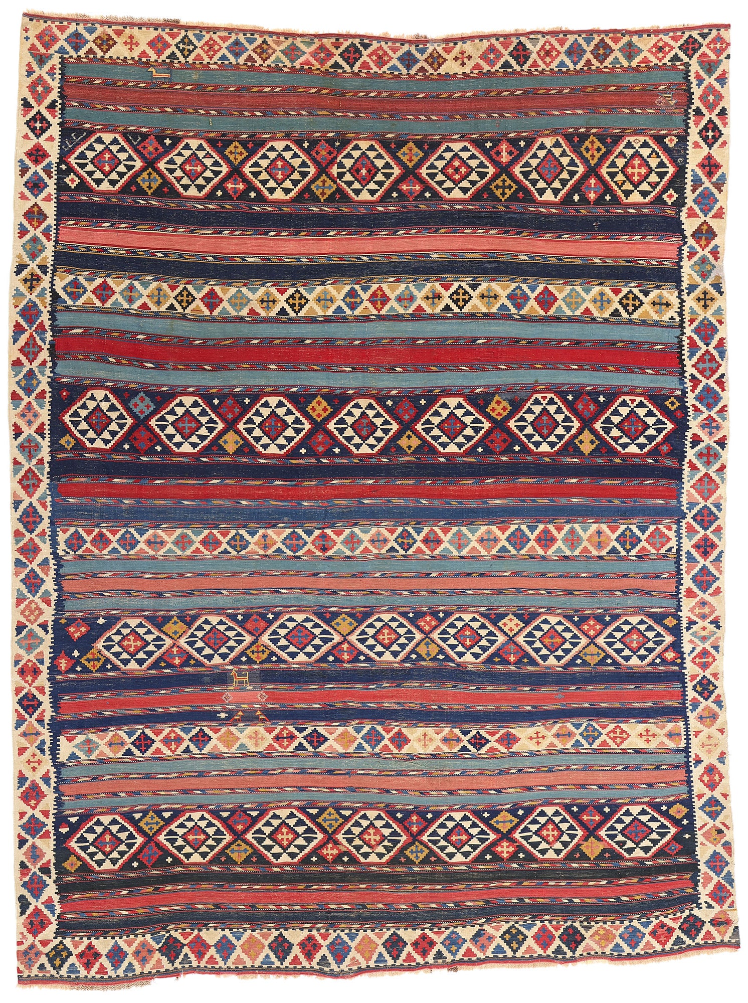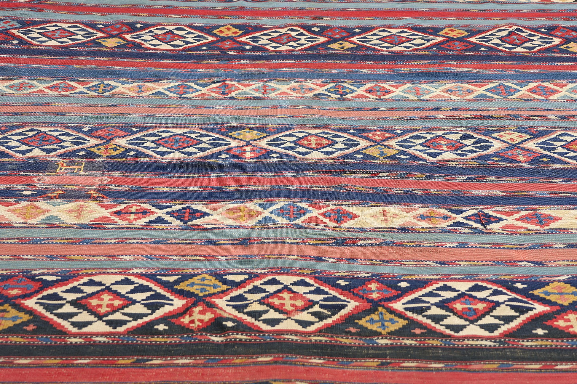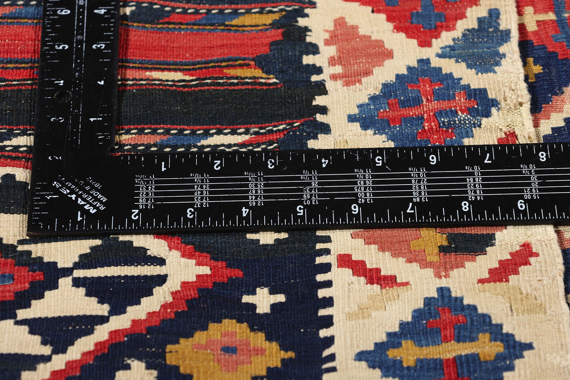 Whether used as a floor covering or as a decorative wall hanging, this antique Caucasian Shirvan kilim rug is more than just a textile; it is a piece of history. The symbolic motifs and vibrant colors reflect the values and beliefs of the Shirvan nomads, while the craftsmanship and artistry speak to a time when rugs were not only functional but also deeply personal expressions of cultural identity. This Late 19th Century Caucasian kilim invites warmth, history, and nomadic charm into any space, making it a treasured piece for collectors and enthusiasts of antique tribal rugs. Its bold designs and harmonious color palette ensure that it remains a captivating work of art that transcends time and place.