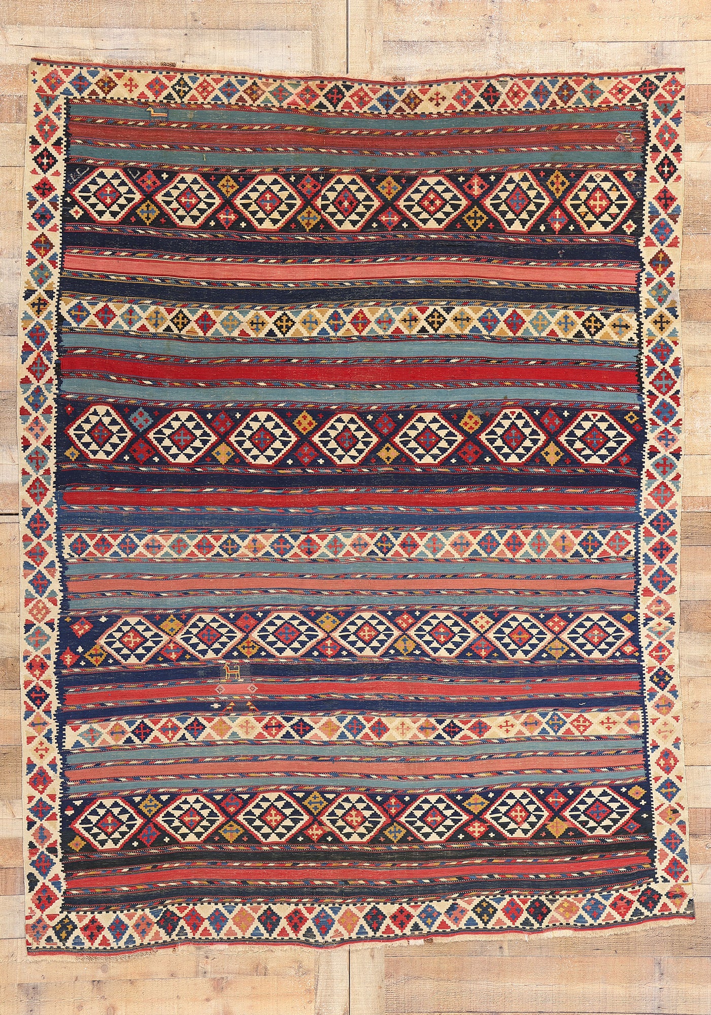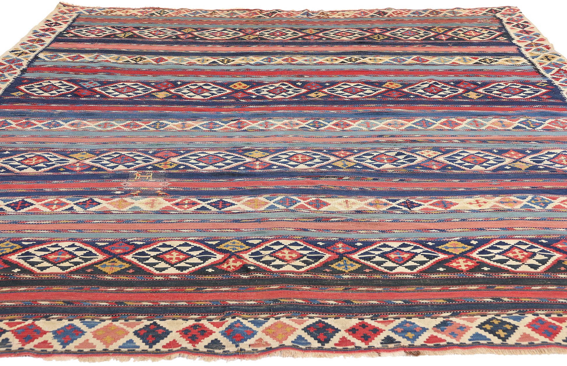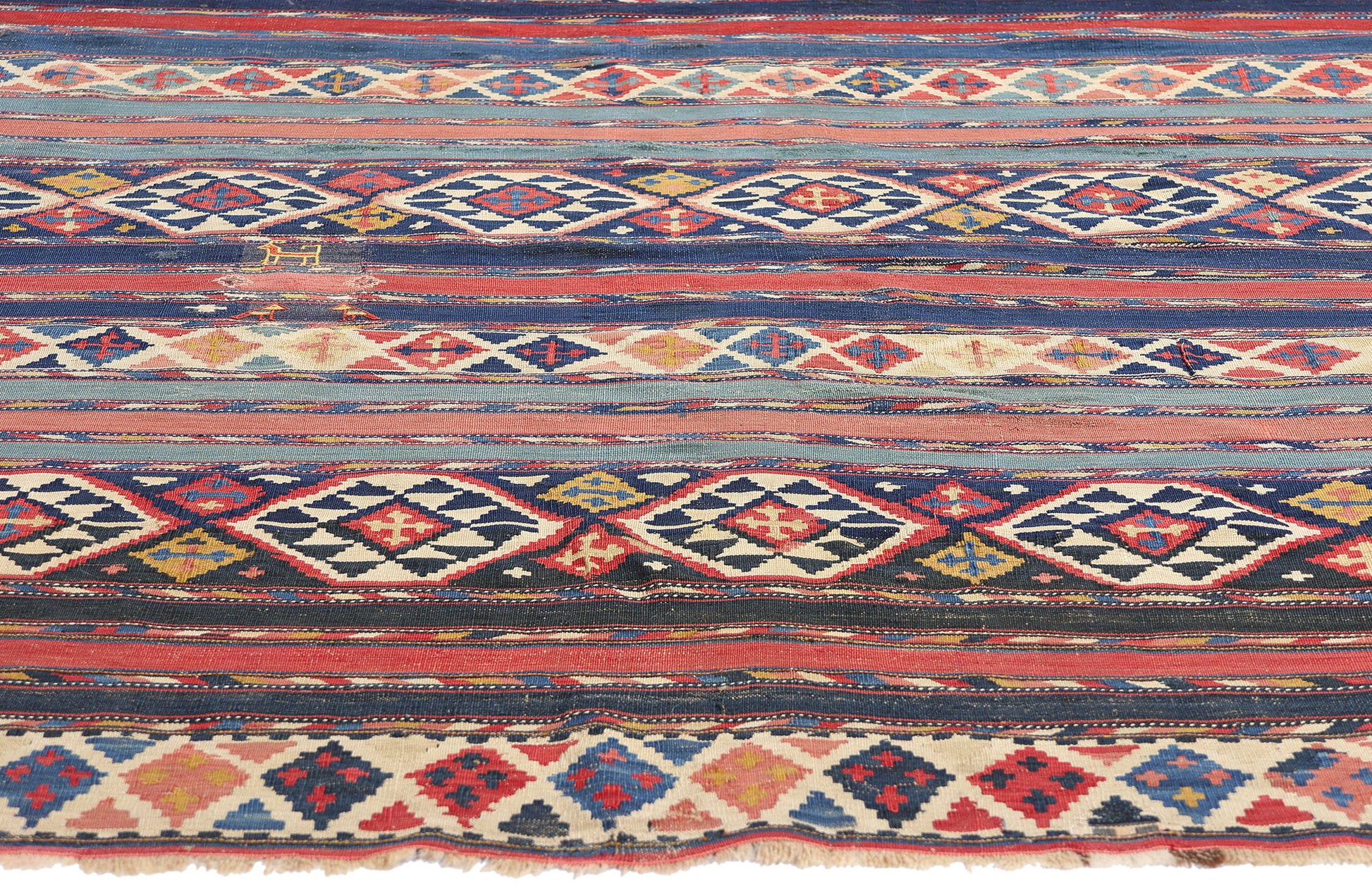 This handwoven wool antique Caucasian Shirvan kilim rug, crafted in the southern Caucasus during the late 19th century, is a remarkable representation of the rich weaving tradition of the Shirvan region. Renowned for their intricate geometric patterns and vibrant use of color, Shirvan kilims are highly prized for their bold designs and symbolic motifs, which reflect the beliefs and lifestyles of the nomadic tribes who created them. This particular Caucasian kilim is no exception, with its striking arrangement of diamonds, stripes, and vibrant colors that bring a sense of movement and energy to the piece.
