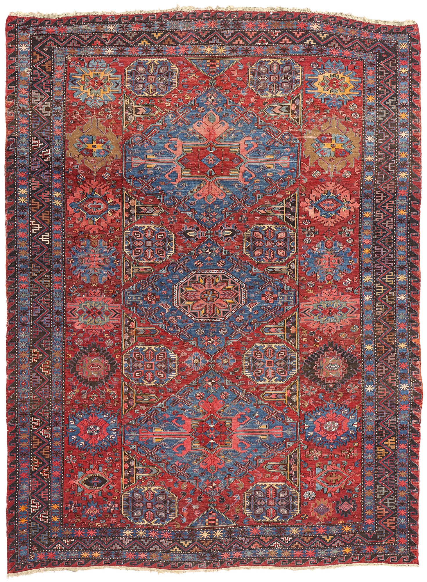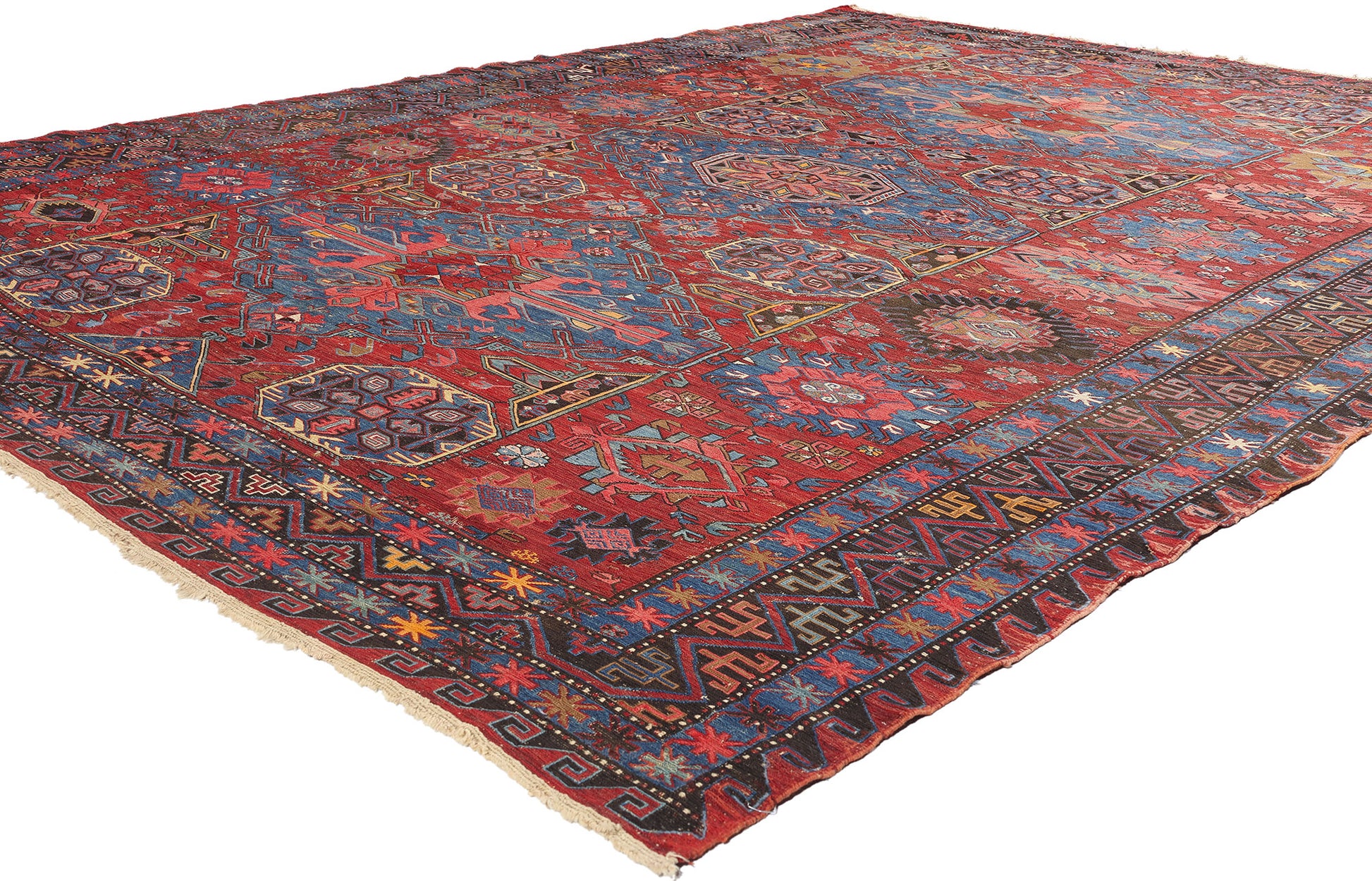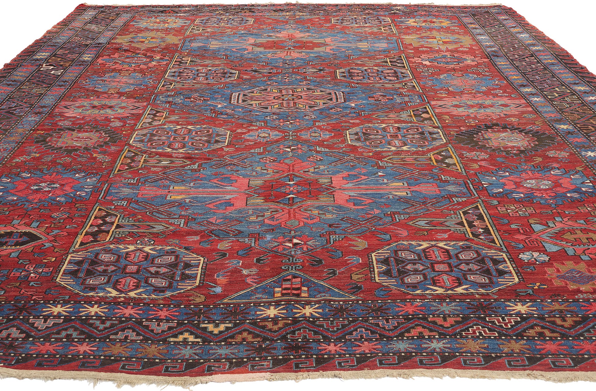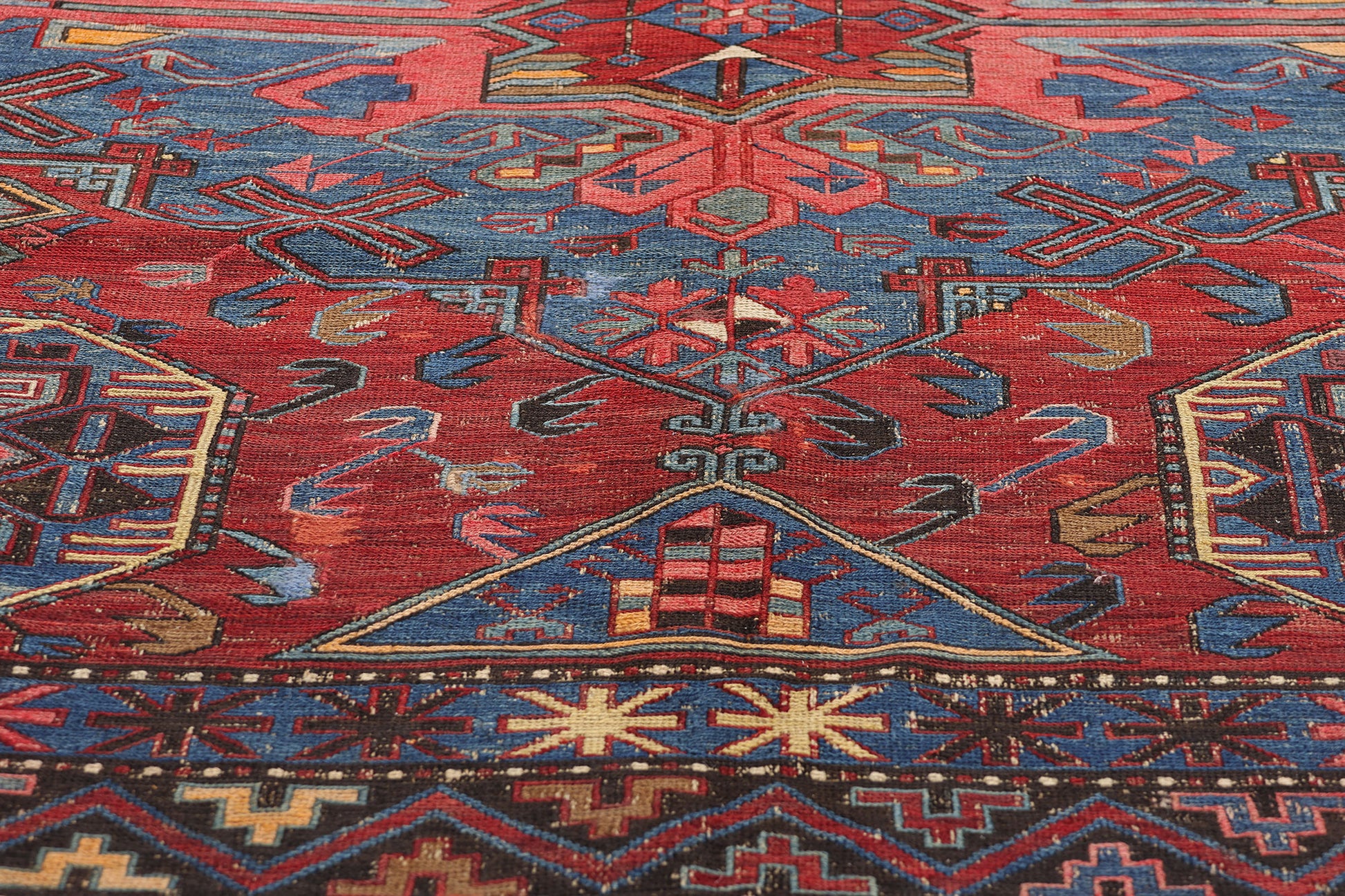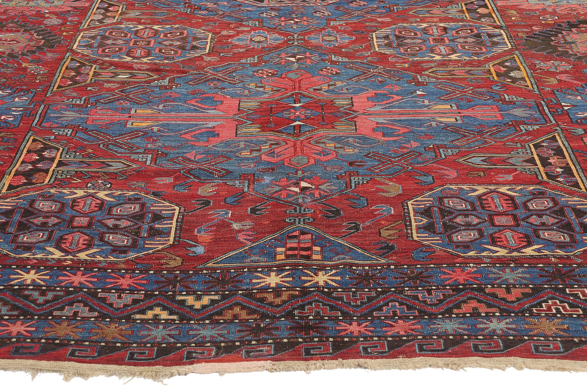 This enchanting antique Caucasian Soumak rug, handwoven from wool, exemplifies the artisanal artistry and intricate craftsmanship for which the Soumak style is renowned. With its visually captivating woven technique, the Caucasian Soumak rug features a striking palette of deep reds, sky blues, and rich earth tones, elegantly arranged in bold geometric patterns. Its design highlights three large central medallions surrounded by intricate octagonal motifs and star-shaped medallions, all accentuated by intricate tribal symbols. The esoteric tribal border of the rug is as impressive as the field, with its densely packed smaller geometric pattern of Bereket motifs and stylized stars, creating a balanced and harmonious composition. A running dog outer guard band adds the finishing touch.