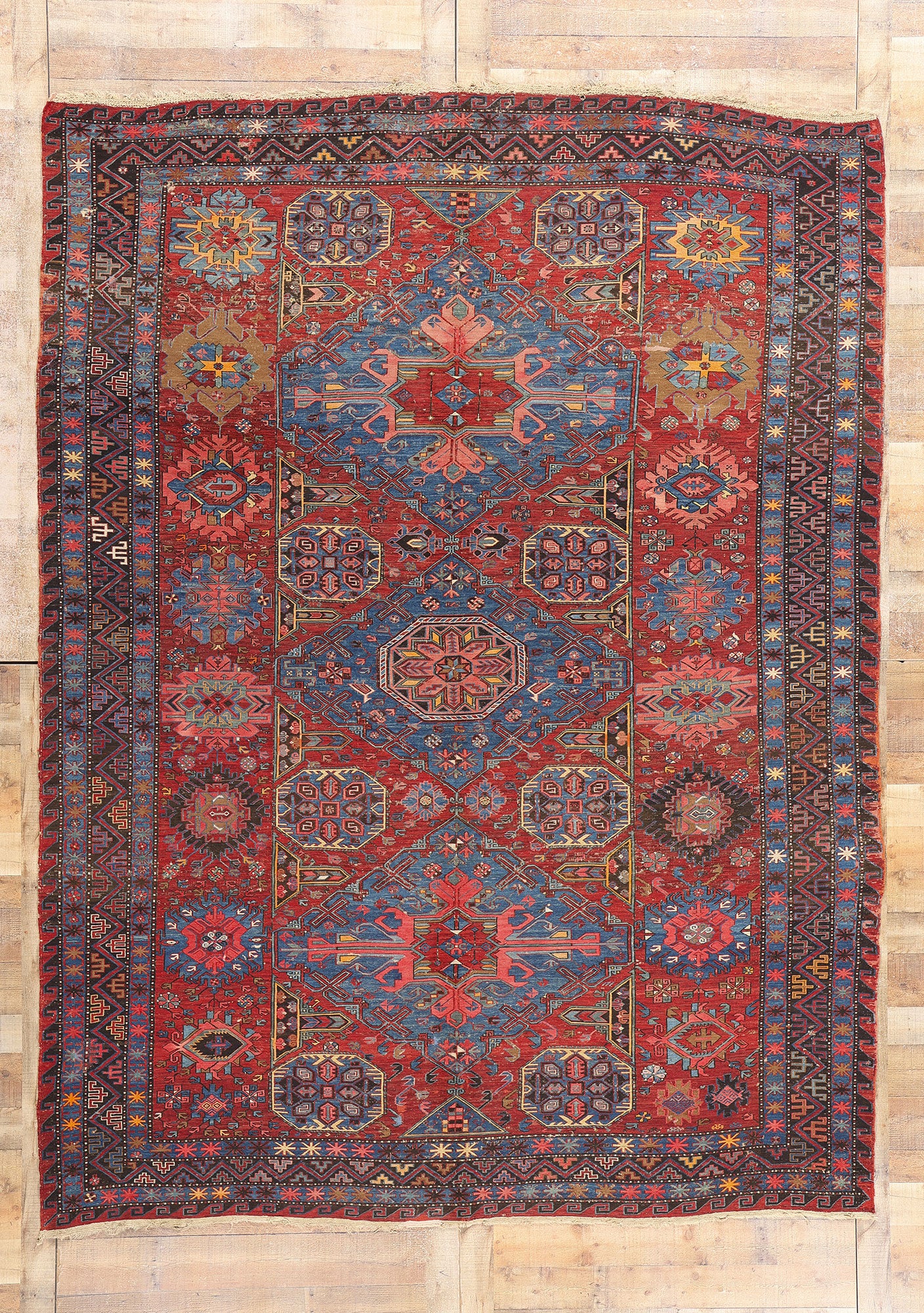 With its striking colors and nomadic charm, this rug offers a commanding presence that would anchor any room with a profound sense of history and elegance. Its intricate patterns and laid-back luxury vibe make it a versatile piece, suitable for various interior design styles, from traditional and rustic to more contemporary settings seeking a touch of relaxed refinement. This antique Soumak rug is not only a work of art but a testament to the skill of the weaver, reflecting the cultural heritage and artistic traditions of the Caucasus tribes.