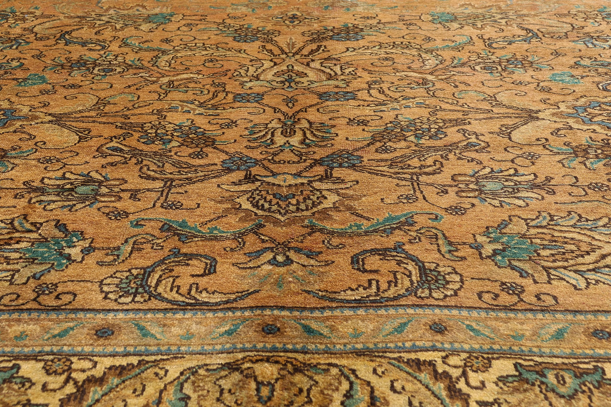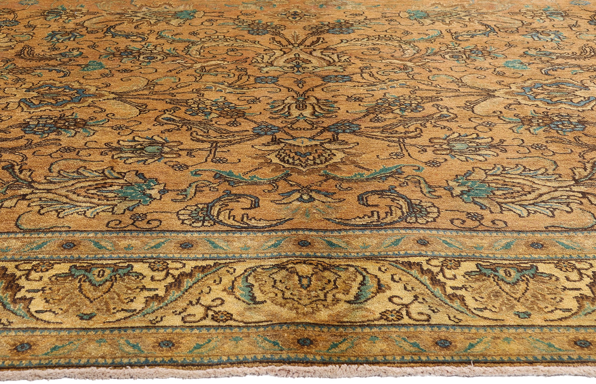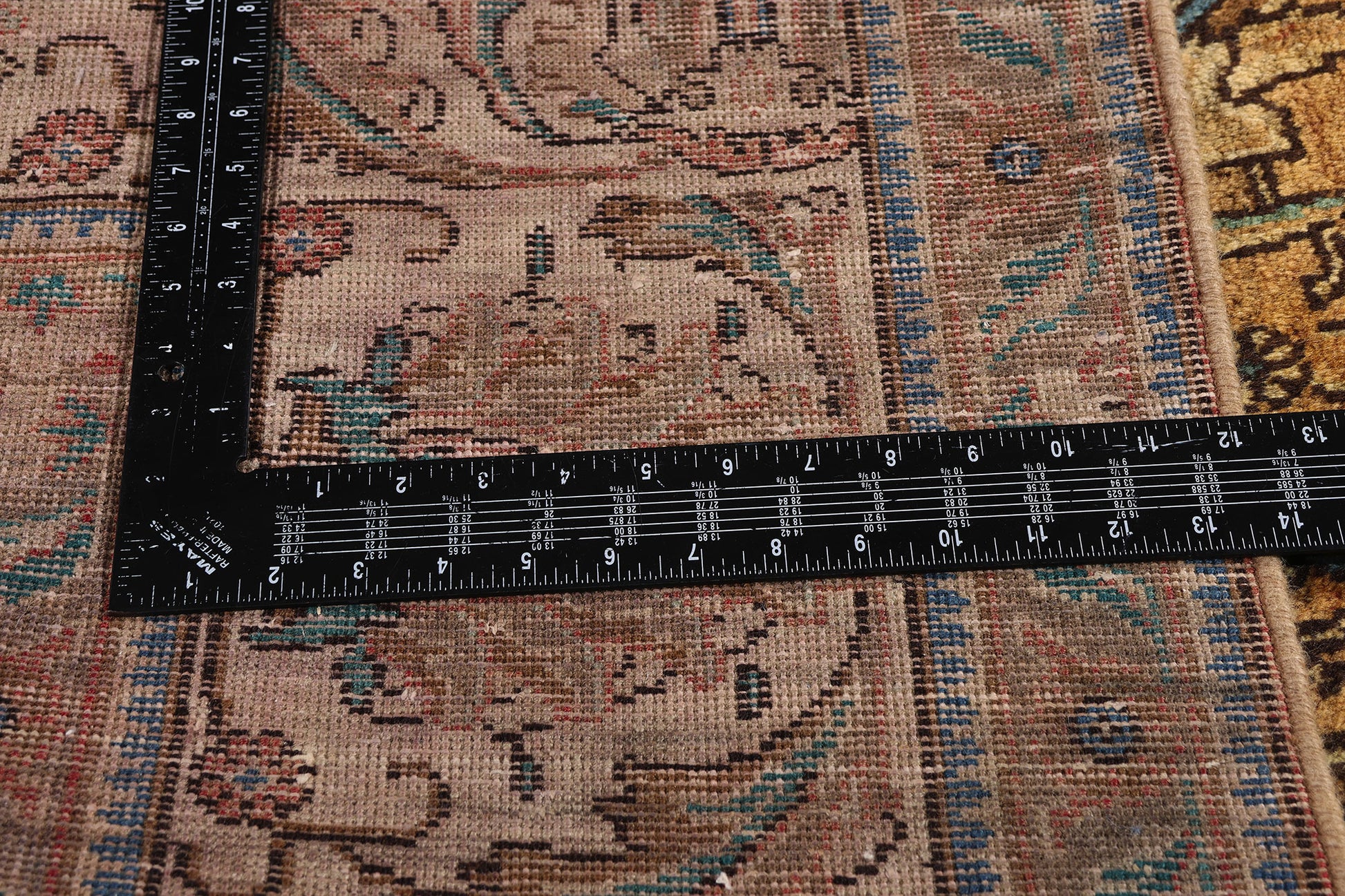 A rare vision of grandeur, this hand-knotted wool vintage Persian Tabriz rug is an exquisite artifact of living history, where artistry and legend intertwine in every motif. Woven with the precision of a master and the soul of a poet, its antique-washed golden ochre field radiates an earthy warmth touched by time. A wide natural abrash flows organically across the field like a golden current—an authentic marker of age and the handmade nature of this precious textile jewel.