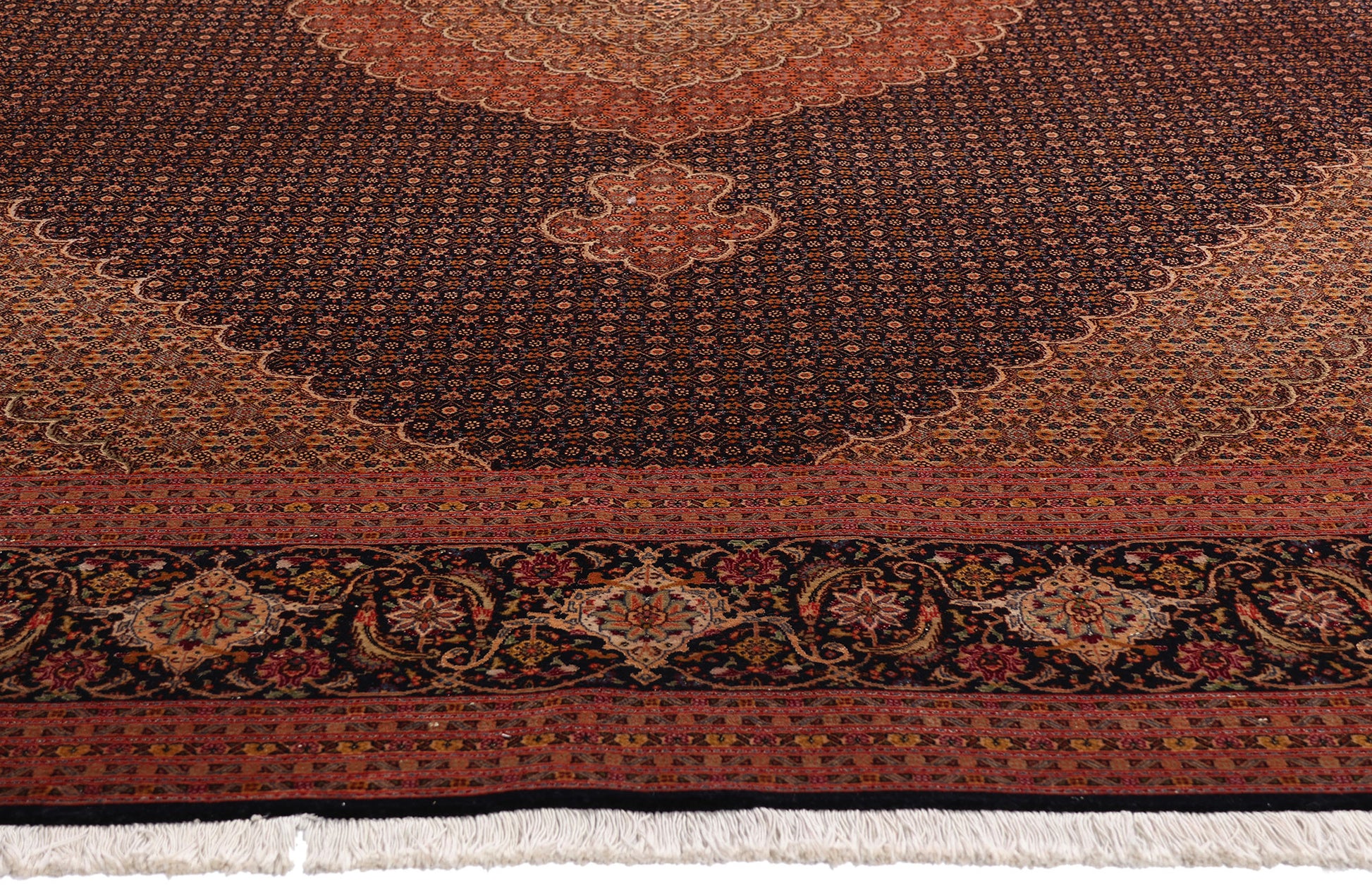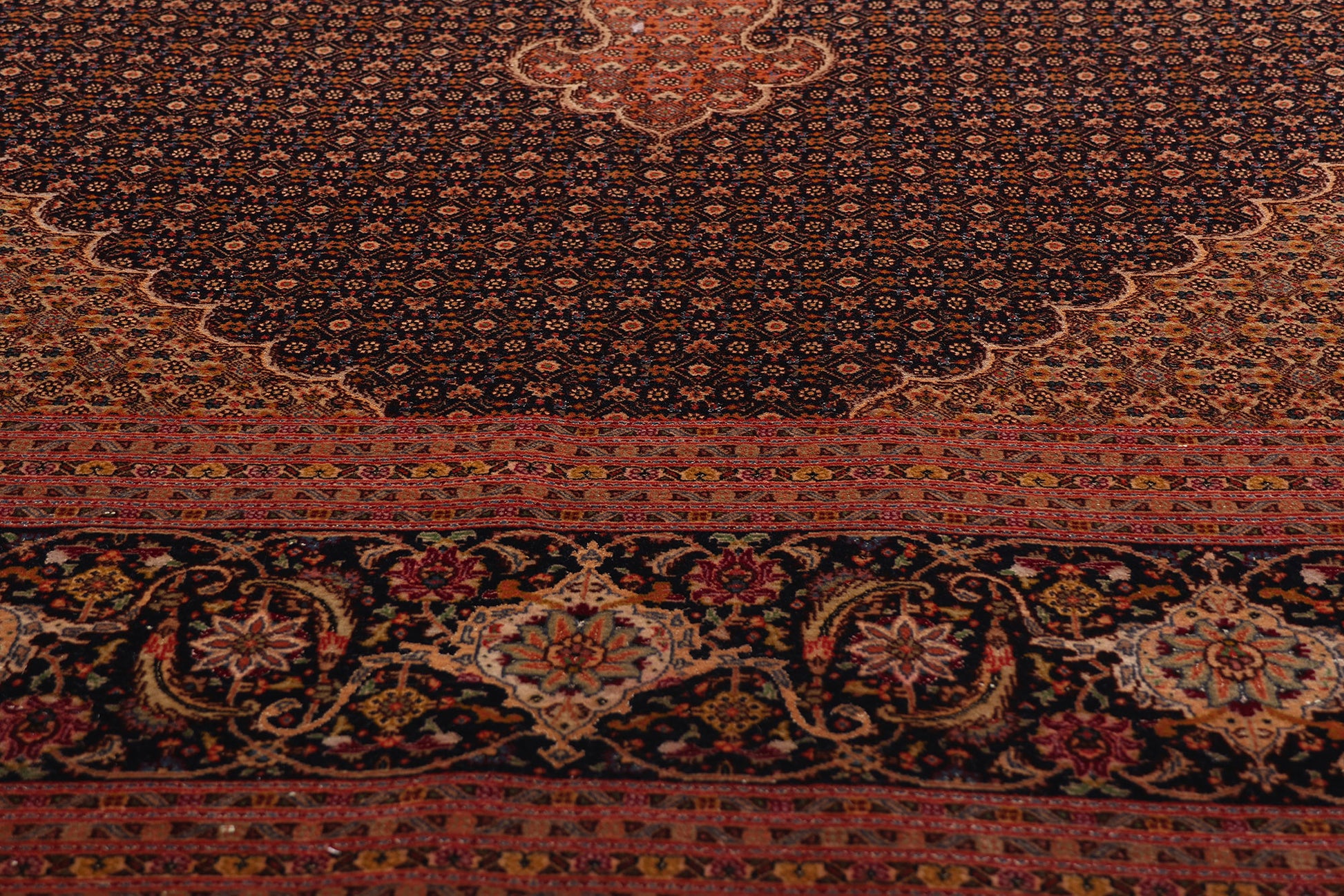 The rug’s corner spandrels mirror the medallion’s concentric structure, creating a canvas of continuity and symmetry that further elevates the piece’s aura of balance and order. Surrounding this dreamlike composition is a majestic Herati arabesque border, rendered on an elegant navy backdrop and flanked by delicate floral meander guard bands. This ornate frame is not merely decorative—it is a tribute to Persian garden symbolism, where borders define sacred space, and every flower holds meaning.