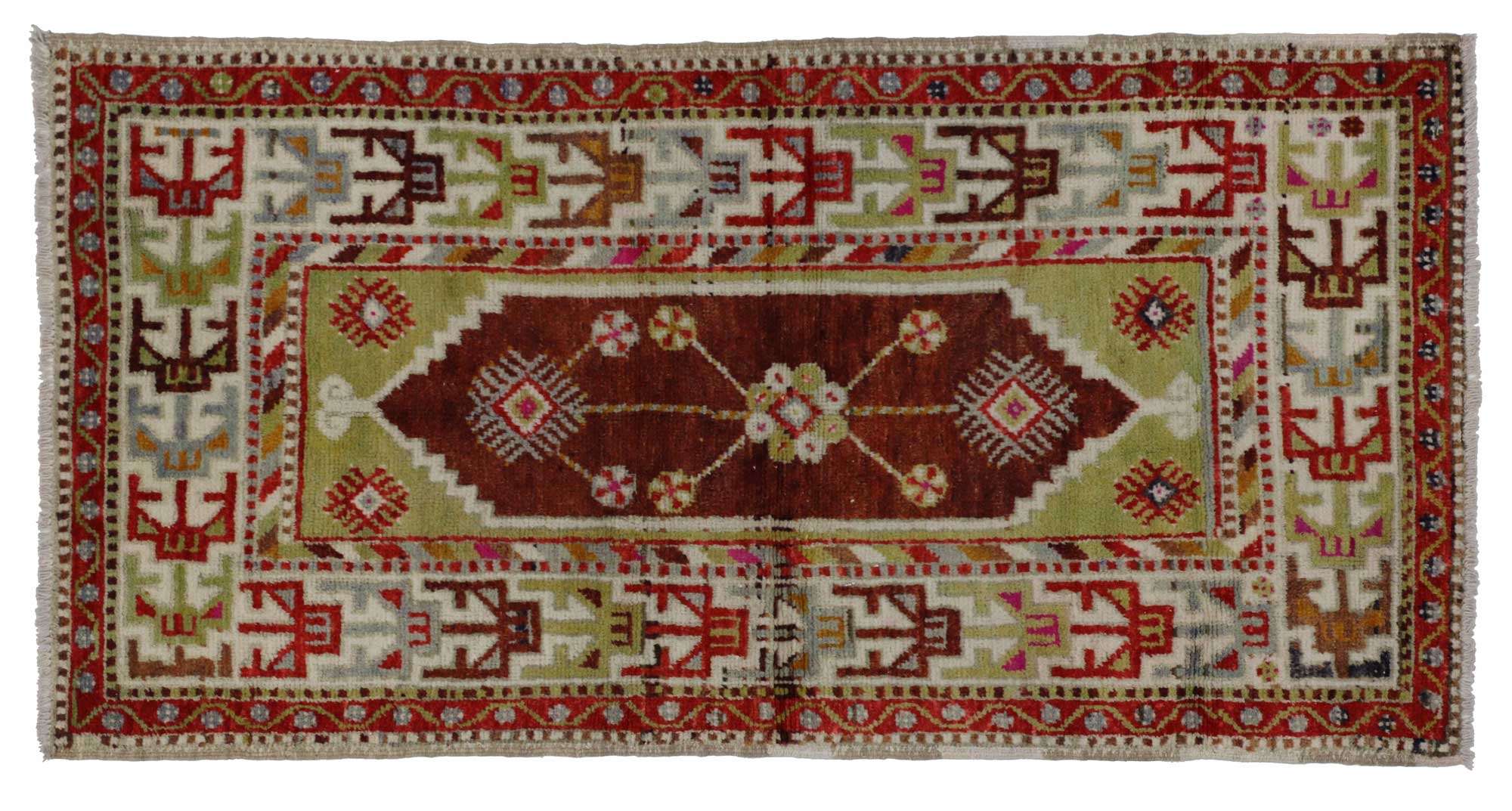 Immersed in Anatolian history and refined colors, this hand-knotted wool vintage Oushak rug combines simplicity with sophistication. The organized system of its chaotic order has been transformed into an artistic composition while the striking play of pattern and scale imbues this vintage Turkish rug with immense visual interest and graphic appeal. Rich in symbolism and cultural beliefs, this small Oushak rug will take on a curated lived-in look that feels timeless while imparting a sense of warmth and welcomed informality.