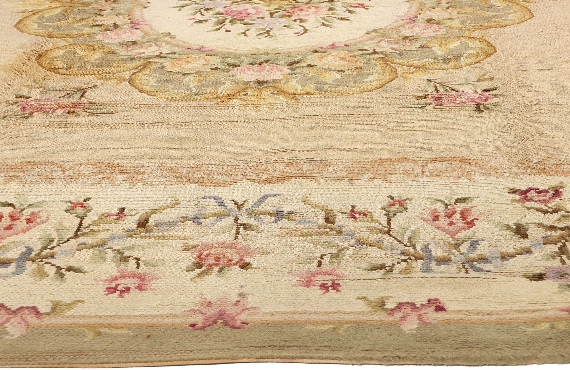 Woven in the twilight of the 19th century for the salons and royal apartments of Europe’s elite, this hand-knotted wool Spanish Savonnerie rug is an heirloom of majestic refinement. Its exceptional composition echoes the splendor of royal commissions, where noble patronage demanded artistry of the highest order. At the center, an extraordinary scalloped medallion blossoms with a lush bouquet of roses—an ode to the Rococo’s devotion to sensuous florals and ornamental grace. The parchment ground is softened by age into a gentle, velvety tone, the kind of patina only time can grant to pieces of true pedigree.