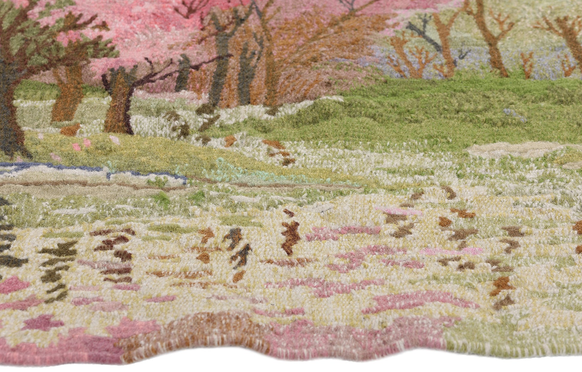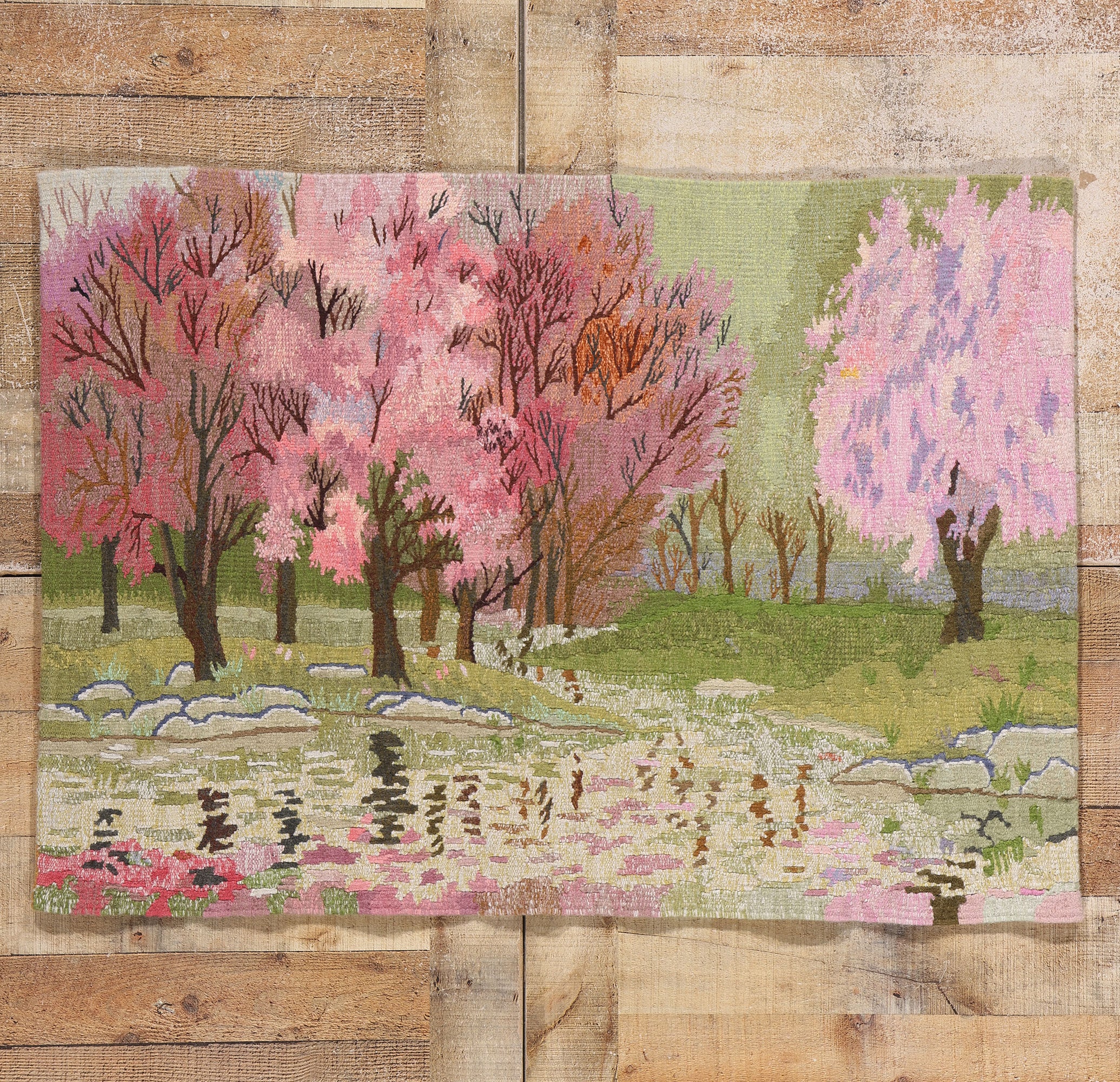 This enchanting handwoven wool tapestry by Mother's Commerce Company captures the serenity and ephemeral beauty of a landscape adorned with blooming cherry blossom trees. The artistry evokes the fleeting nature of spring, rendered in delicate shades of pink, lilac, and soft green that ripple across the scene with a dreamlike quality. Each tree is skillfully woven with attention to the organic irregularities of its branches, standing against a lush meadow scattered with stone elements and reflective water pools that shimmer with hints of blush and gold.