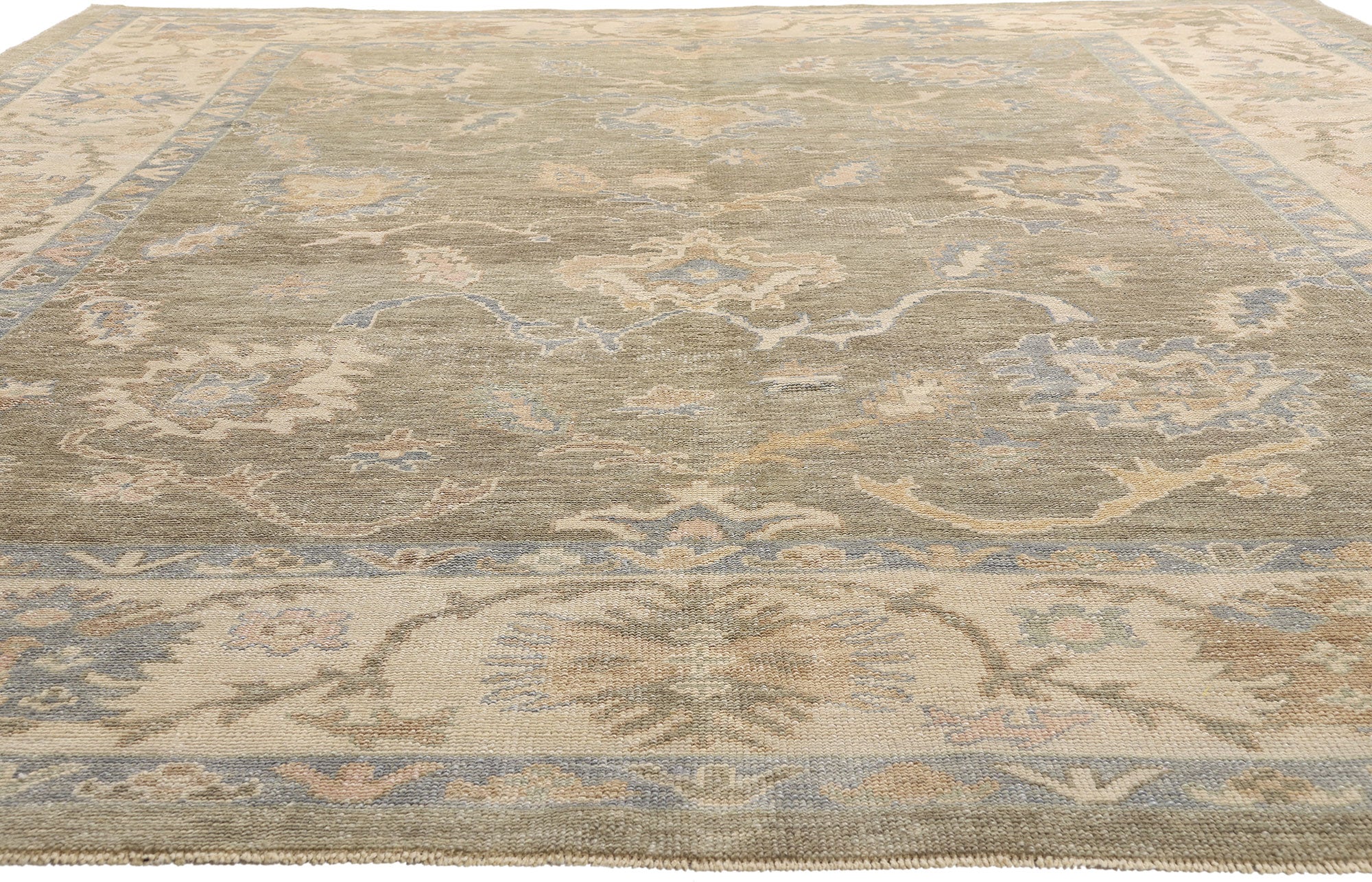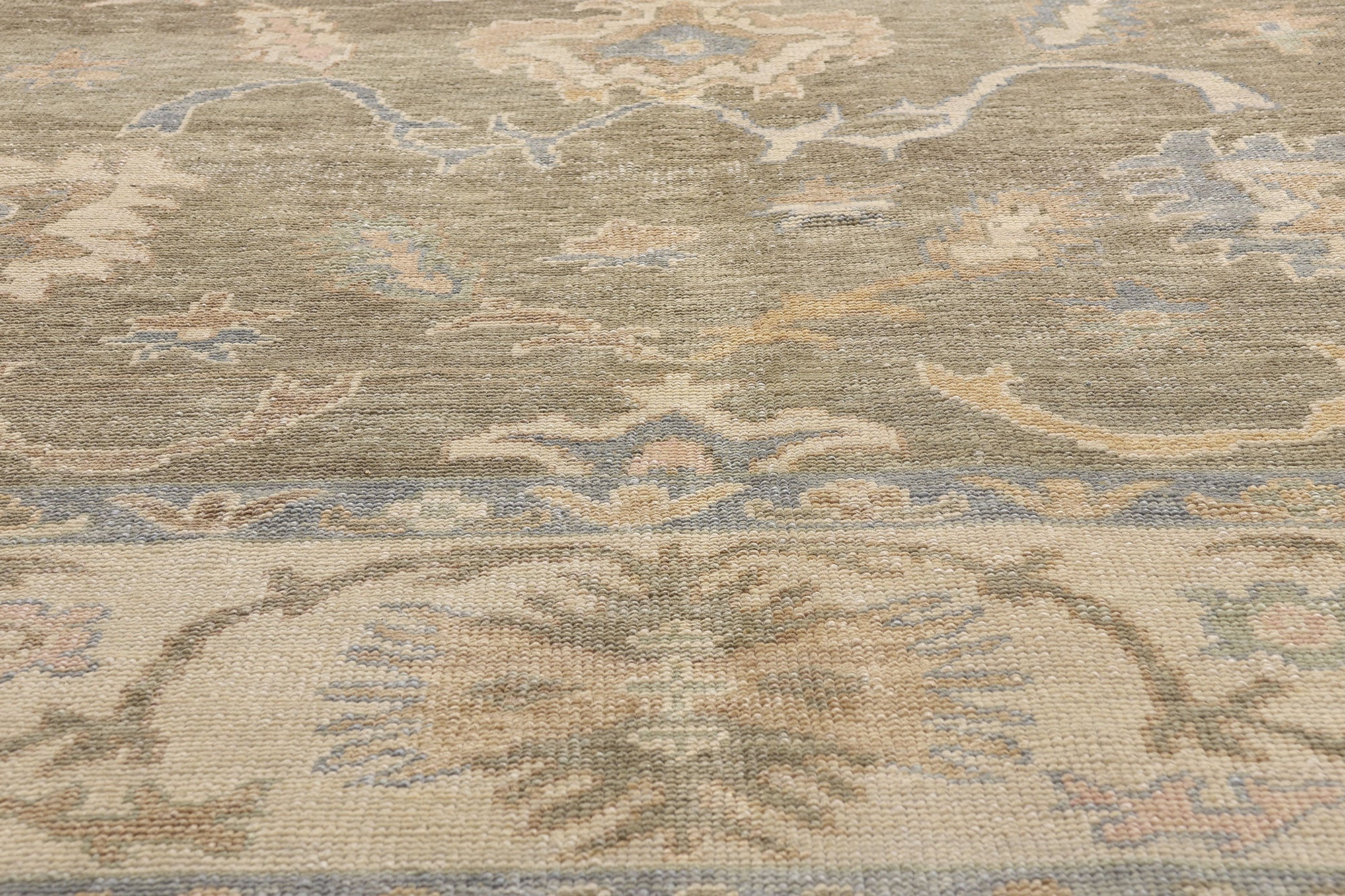From the historic weaving ateliers of Anatolia emerges this hand-knotted wool modern Turkish Oushak rug, a serene composition that transcends fashion and time. Its presence is one of hushed grandeur—elegance expressed through understatement rather than ornament. The earth-toned field breathes warmth and quiet sophistication, evoking the natural harmony of sunlit stone and aged timber. This is not a rug that shouts for attention; it commands it softly, through balance, proportion, and the tactile poetry of its weave.