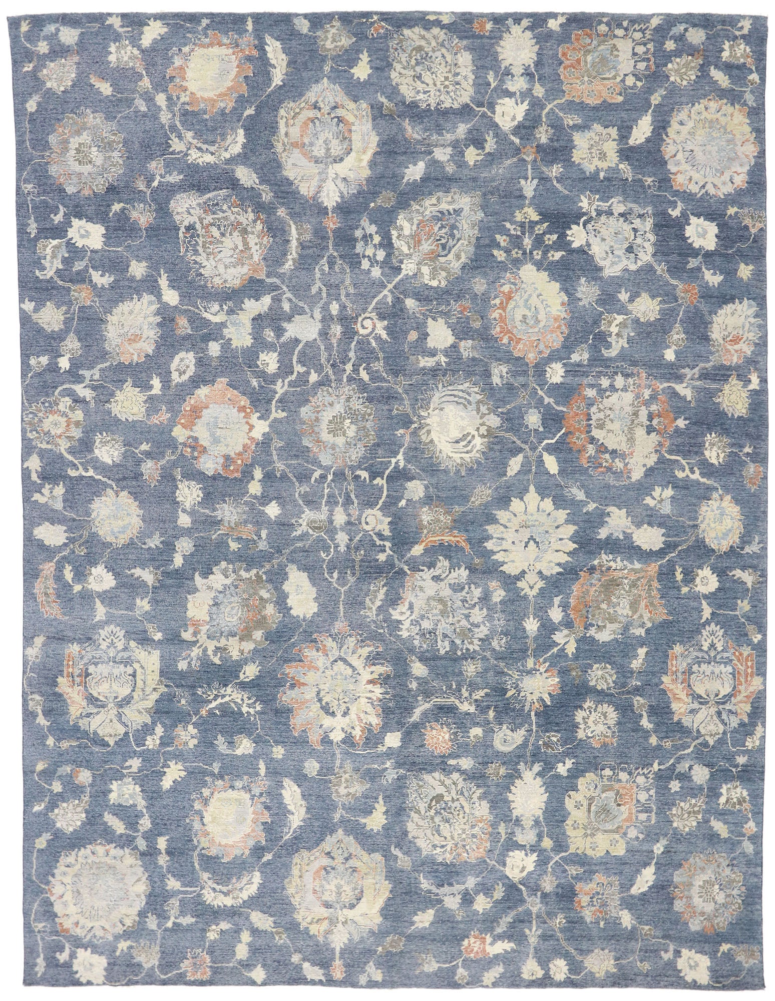 This hand-knotted wool vintage-style Oushak rug features an all-over floral pattern spread across an abrashed field. An array of botanical motifs decorates the field in an elegant display of large palmettes, vines, rosettes, florets, lanceolate leaves, and curling tendrils. The lustrous color palette centered on soothing blues and creamy neutrals with touches of soft orange accents is tranquil and sophisticated. In some areas, there is also the effect of natural wear and tear in an erased design, as if the paint has chipped away from the main pattern to a fashionable, rustic effect. In fact this rug is brand new and the pile here was shaven to blend in beautifully, adding interest and character. With its timeless design, versatile color palette, and delicate floral detailing, this elegant contemporary Oushak-style rug would be a wonderful addition in any interior, especially a seaside home decorated with modern furniture.