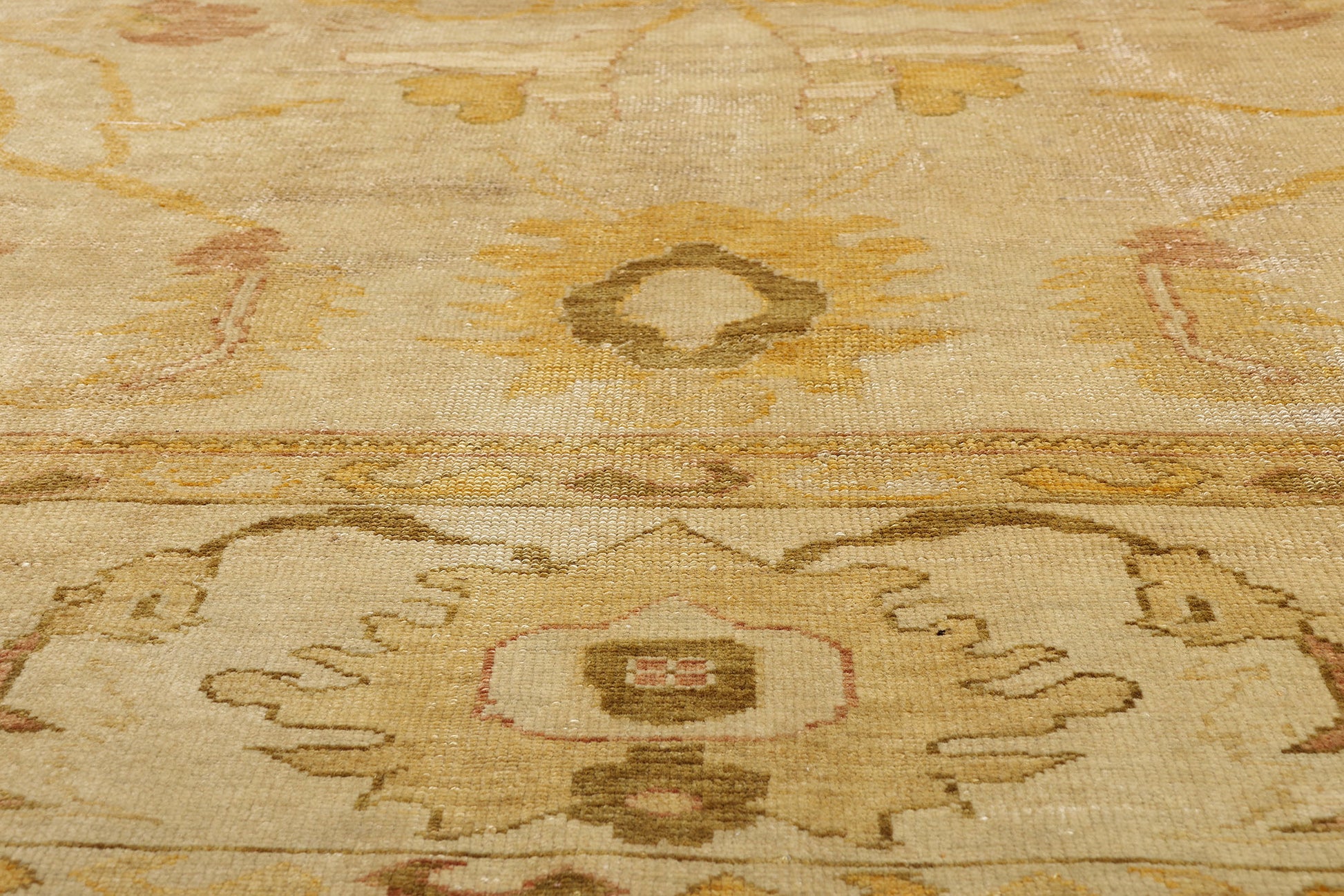 Encasing this stunning Turkish Oushak rug, a refined border establishes an architectural frame, where repeating palmettes and stylized floral elements echo the motifs within. This enclosure introduces rhythm and order, guiding the eye with quiet precision while reinforcing themes of protection and continuity. Guard bands provide a final sense of balance, completing a composition that speaks to cultivated taste. In a distinguished interior, this extraordinary masterpiece becomes more than a decorative element—it becomes a signature of discernment, a rare expression of heritage, and a lasting emblem of elevated living.