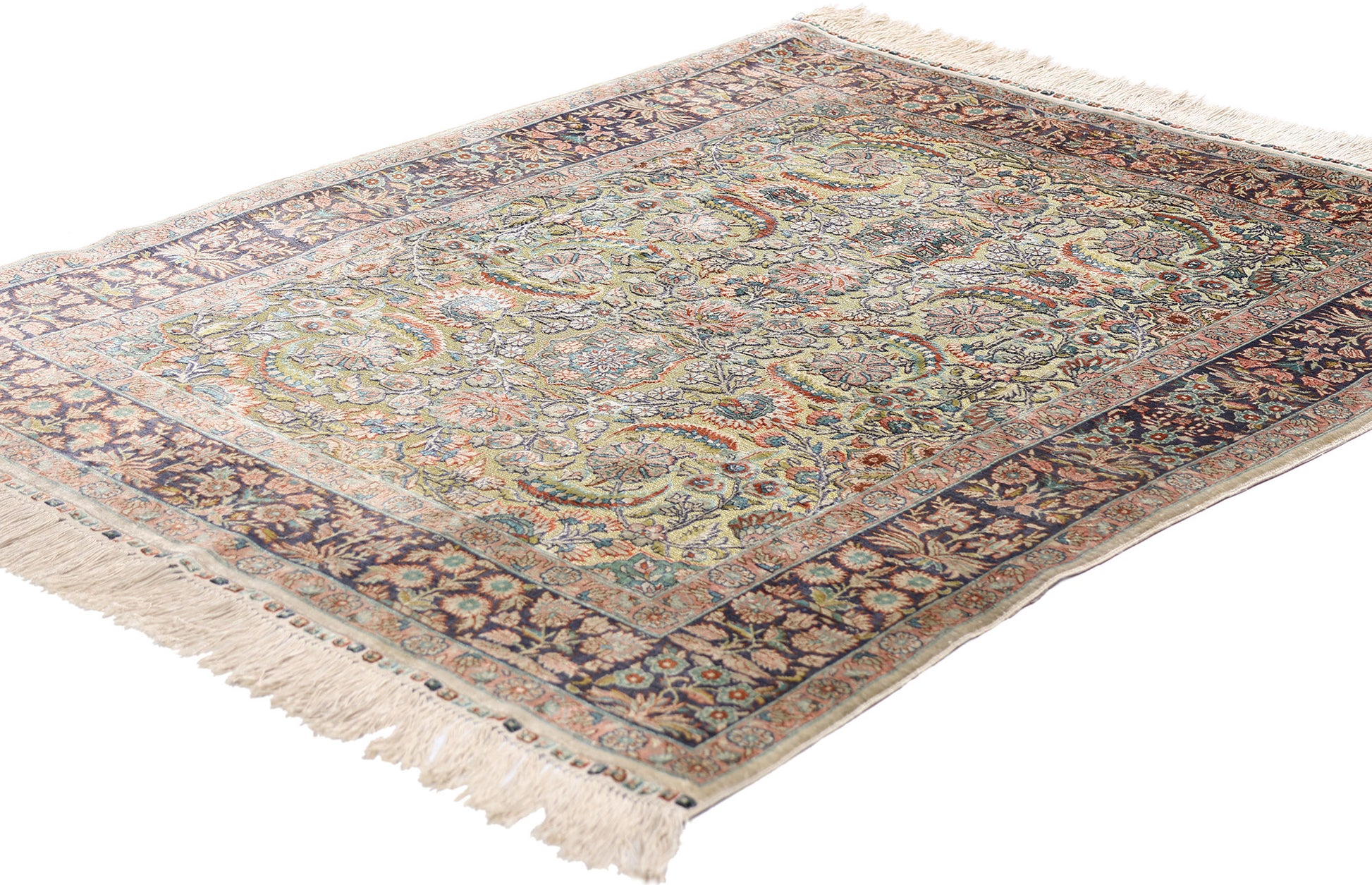 Radiating with the opulence of imperial craftsmanship, this hand knotted vintage Turkish silk Hereke rug is a lyrical celebration of botanical elegance and Ottoman-era refinement. Woven from the finest silk, it possesses a natural luminosity that enlivens each thread with a subtle glow, transforming its surface into a living tableau of art and light. The precious composition is defined by an allover botanical design—an intricate choreography of palmettes, rosettes, and spiraling vines—each motif mirrored with poetic symmetry across a soft celadon ground. As your gaze moves across the captivating field, it encounters a hypnotic rhythm where structure and spontaneity entwine, echoing the precision of classical music and the grace of garden fountains.